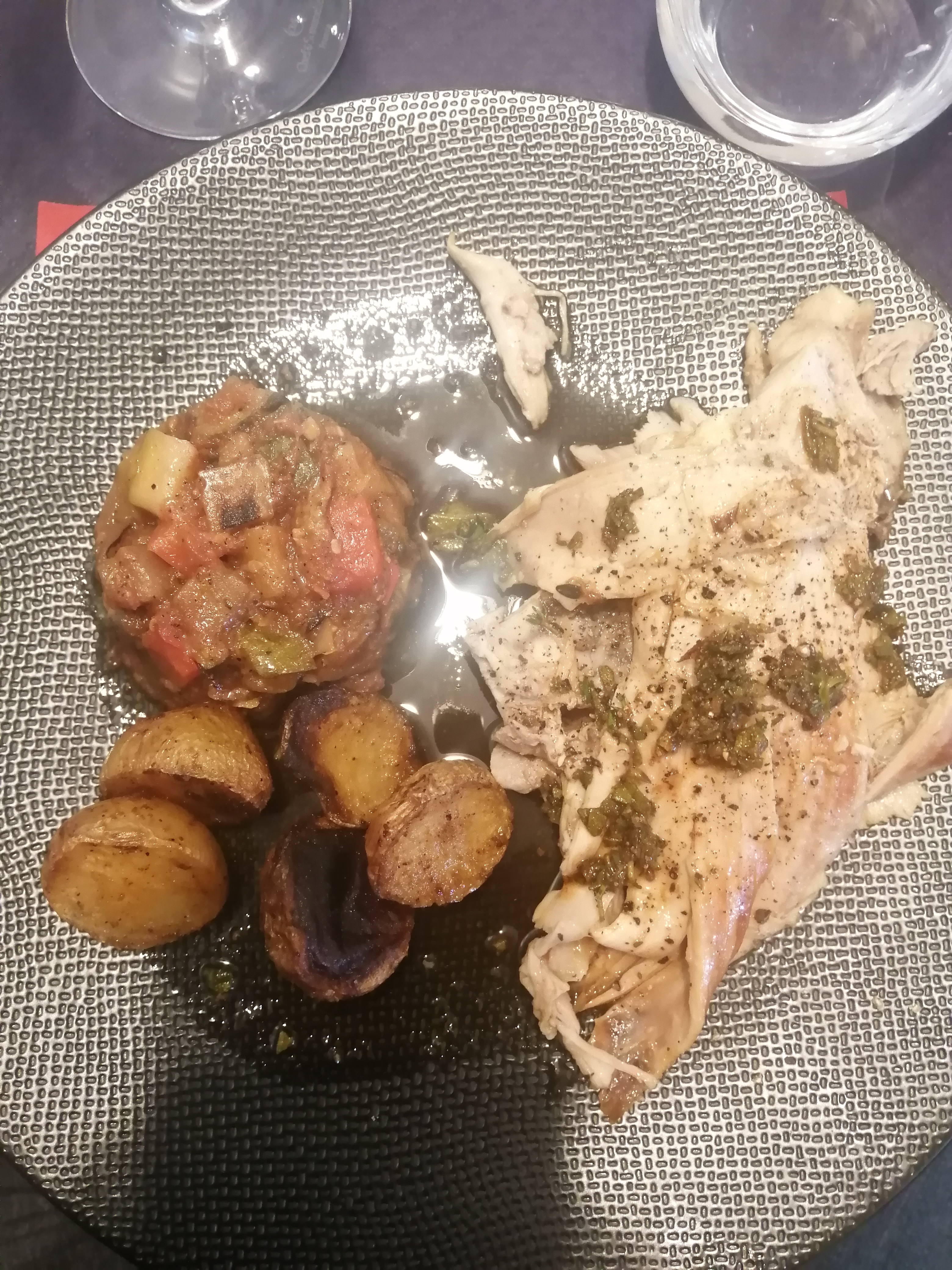 Repas entre amis 18 prs. Dommage qu'il n'y a pas une musique de fond. Le plat principal était (a mon goût ) un peu trop salé. (Agneau braisé avec son gratin dauphinois. )