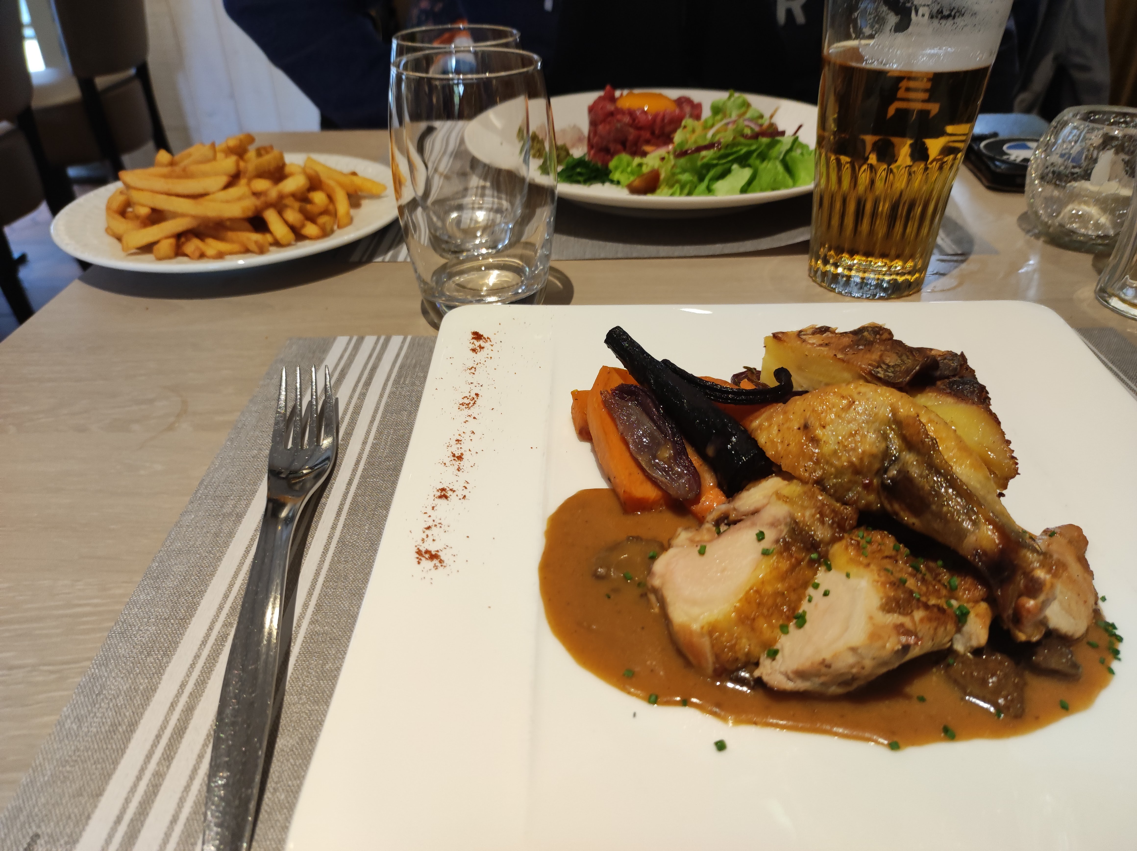 Accueil parfait, restaurant haut (voire très haut) de gamme, cuisine subtile, plats variés et équilibrés , service irréprochable.. Ne cherchez pas les frites, il n'y a pas de friteuse.