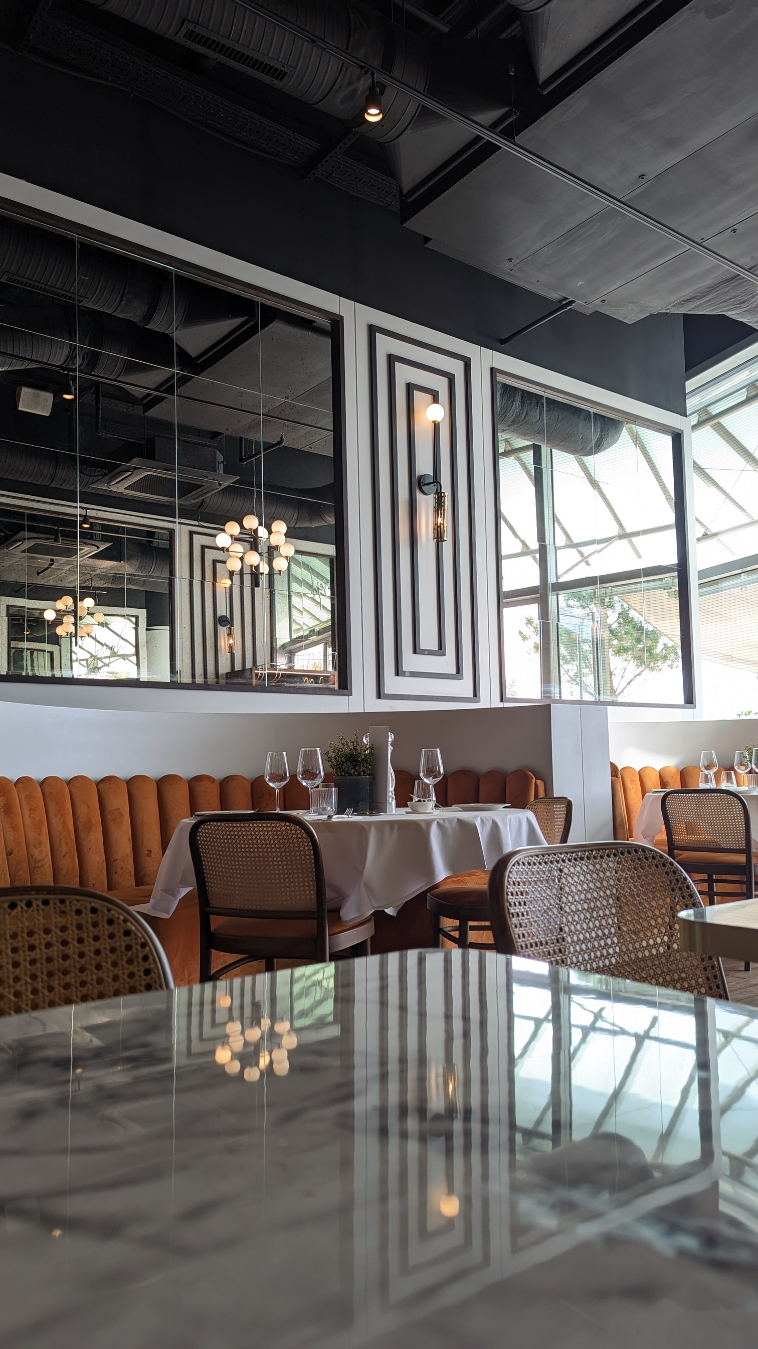 Tout était parfait. Des plats qui sortent un peu de l’ordinaire, du bon vin , une atmosphère parfaite. Un service ultra rapide, éclair il n’y a pas d’autre mot c’est la première fois que je n’attends pas un plat dans un restaurant. La décoration est magnifique , le choix de la musique moderne, le Volume parfaitement dosé. Les serveurs sont discrets et toujours la si besoin . Parfait Prix un peu élevé pour les desserts et pour les plats. Mais ça vaut le détour, ce n’est pas un restaurant comme les autres .
