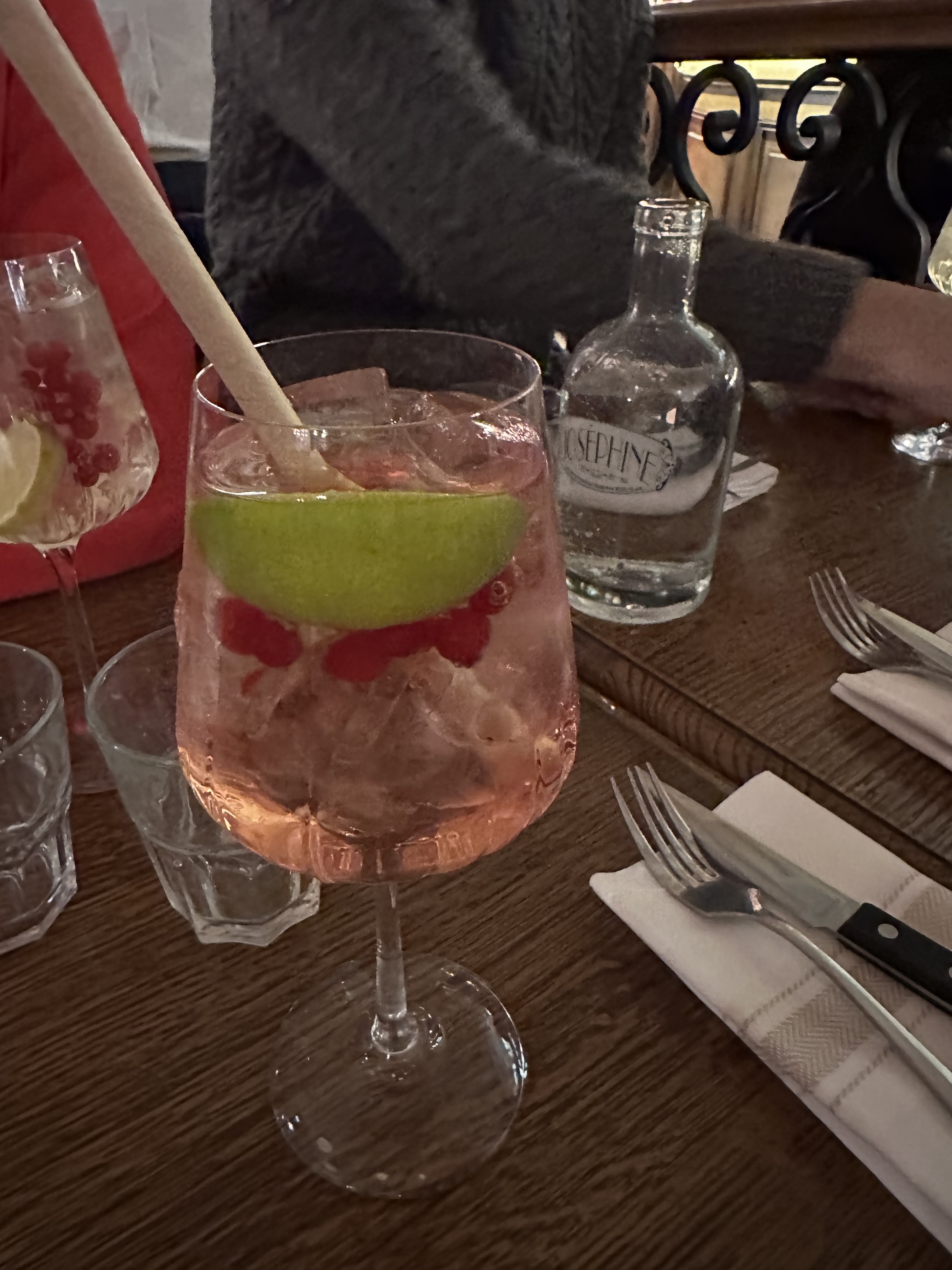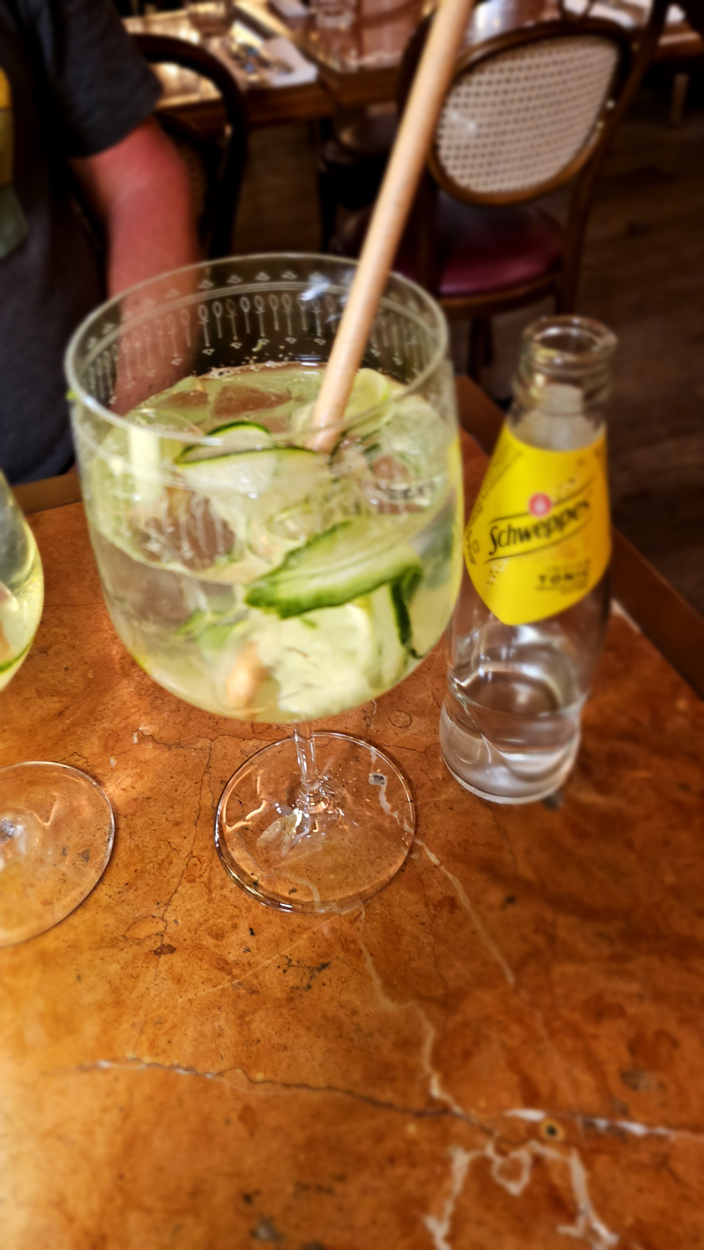 *** la photo du gin tonic à droite est de Rose du Pont tout comme la photo intérieure. Celui de gauche de Joséphine. Notre soirée a commencé avec un gin tonic qui était pathétique. tonique plat. la salade n'avait aucun goût et le service faisait défaut. Voyons comment se déroule le tatare de bœuf mais jusqu'à présent pas impressionné ! ÉVITER!!! La salade n'avait aucun goût et tout le monde autour de moi ne l'a pas finie non plus. Le tatare de bœuf était servi avec un morceau de pain grillé à moitié brûlé et quand j'en ai demandé plus, on m'a dit qu'il était impossible d'en obtenir plus car cela prendrait 10 minutes. trop long à attendre en mangeant de la viande crue. . ÉVITER ÉVITER ÉVITER !!! J'AI TRAVAILLÉ DANS L'INDUSTRIE ALIMENTAIRE ET ILS NE SAVENT PAS COMMENT RÉPONDRE À LA DEMANDE.
