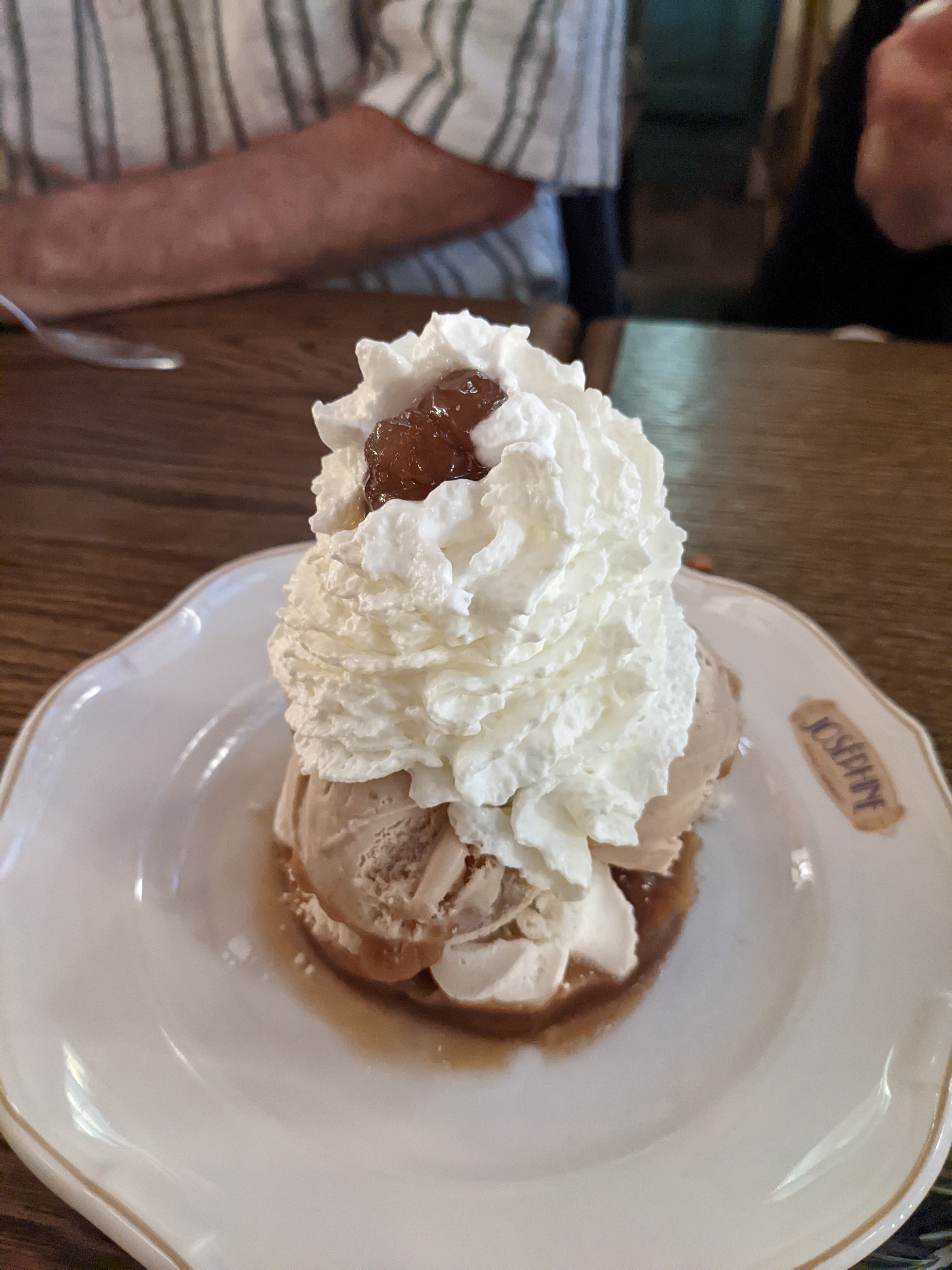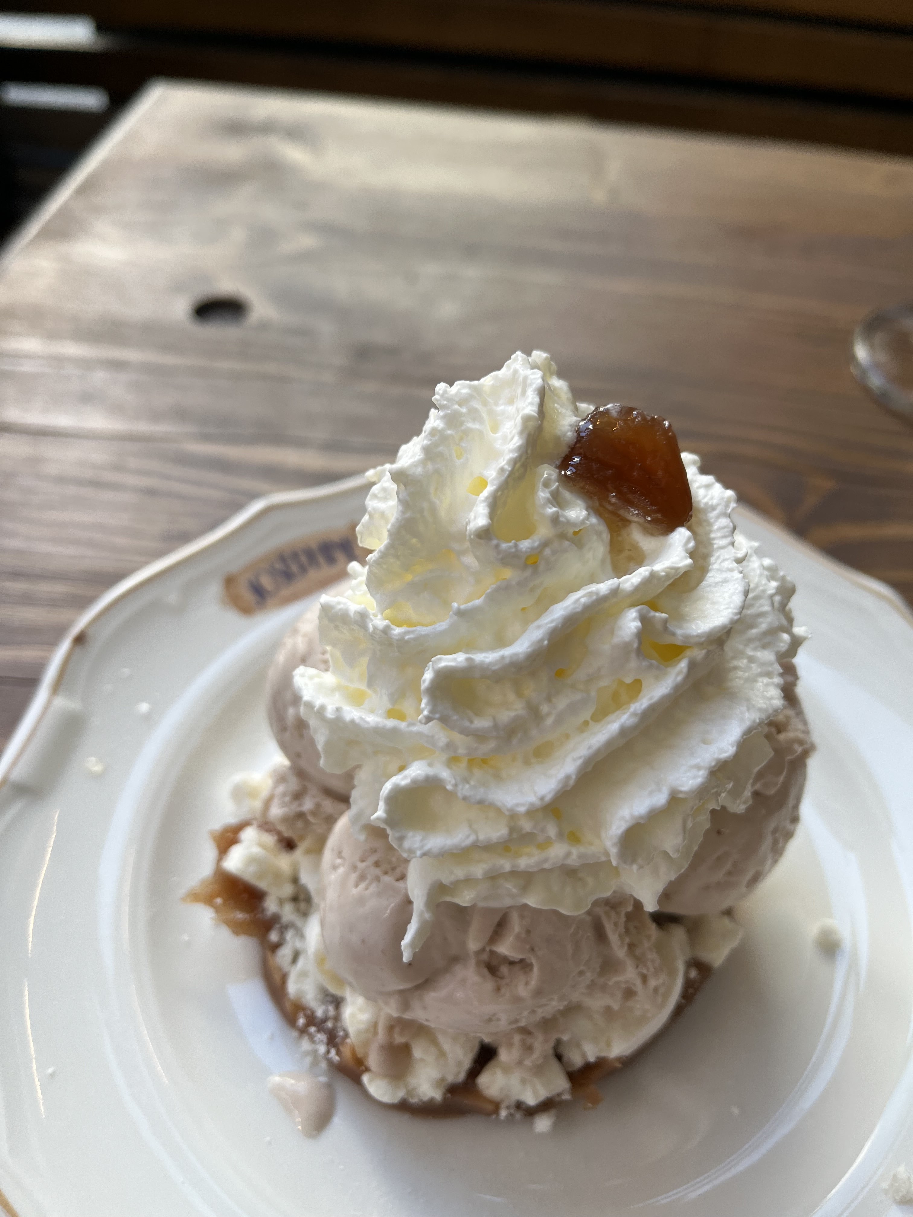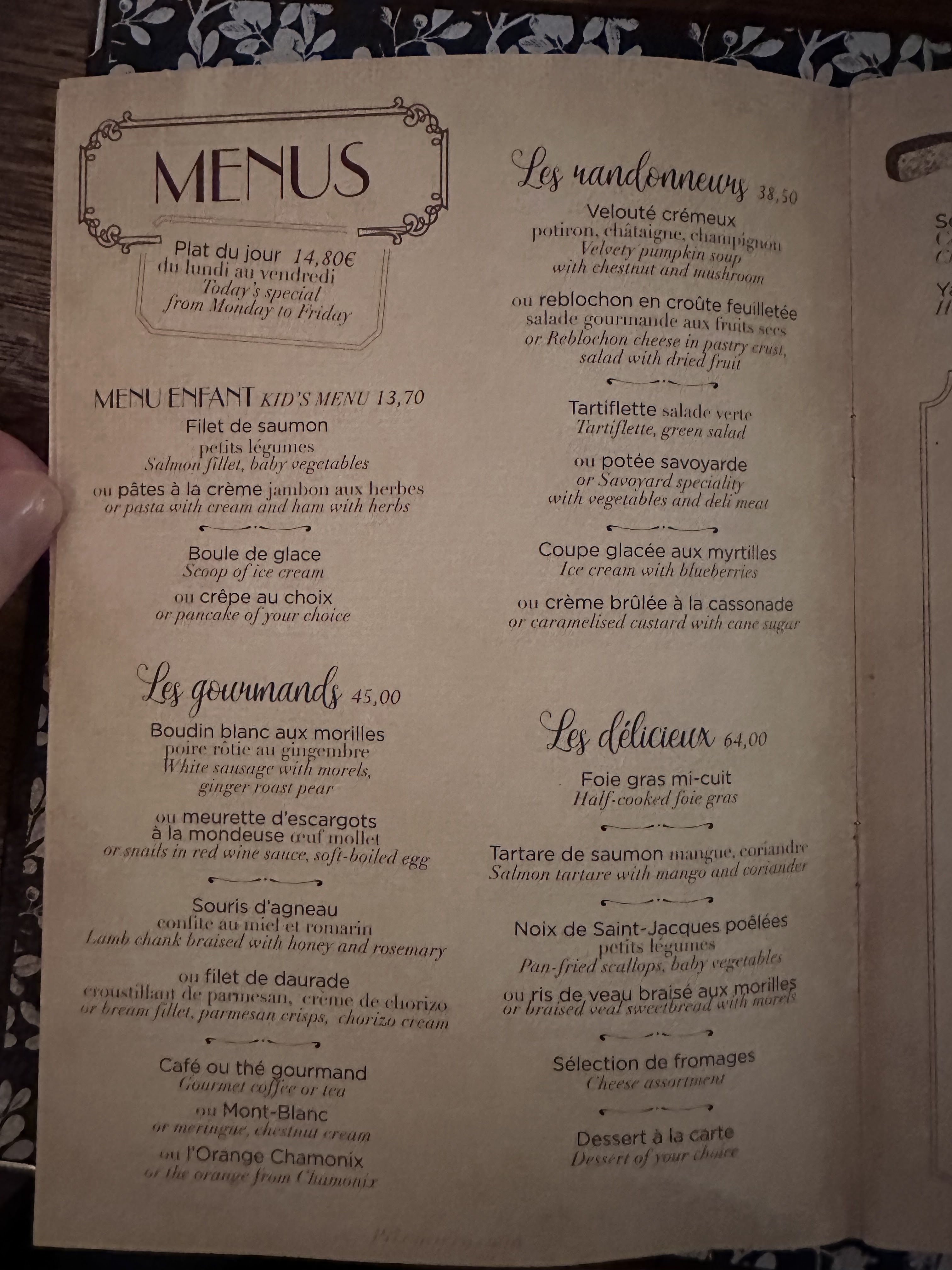 L’endroit au centre de Chamonix, terrasse très spacieuse, carte immense (qui m’a fait un peu peur- je me suis dit c’est vraiment un restaurant pour les touristes)- nous sommes venus entre deux repas - pour un dessert - crème brûlée vraiment bon! Côté service - assez « parisien », stressé mais c’est compréhensible vu le nombre de personnes qui passent! Un bon moment