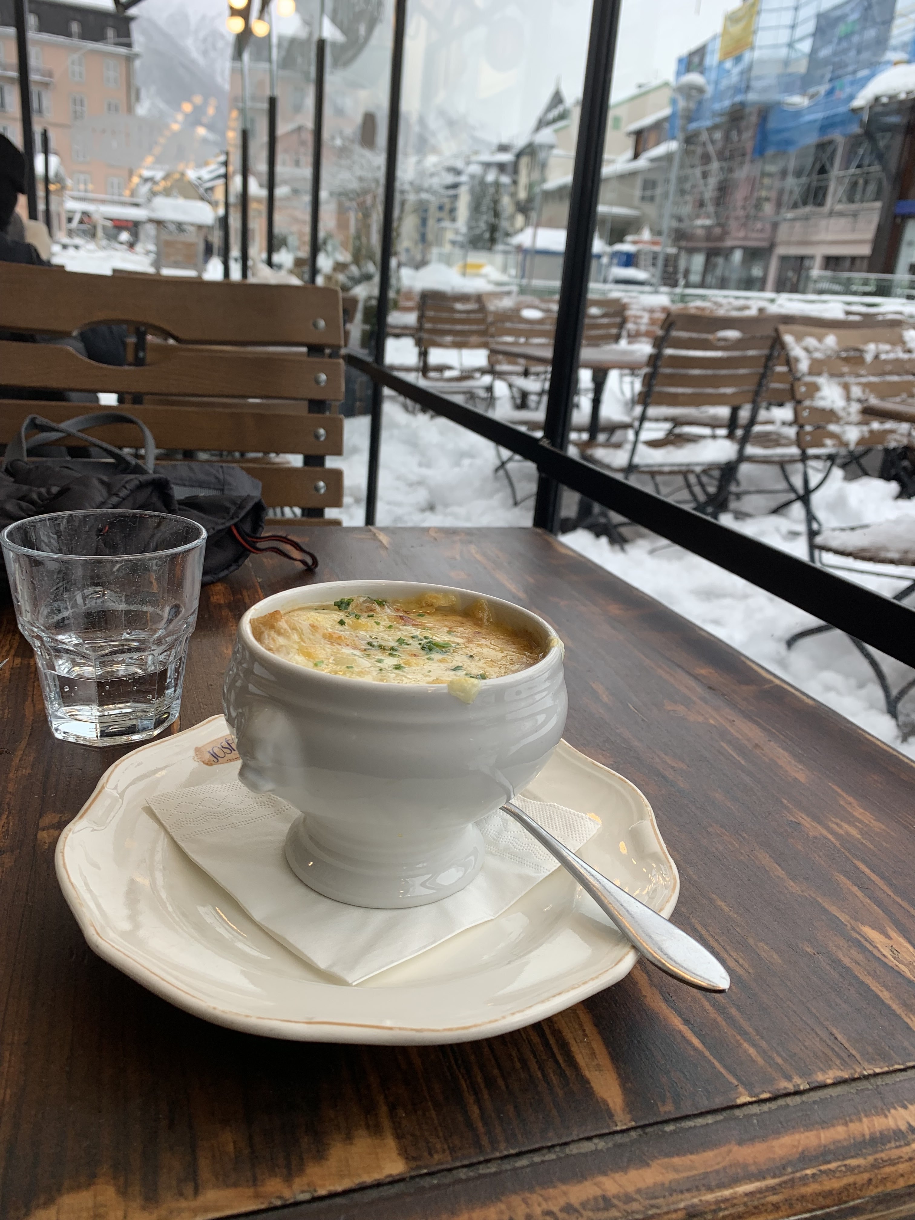 Soupe a l’oignon qui manquait de caractère et tiède. Plus de 7€ pour 75ml d’eau c’est un peu excessif.