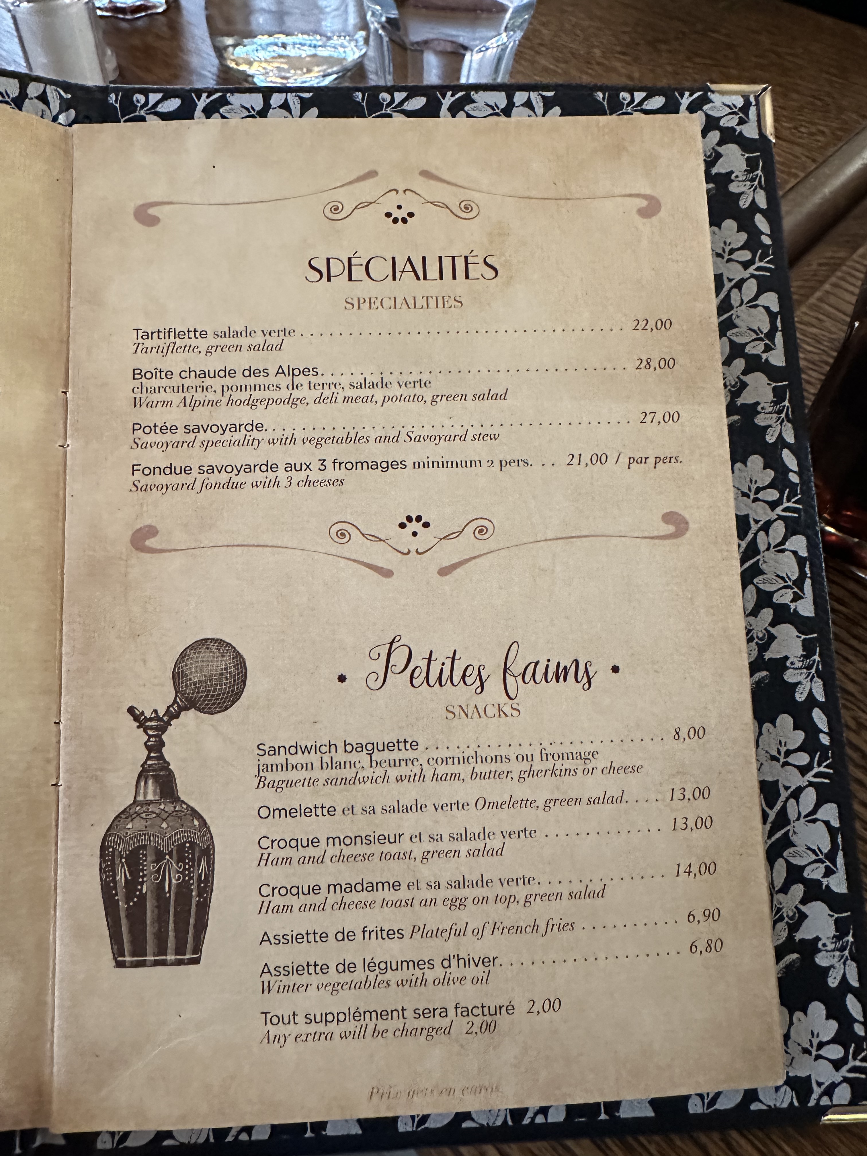 Super soupe à l'oignon, savoureuse tartiflette, belle omelette. Les assiettes apportent de la salade et des légumes verts, alors soyez prudent car vous commanderez trop de nourriture. Attention des serveurs