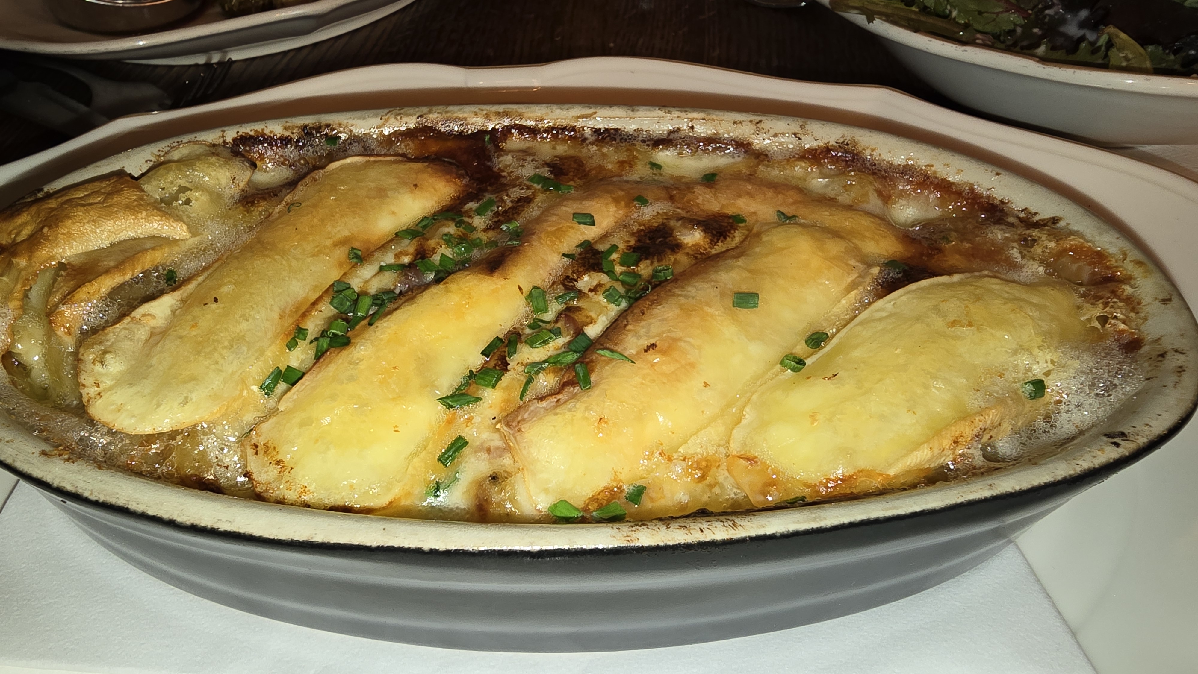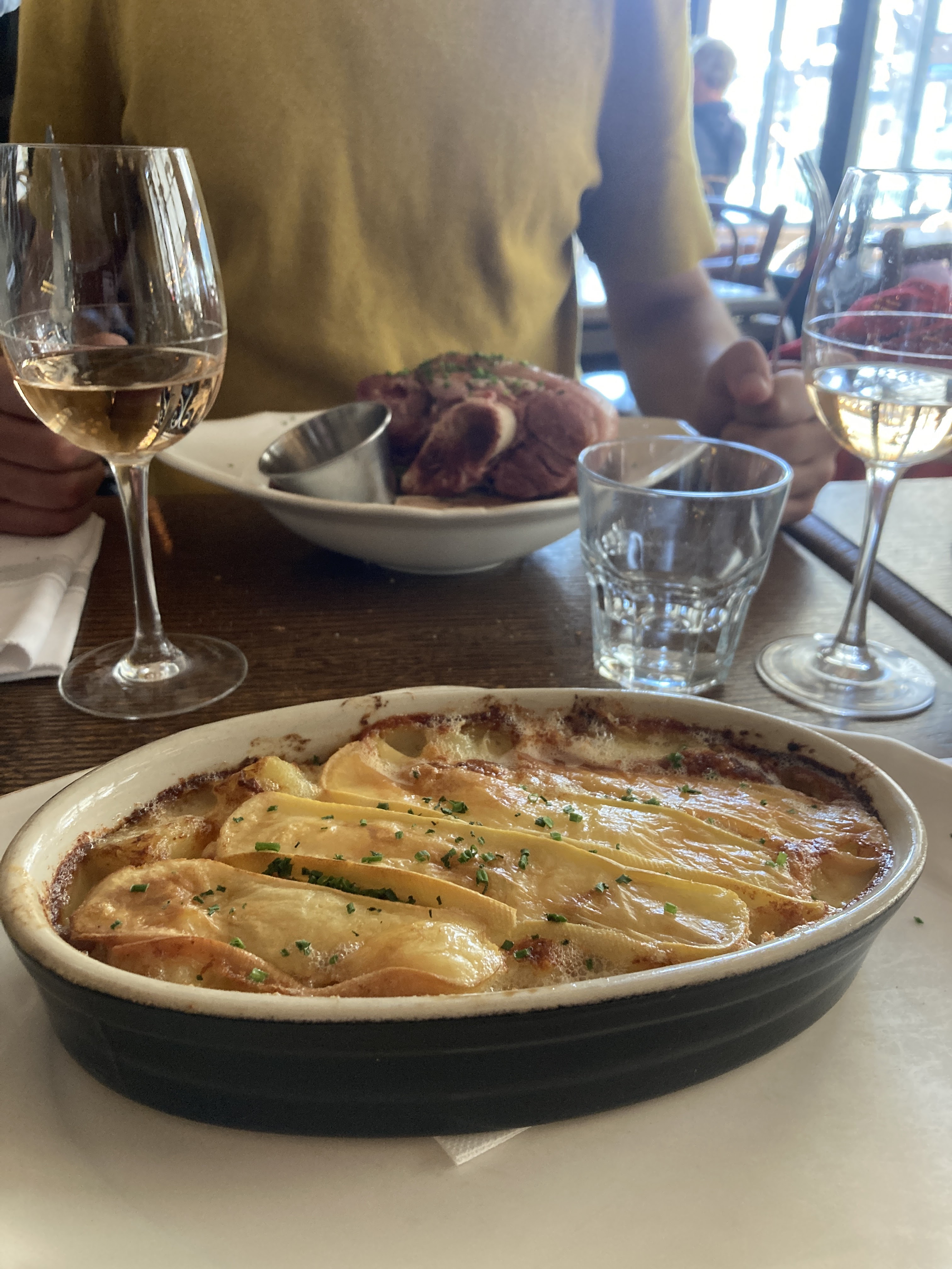 Quel merveilleux restaurant pour terminer une visite à Chamonix ! Chaleureux et accueillant, avec un grand intérieur à l'ancienne et beaucoup d'espace dans le patio fermé, où nous nous sommes assis dans des chaises confortables et rembourrées et avons admiré les skieurs et les touristes qui passaient. Les classiques sont tous exposés ici : escargots au pesto éclatant, huîtres, soupe à l'oignon, foie gras... la liste est longue. J'ai apprécié la tartiflette, spécialité de la région : un bon reblochon épais et fondant enrobant un tas de pommes de terre et de lardons mélangés à de l'oignon, tout simplement délicieux. De nombreux vins de valeur parsèment la longue liste. Les serveurs faisaient leur tournée avec efficacité et chaleur, et même si mes compagnons parlaient français, les serveurs étaient également bien en anglais. Nous avons mangé jusqu'à l'arrêt, avec une bouteille de Mouton-Cadet Bordeaux, pour une teinte supérieure à 50 CHF par personne. Un de nos plats préférés du voyage !