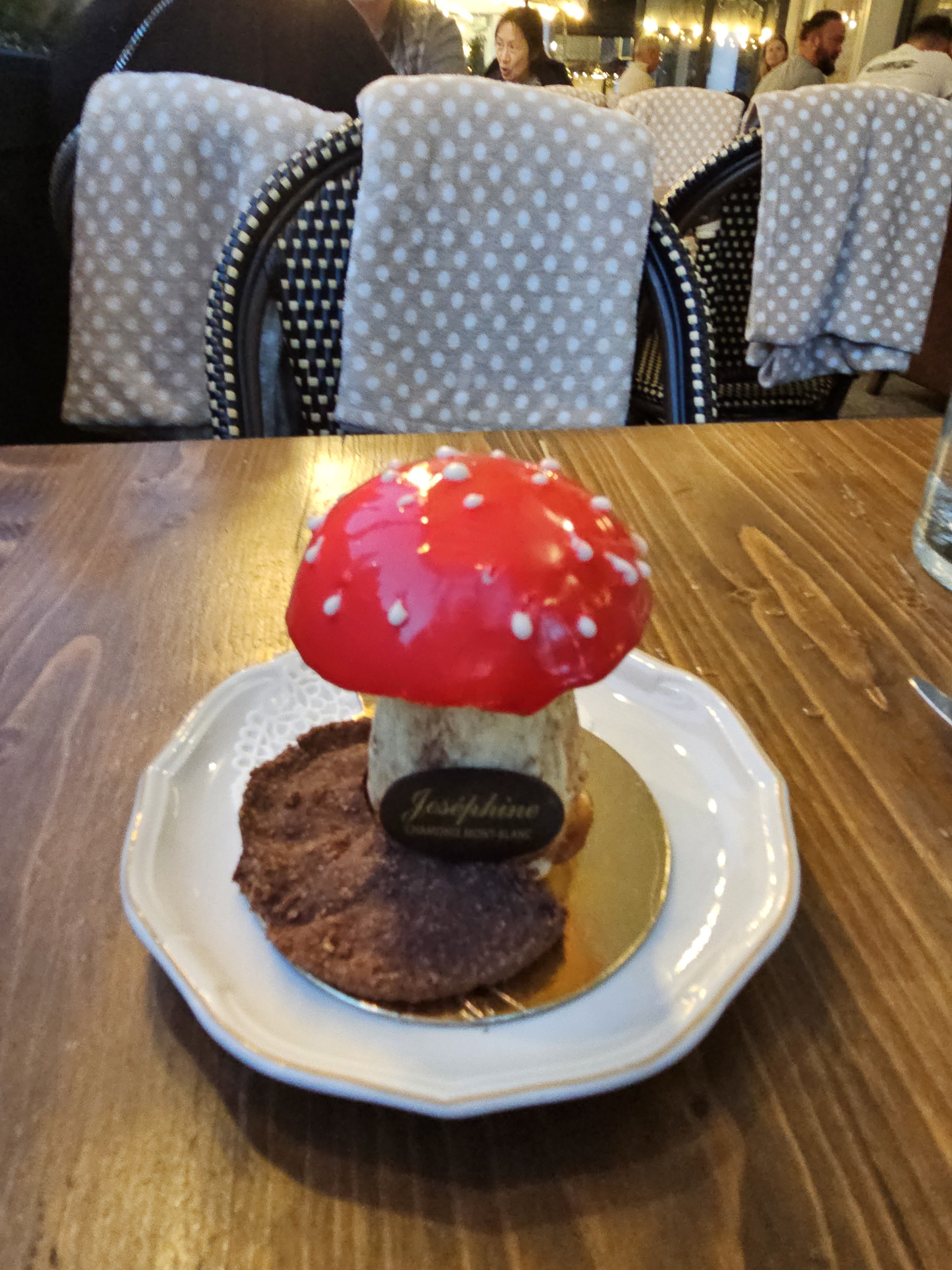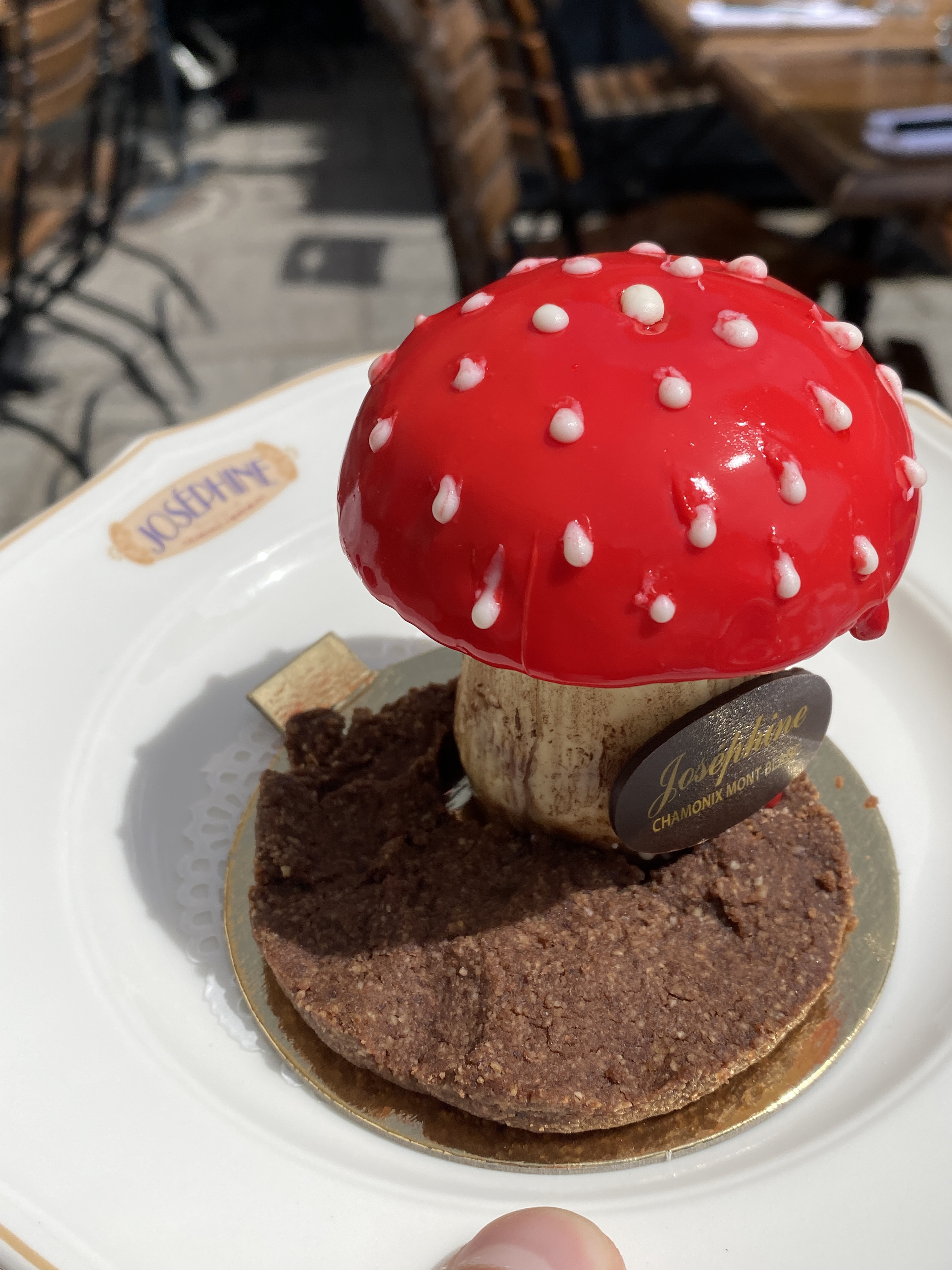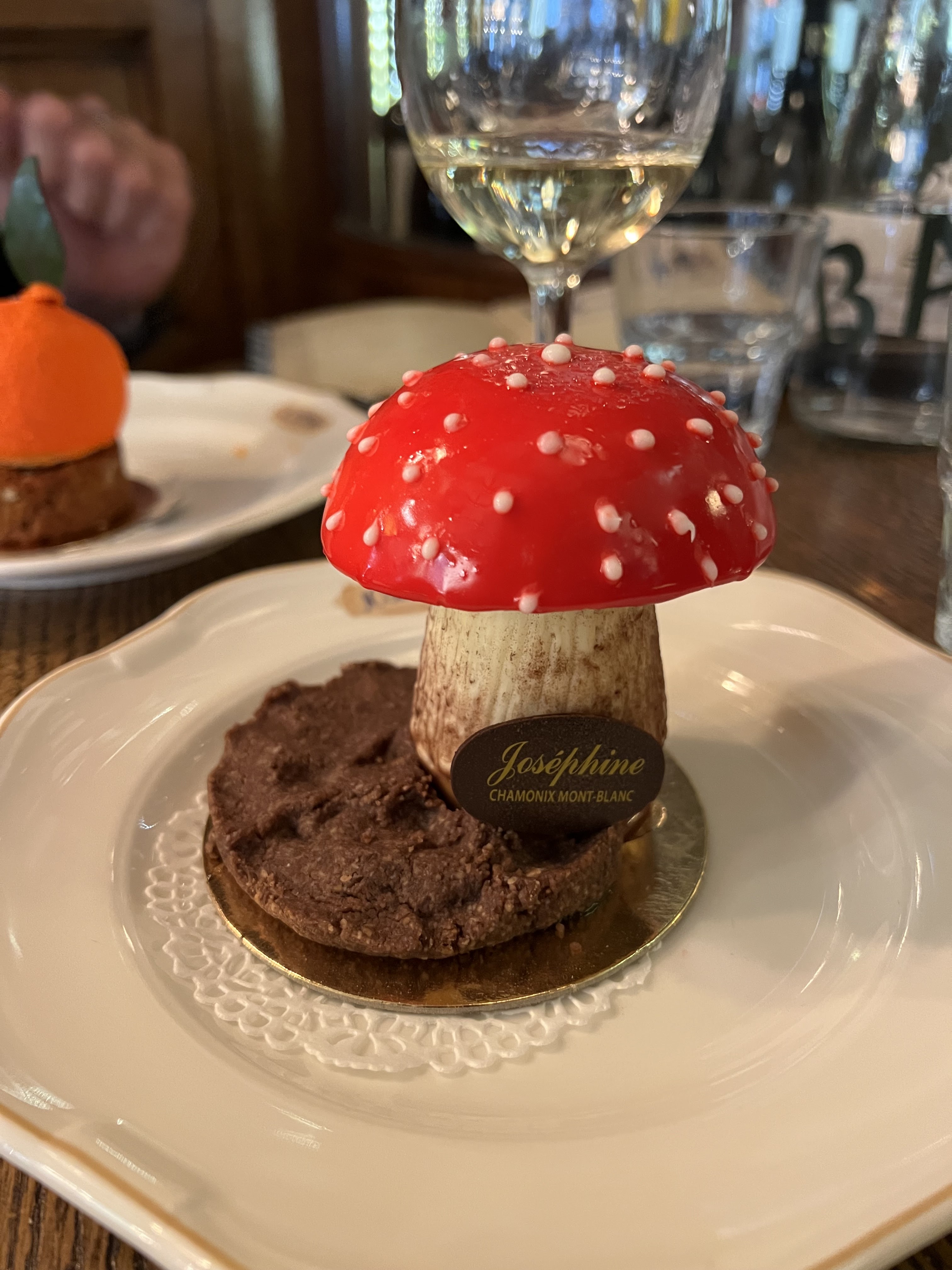 Nous sommes arrivés après l'heure normale du déjeuner à Chamonix. Heureusement, Joséphine sert toujours le déjeuner et nous avons réussi à avoir une table pour 2 personnes à l'intérieur. À notre grande surprise, ils proposent une vaste sélection de plats de fruits de mer, et même un bar à huîtres à l'extérieur du restaurant. Je suppose que quand il fait -2°C dehors, vous n'avez pas besoin de glace pour refroidir les huîtres :) Nous avons eu des huîtres Fine de Clare en entrée. J'aime les petits et ils étaient frais. L'autre entrée que nous avions était la soupe de poisson qui était pleine d'umami avec un peu d'épices et nous réchauffait du froid. Pour le plat principal, j'avais des pétoncles poêlés poêlés avec des légumes-racines croquants et mon partenaire avait une spécialité locale composée de fines tranches de jambon cru, de fromage cuit au four et de salade fraîche. Mes pétoncles étaient cuits à la perfection, mais d'une manière ou d'une autre, ils étaient assis dans une mer d'huile de beurre à l'ail qui était trop grasse pour moi. Mon partenaire a cependant apprécié l'huile d'ail et le beurre avec le pain baguette. Nous étions très rassasiés après le plat principal, mais il y avait un dessert très intéressant que nous devions essayer. Une pâtisserie en forme de champignon. C'était léger et délicieux avec un centre de baies, une base de chocolat et une fine couche de chocolat blanc qui recouvrait la crème.