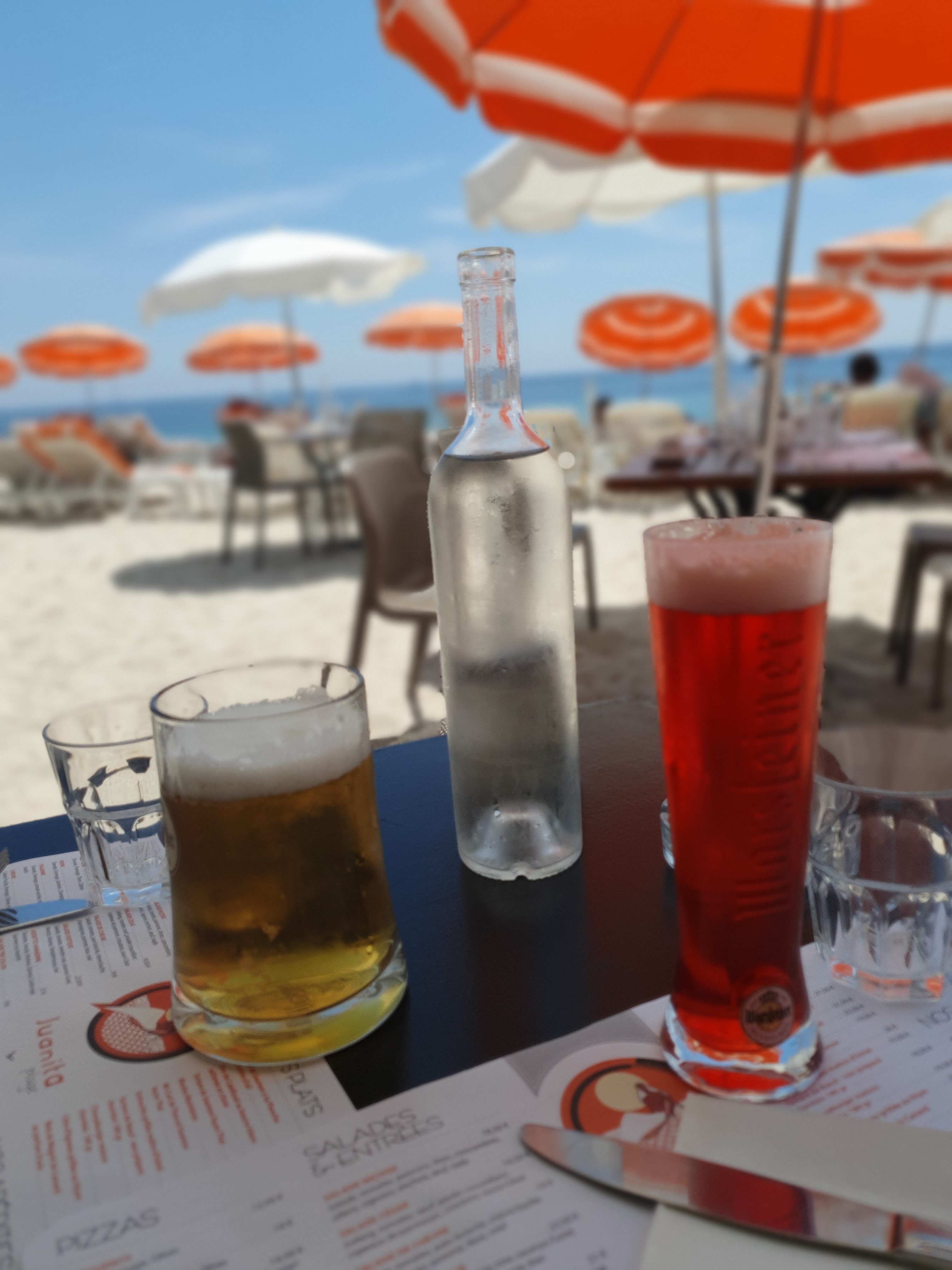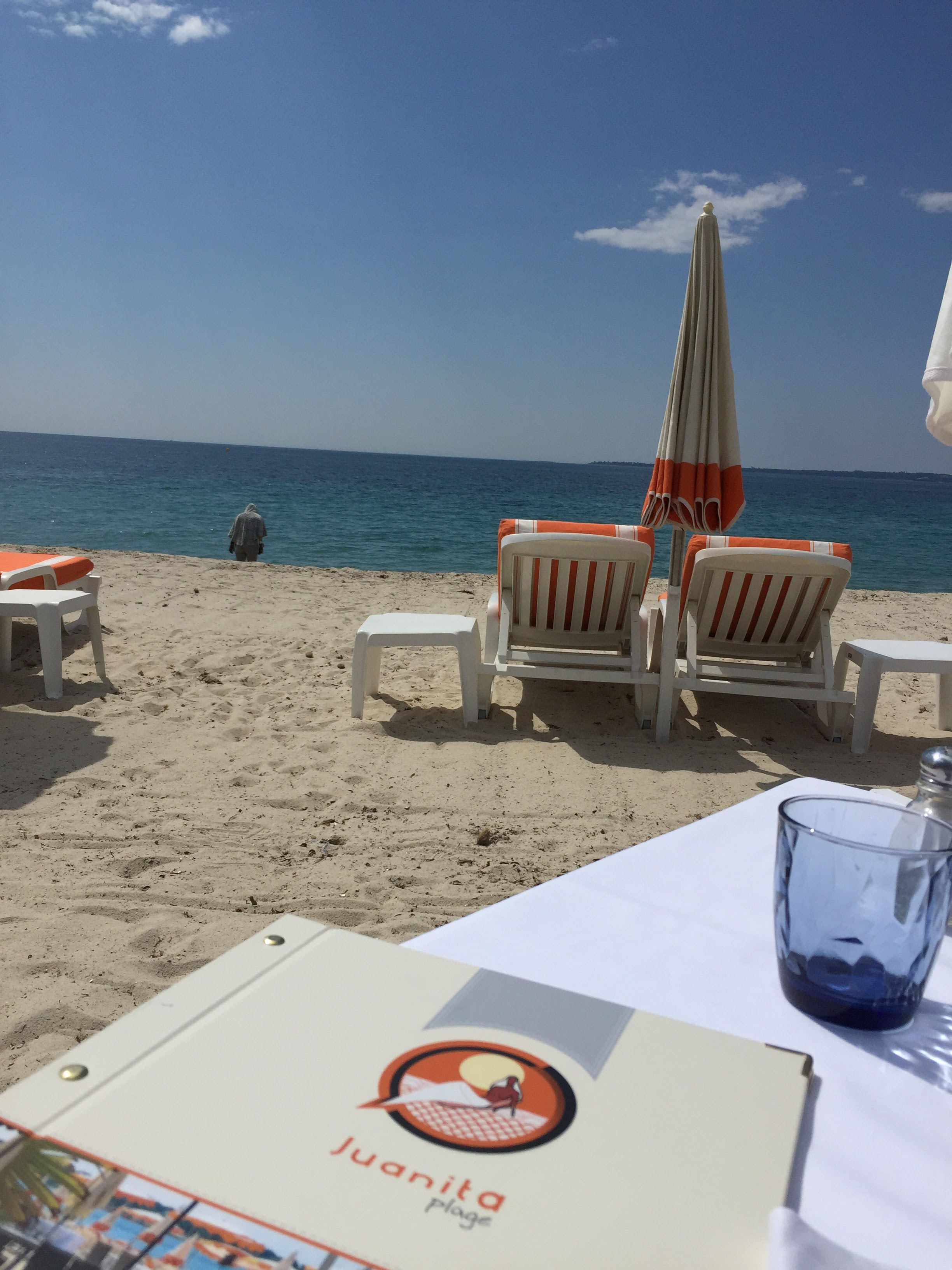 Quel plaisir de retrouver la plage (New Beach by) Juanita. Nous la connaissons depuis plus de 25 ans et l'ambiance est toujours la même : très familiale et même si nous ne venons pas tous les ans à Juan, nous avons l'impression d'être des clients importants. Le personnel est aux petits soins pour nous et toute l'équipe est très attentive au bien être de ses invités. Clin d'oeil à Fred, Dany (boy), Stacy, Mégane, Choopy(?) et l'adorable barmaid Clara. Tous les midis, nous nous sommes régalés au restaurant de la plage : noix de Saint-Jacques, tartare de thon, tartare (de boeuf) à l'italienne, divers plats du jour (poisson ou viande) ainsi qu'un joli choix de pizzas. La qualité est là (cuisson parfaite des viandes et poissons) et la quantité n'est pas en reste. Et puis, manger sur la plage en ayant la mer et le ciel bleu comme seul horizon, c'est un réel plaisir. Pour repérer Juanita, c'est facile: les parasols blanc et orange que nous avons toujours connus. Ces deux couleurs se détachent parfaitement sur le sable et le décor en nuances de bleu. De plus les responsables ont eu l'intelligence de ne pas profiter de l'espace généreux pour empiler les matelas, ce qui contribue à rendre la plage de Juanita, la plus agréable de Juan-Les-Pins. Une vraie pépite.