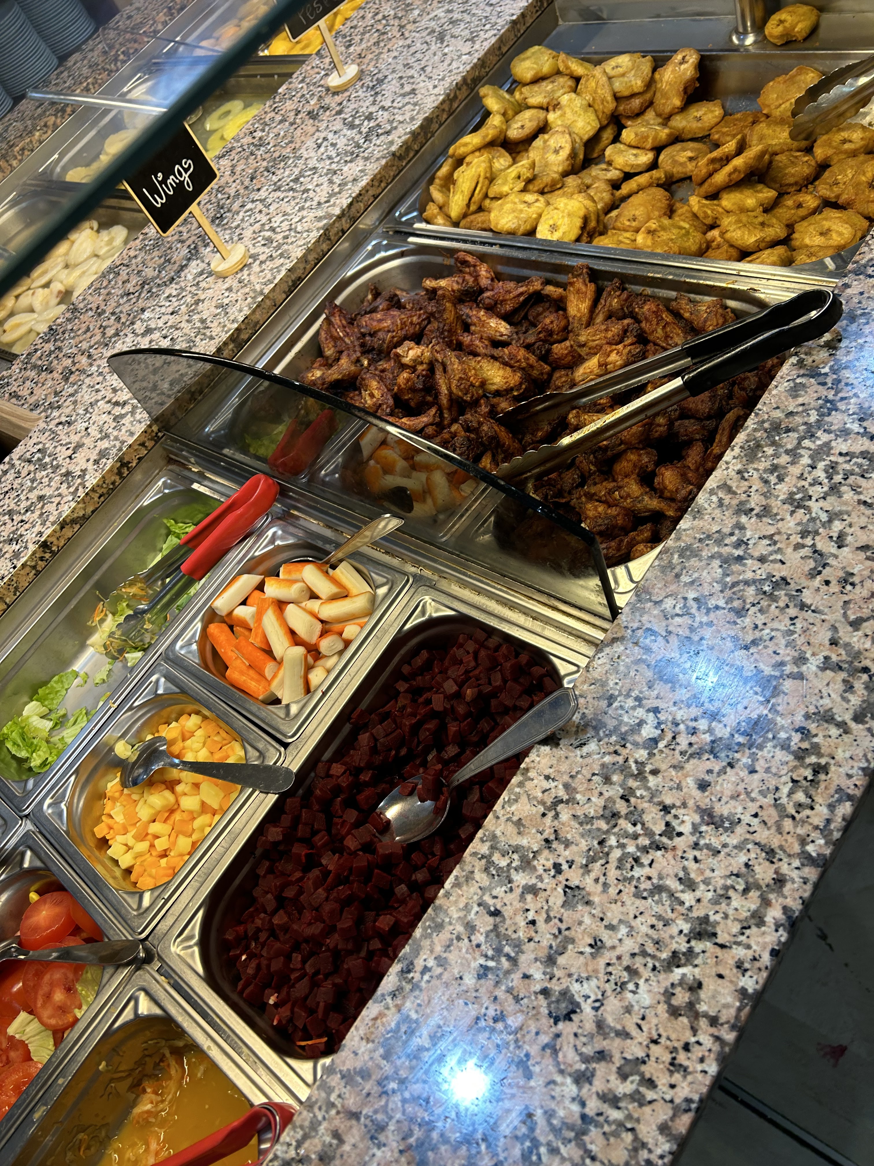 Buffet à volonté. Les plats sont traditionnels, avec beaucoup de choix. Je conseil pour ceux qui veulent tenter la découverte des plats haïtiens. Le plus dans ce lieu est l'animation le vendredi. Royal. Des souvenirs qui resteront.