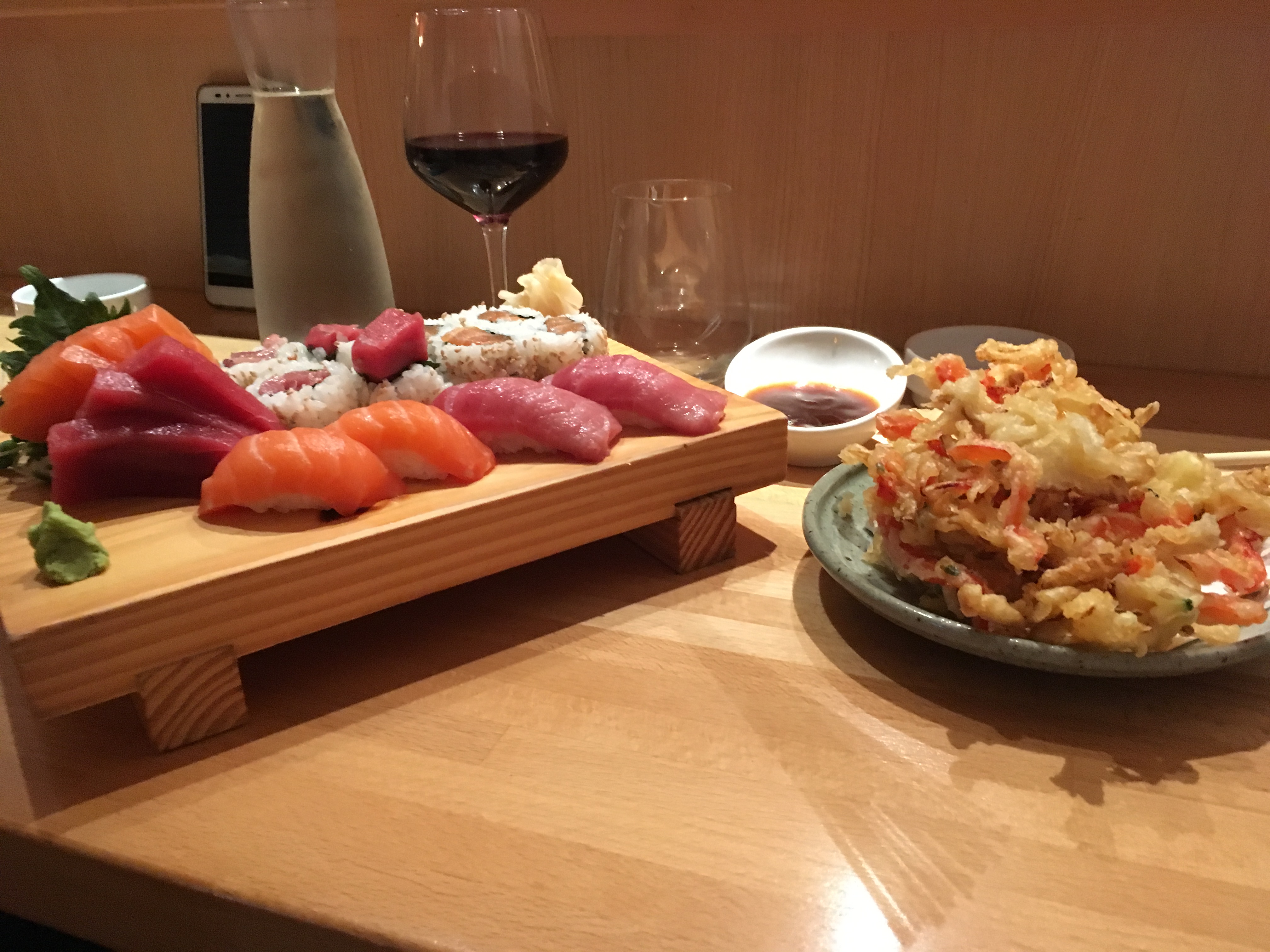 Vraiment un joli petit restaurant de sushi, la nourriture était vraiment bonne (juste un peu trop de coriandre sur l'un des rouleaux). Ils ont même bu quelques whisky japonais de 12 ans, Hibiki est toujours un favori.