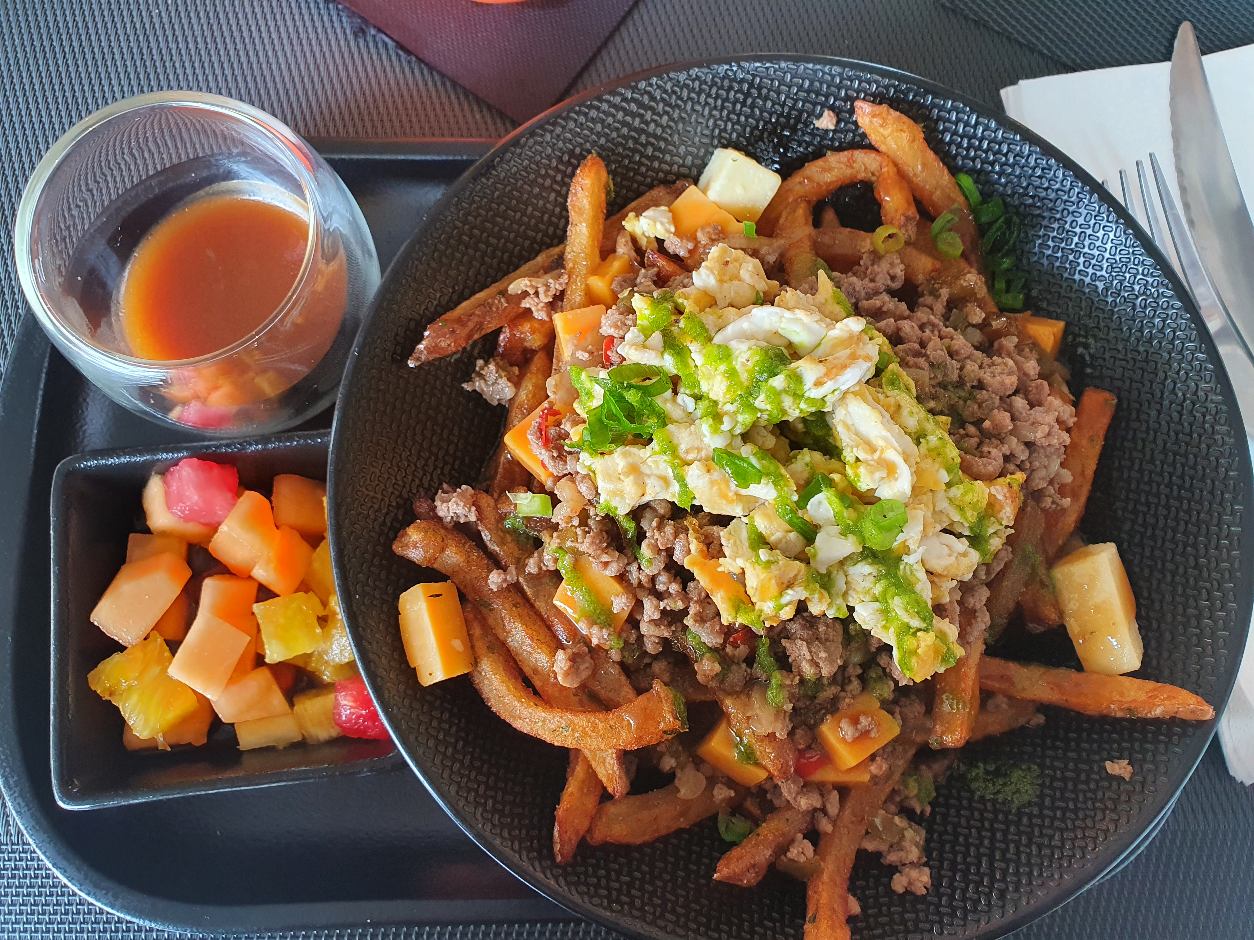Brunch avec des produits de qualité. Jus détox délicieux et des pancakes à la banane terriblement bons. Le menu choisi(nachos avec filet de porc) était très complet avec pomme de terre, salade de fruits et salade en accompagnement. Personnel et cadre sympathique.