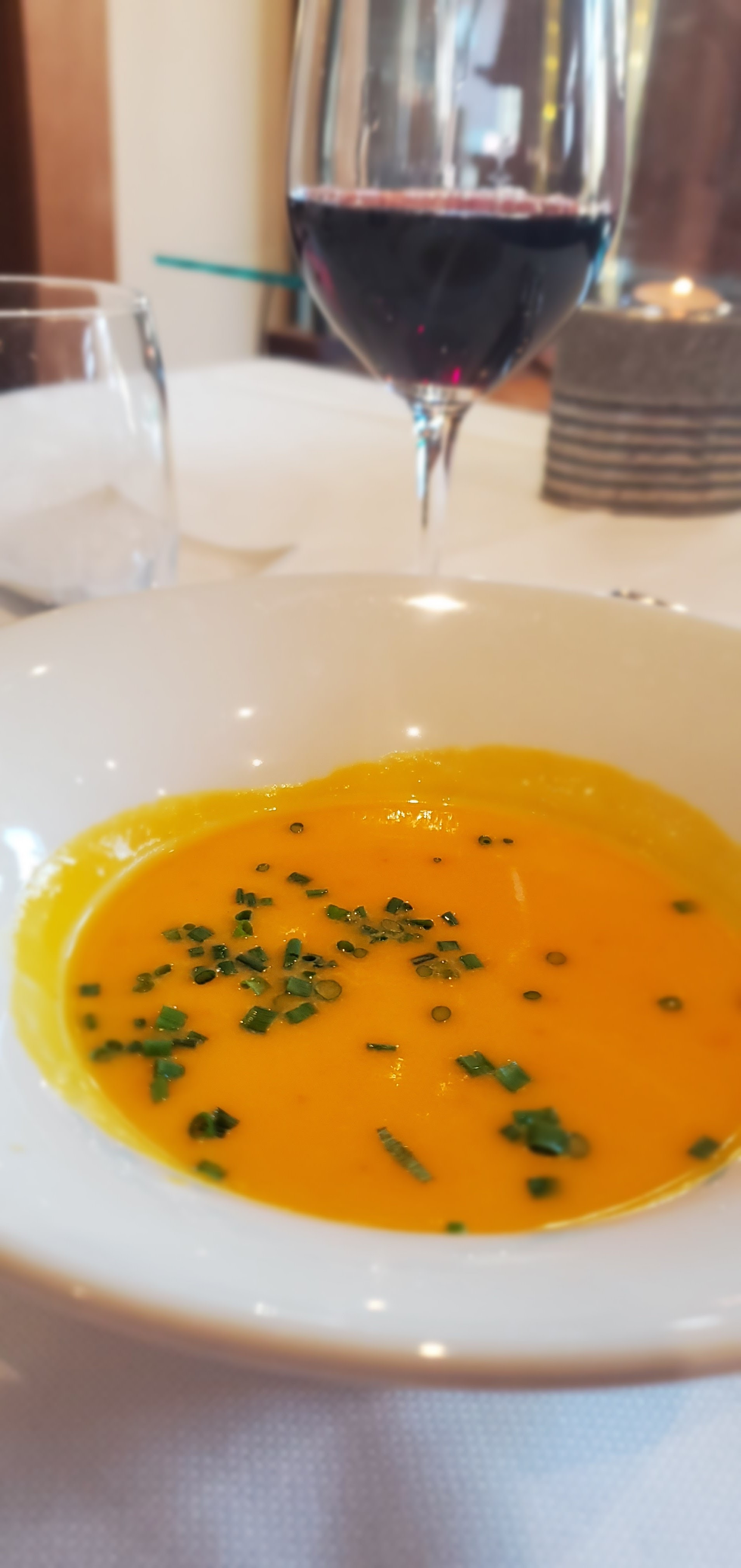 Un Très bon moment / le fois gras de canard en soupe excellent / raviole de saint jaques 👍/ Cappuccino de crème de langoustine au safran d'Alsace un régal et un Filet de bœuf rôti topisime.
