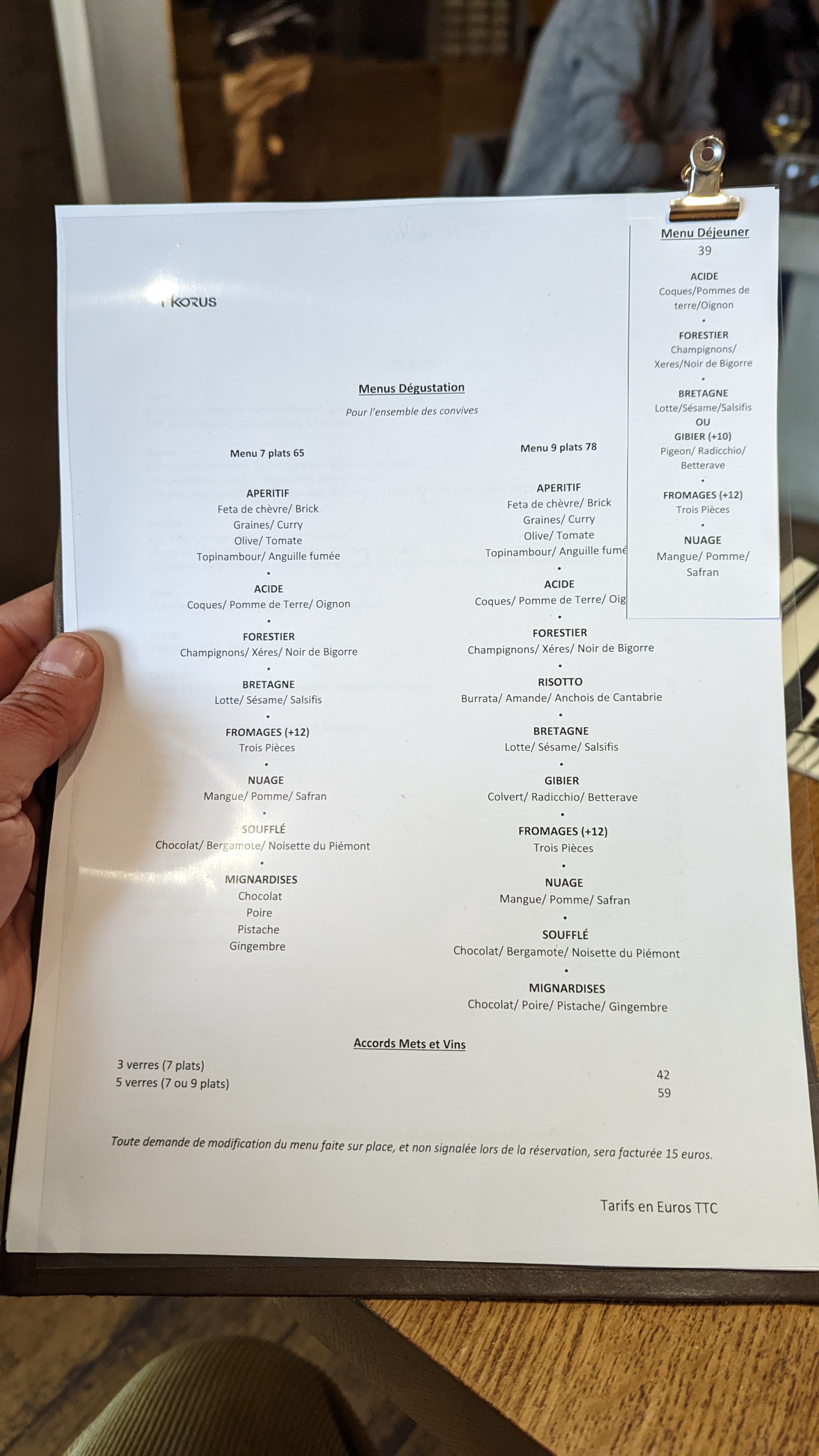 Super repas de 9 services chez Korus. Tout était vraiment délicieux, très bien assaisonné, les serveurs étaient très gentils. Prix totalement justifié. Bref foncez !!
