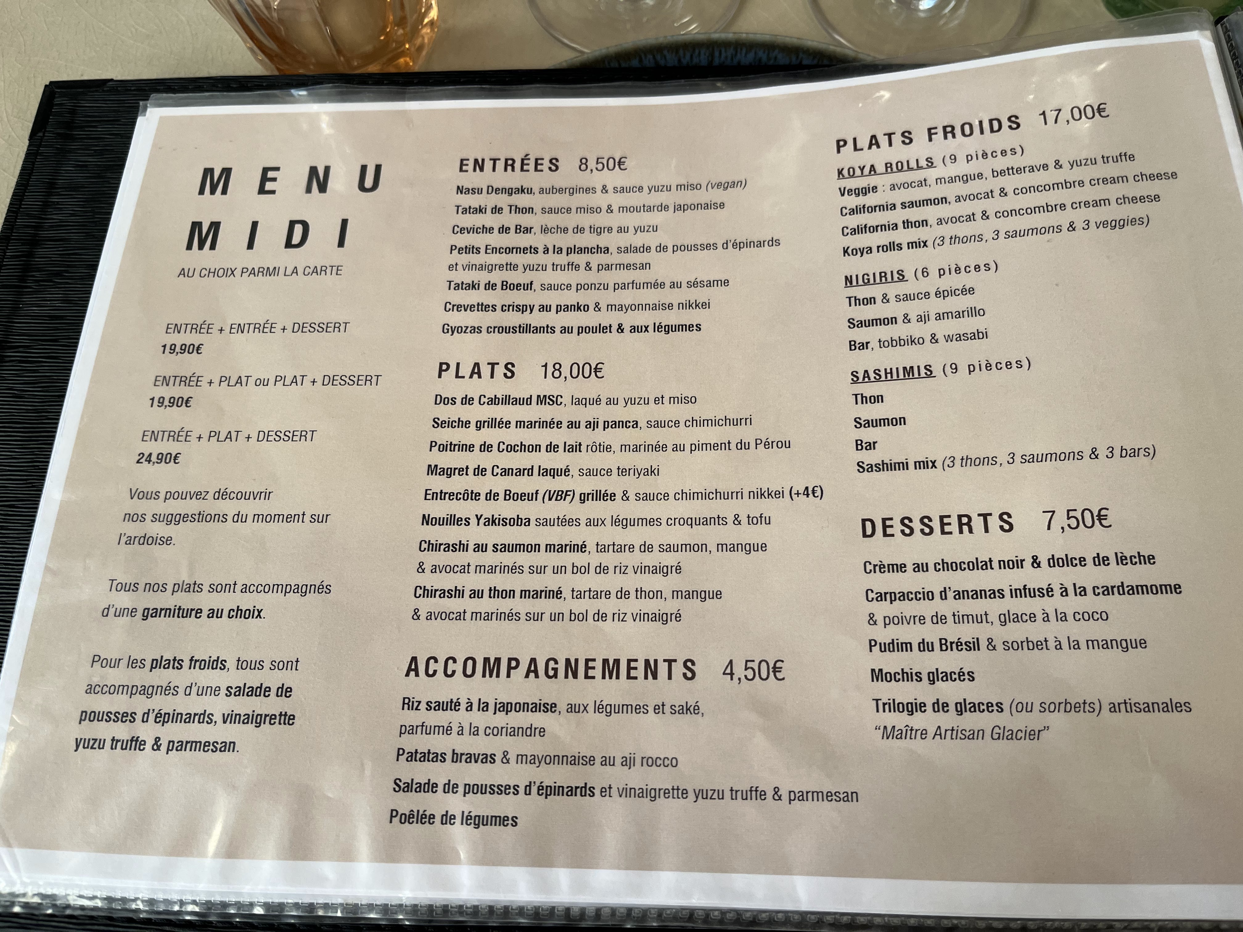 Excellent... Nous avons pris le menu koya entrée plat dessert.. Ceviche de maigre & tataki de thon ( succulent) Poulpe grillé et solomillo ibérique avec du riz parfumé. Choco power ( ne faites pas l'impasse sur le dessert, il est vraiment excellent) Les cocktails sont très très bons . Le lieu est cosy mais Petit : réservation conseillée. Le service est top. Il y a aussi un menu healthy le midi en semaine et un menu dégustation en 7plats ( 60e par personne). Également possibilité de prendre à la carte.