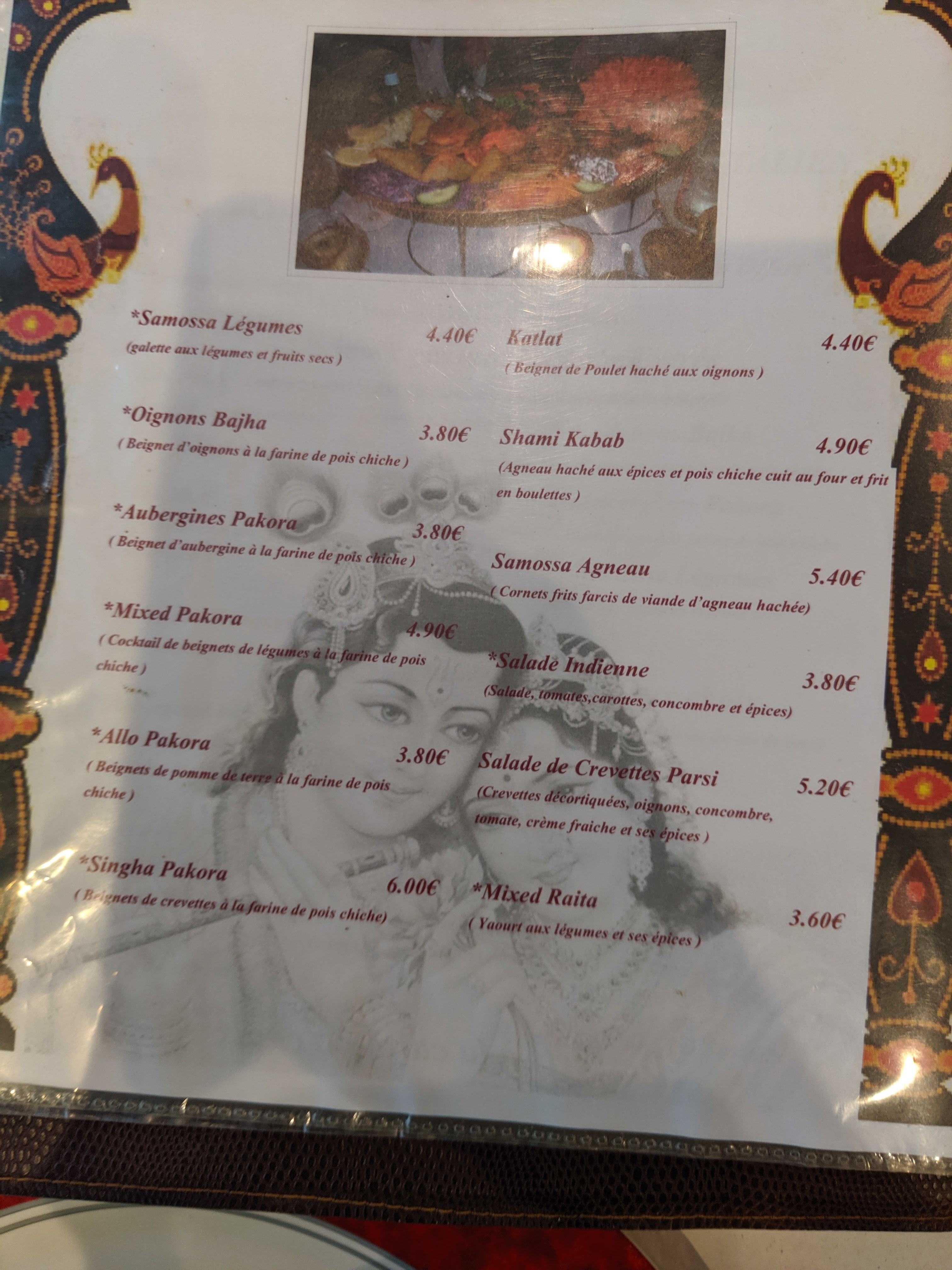 Relativement déçue par le repas. En entrée samoussas aux légumes (insipides) vraiment sans intérêt, en plat principal agneau curry (4 cubes de viande , portion enfant sûrement ! ) pas franchement mauvais mais pas bon non plus. Je déconseille.