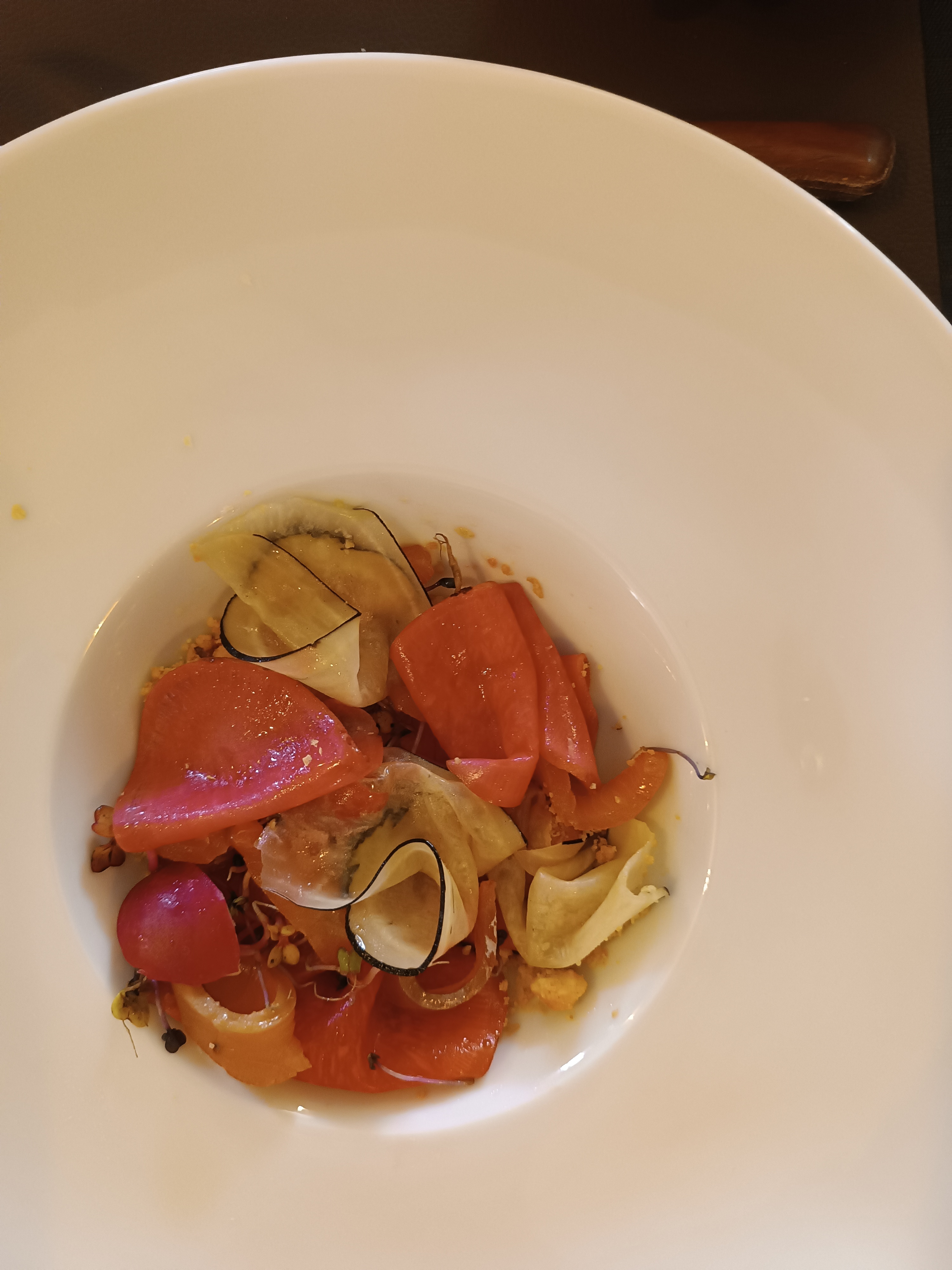 La cuisine était un régal visuel et gustatif à prix doux. Le chef est exceptionnel mais la serveuse nous a gâché tout le plaisir... Très froide, jamais un sourire et surtout nous a bâché sur le choix du vin*. Total nous n'avons rien osé dire pour ne pas faire d'histoire et avons été très malades toute la nuit... *(si ça ne vous plaît pas de toute façon on ne vous remboursera pas)... Vin trop lourd et tannique alors qu'il est écrit tannins soyeux sur la carte. J'ai demandé des verres ballons au lieu de verres à rosé mais rien n'y a fait. La serveuse n'a pas été pro du tout. Le client a le droit de se tromper ; elle n'avait pas à être autant désagréable.