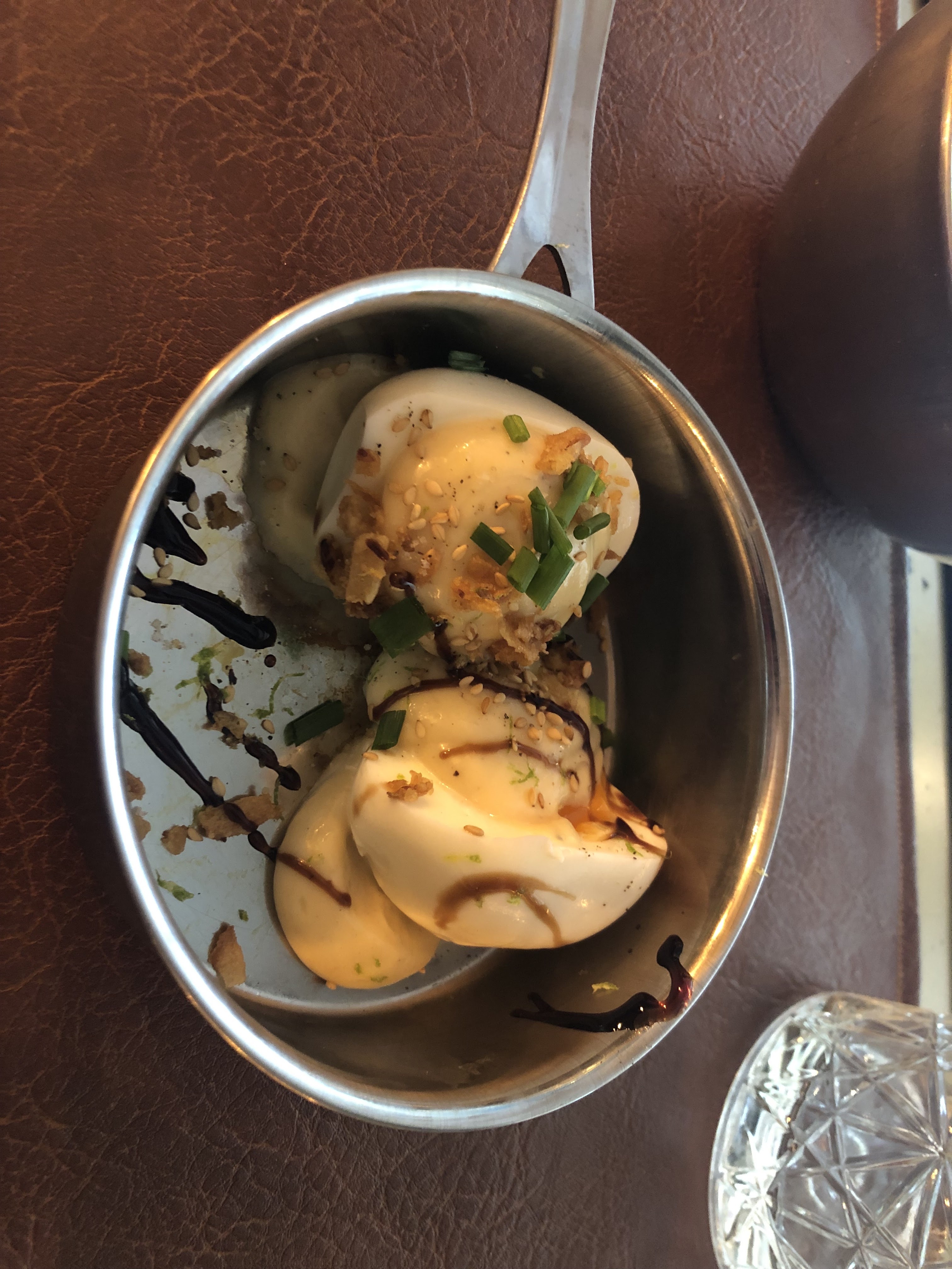 Étant plutôt à débarquer sans réservation je commence à me dire considérer comme une autruche sur les tables hautes. Apprécier la salle grande, l’ambiance et la chaleur des lieux. L’entrée est incroyable, je m’attendais à rien mais le sésames, ciboulette, sauce soja sucrée ont habiller le classique œuf mayo. Le plat est classique, avant de dire que c’est difficile de mâcher: couper en petit morceau et écraser et couper avec vos dents. Ajouter des échalotes et le tout est sublime. Bonne appétit