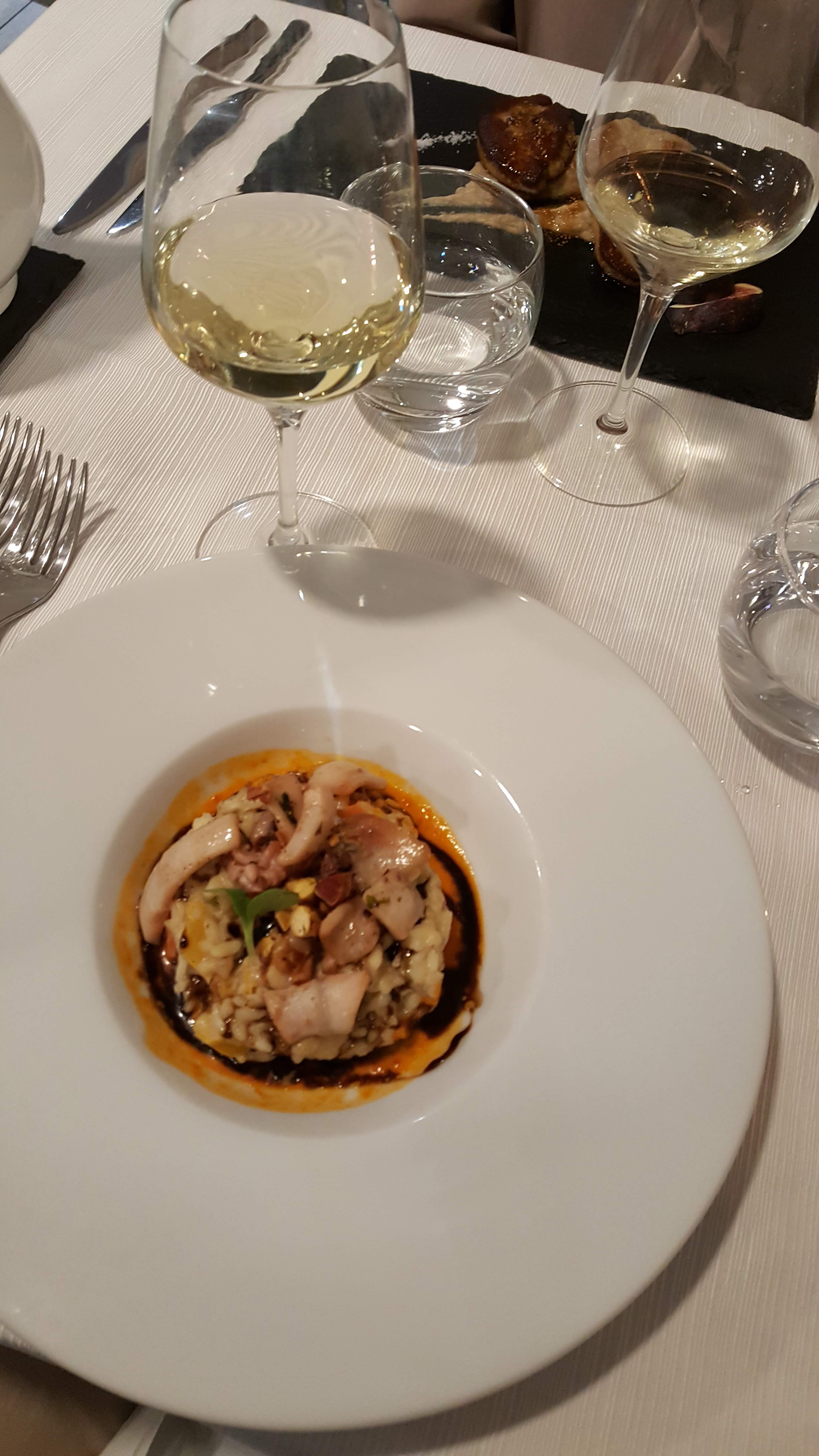 du bon et du moins bon le risotto en entrée était très bon. déçu par le poisson et la sauce en accompagnement . la pêche en dessert n'avait pas de goût mais la sauce chocolat caramel très bonne. accueil froid du garçon
