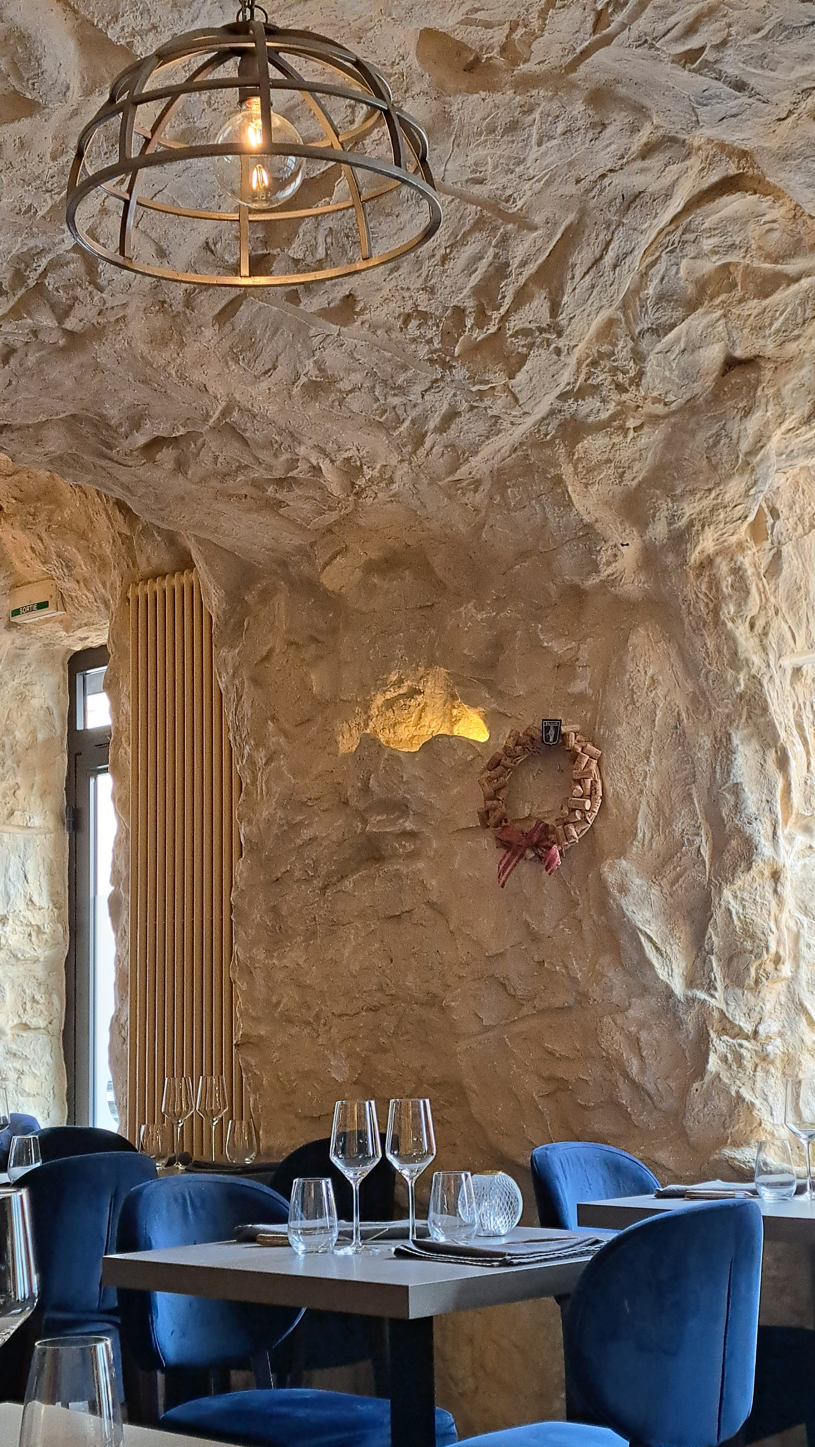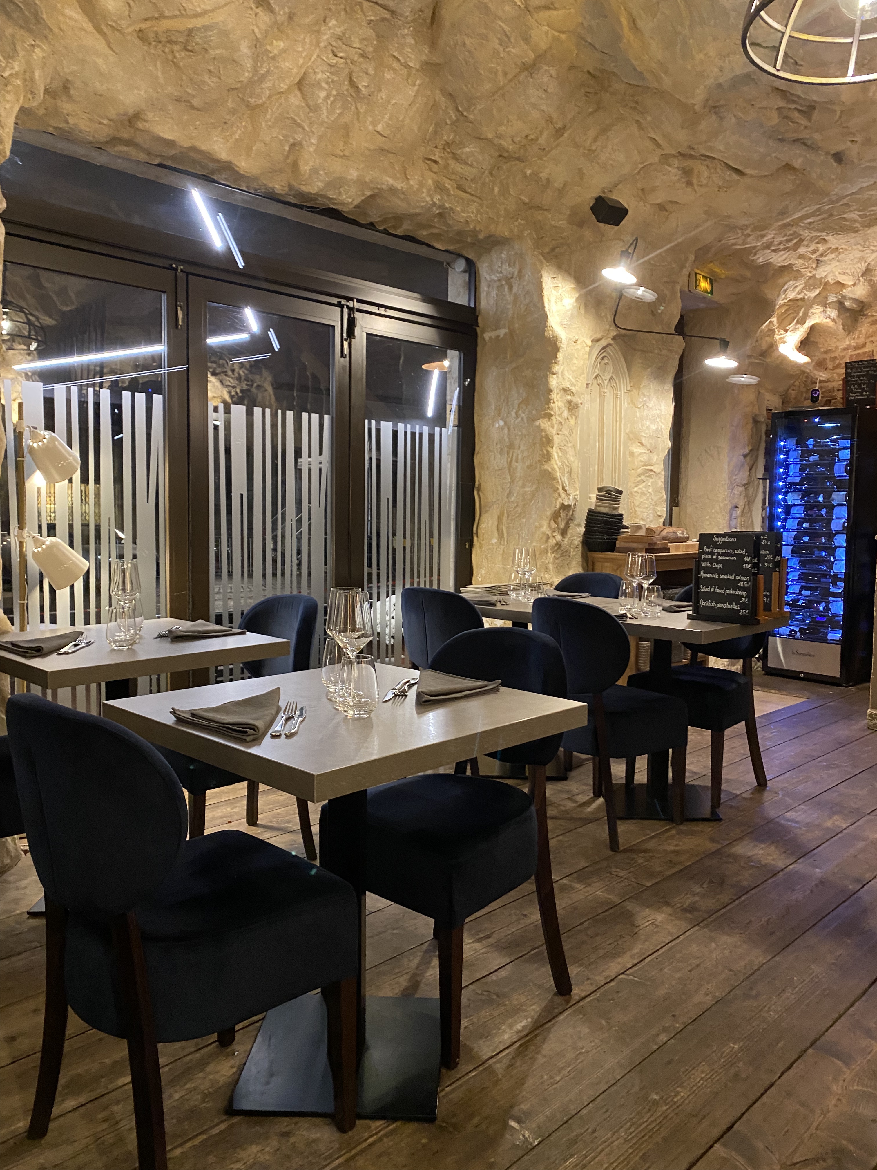 Intérieur qui imite une grotte ou alors une cave ? .un peu surprenant. Restaurant avec espace terrasse en bord de rue. Menus à la carte ou à 24; 41; 65 euros Accueil sympathique. Repas correct