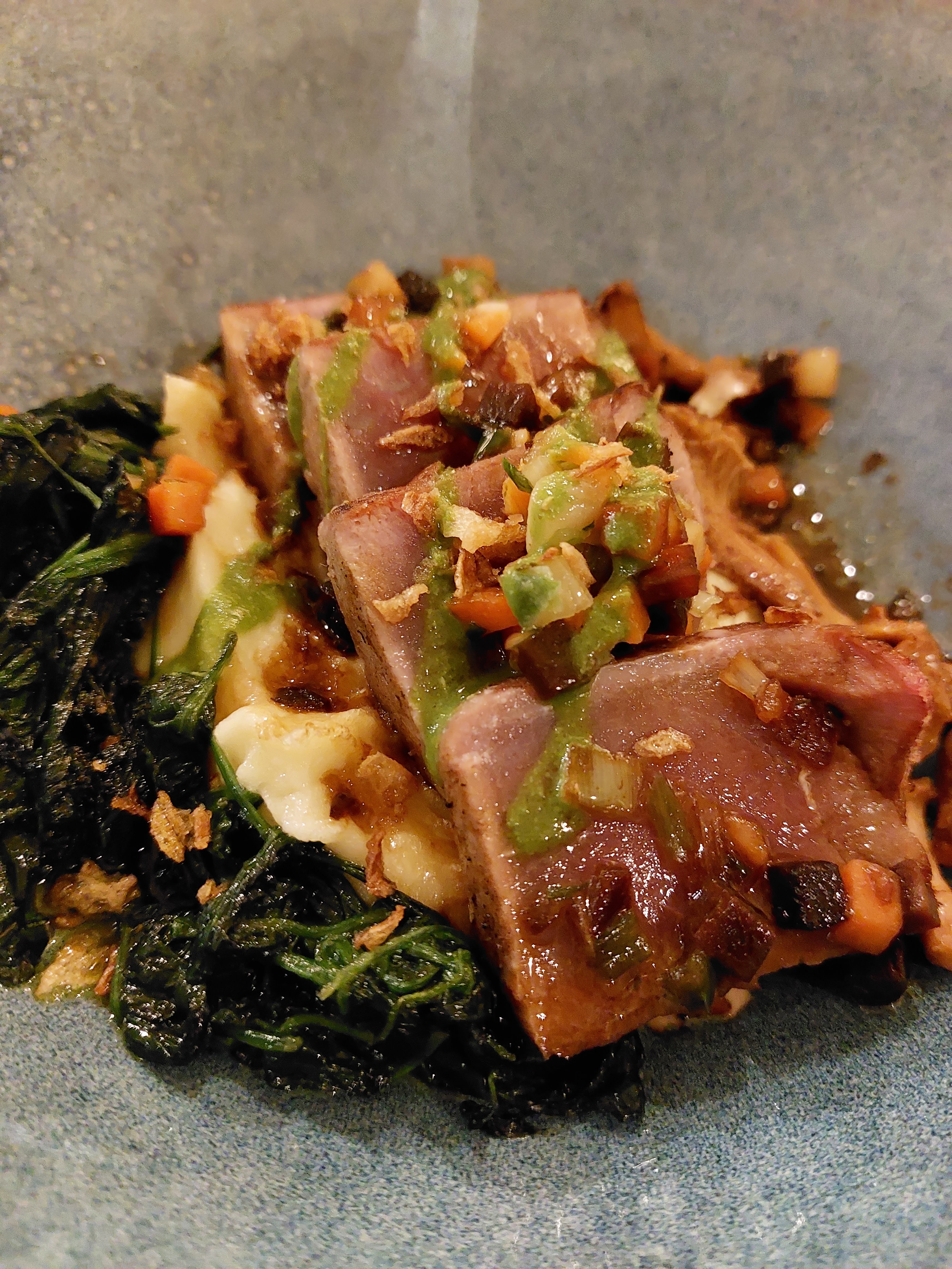 Nous avons pris les crevettes et le tataki de thon. Plats délicieux mais quantité très limite. Une salade verte avec des cacahuètes accompagnait les crevettes (21 euros) et rien avec le thon (22 euros) juste un peu de déco. Lorsque j'ai fait la remarque à la serveuse elle a eu l'air surpris. L' assiette de frites en plus est à 6 euros. Très déçu par le rapport quantité /prix nous n'avons pas commandé de dessert de peur que ce soit la même chose. En revanche service sympathique et très bon conseil pour le vin.