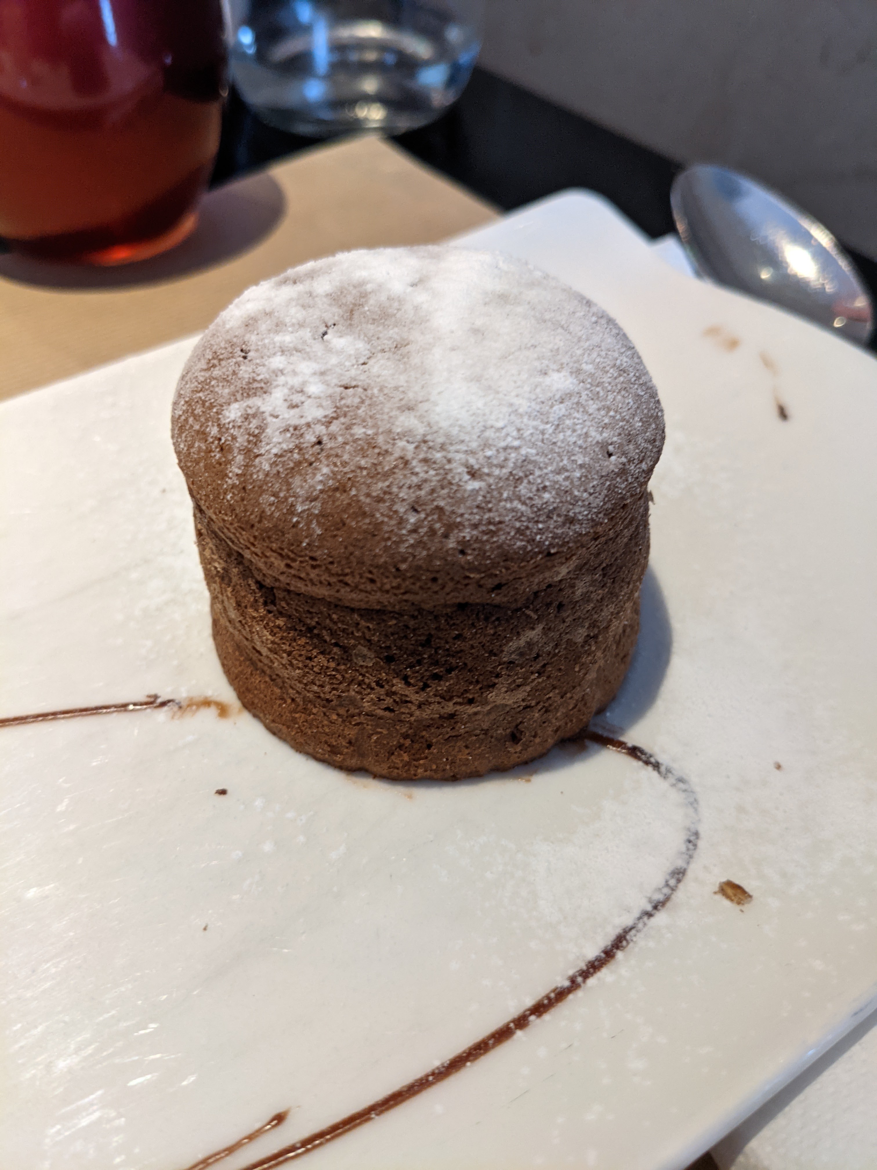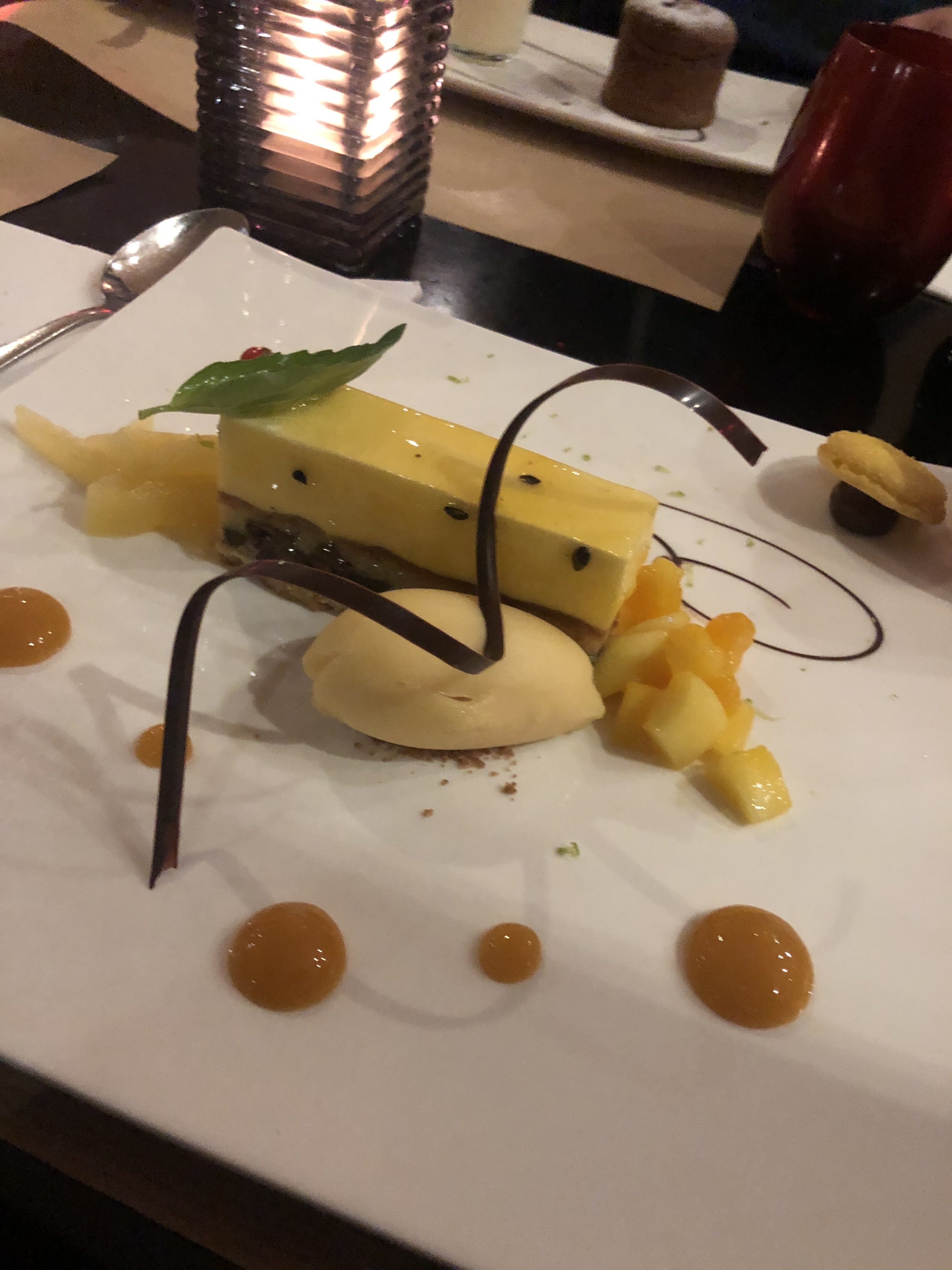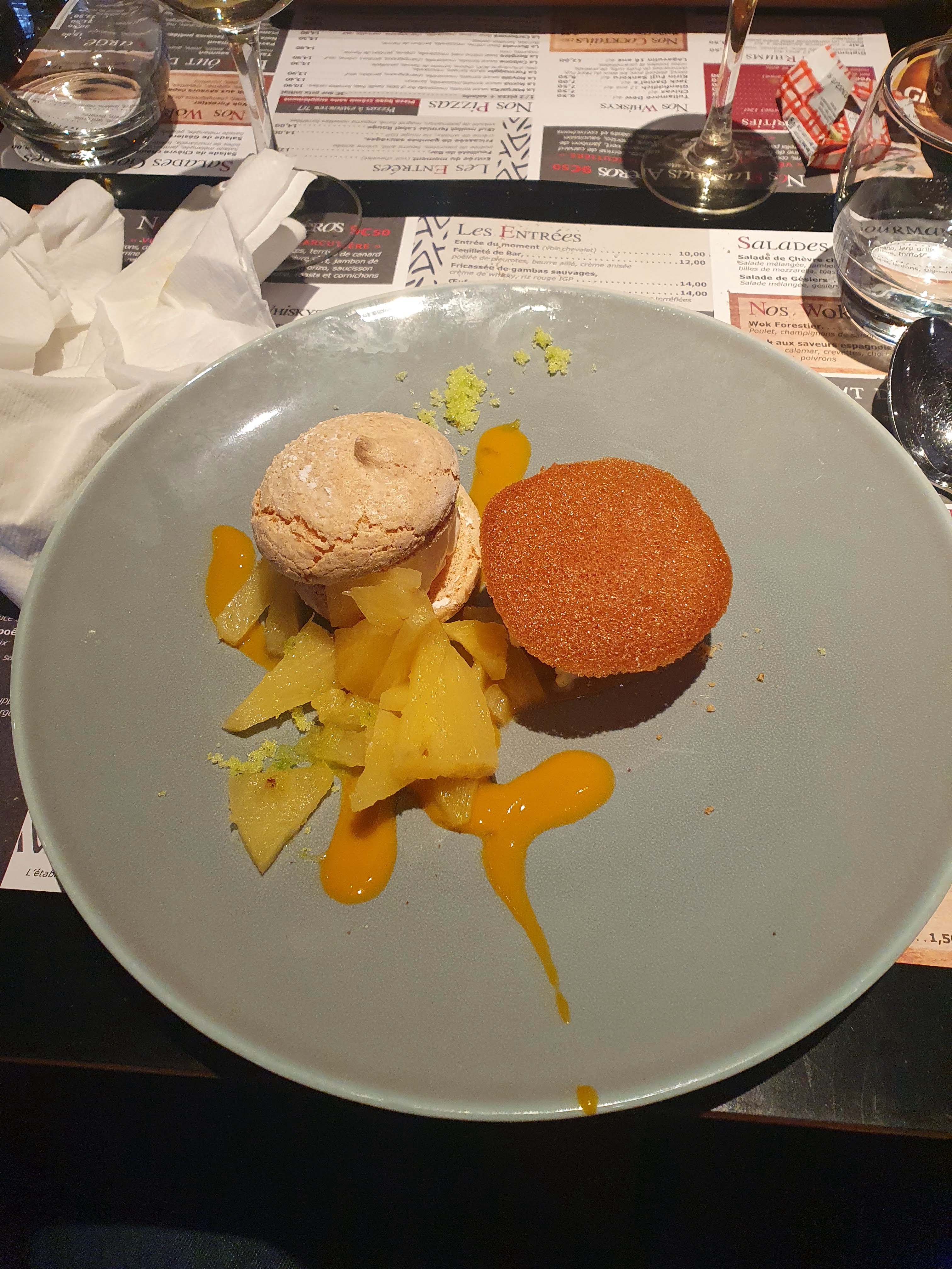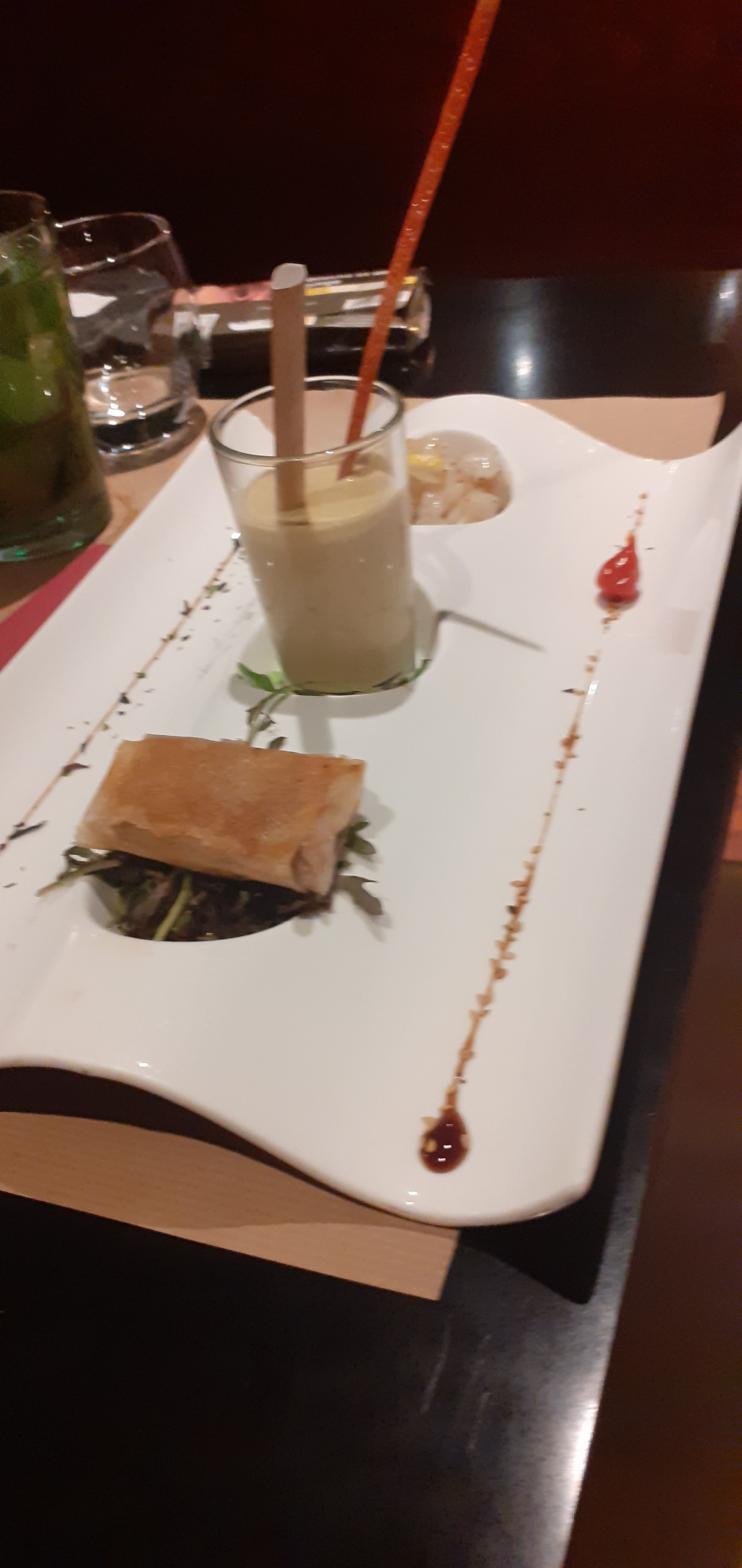 Restaurant sympa, mais service beaucoup trop rapide. Aperitif servi avec nos plats 🙁, Nos desserts sont envoyés aussitôt avoir terminé notre plat, le gentil serveur a vu notre étonnement sur la rapidité du service et il a renvoyé les desserts en cuisine pour nous les ramener plus tard. Le fait d être aussi pressé par le service (alors que clairement l’établissement n était pas plein) nous a pas permis d apprécier notre diner, qui devait être un moment détente… Le dessert était excellent.
