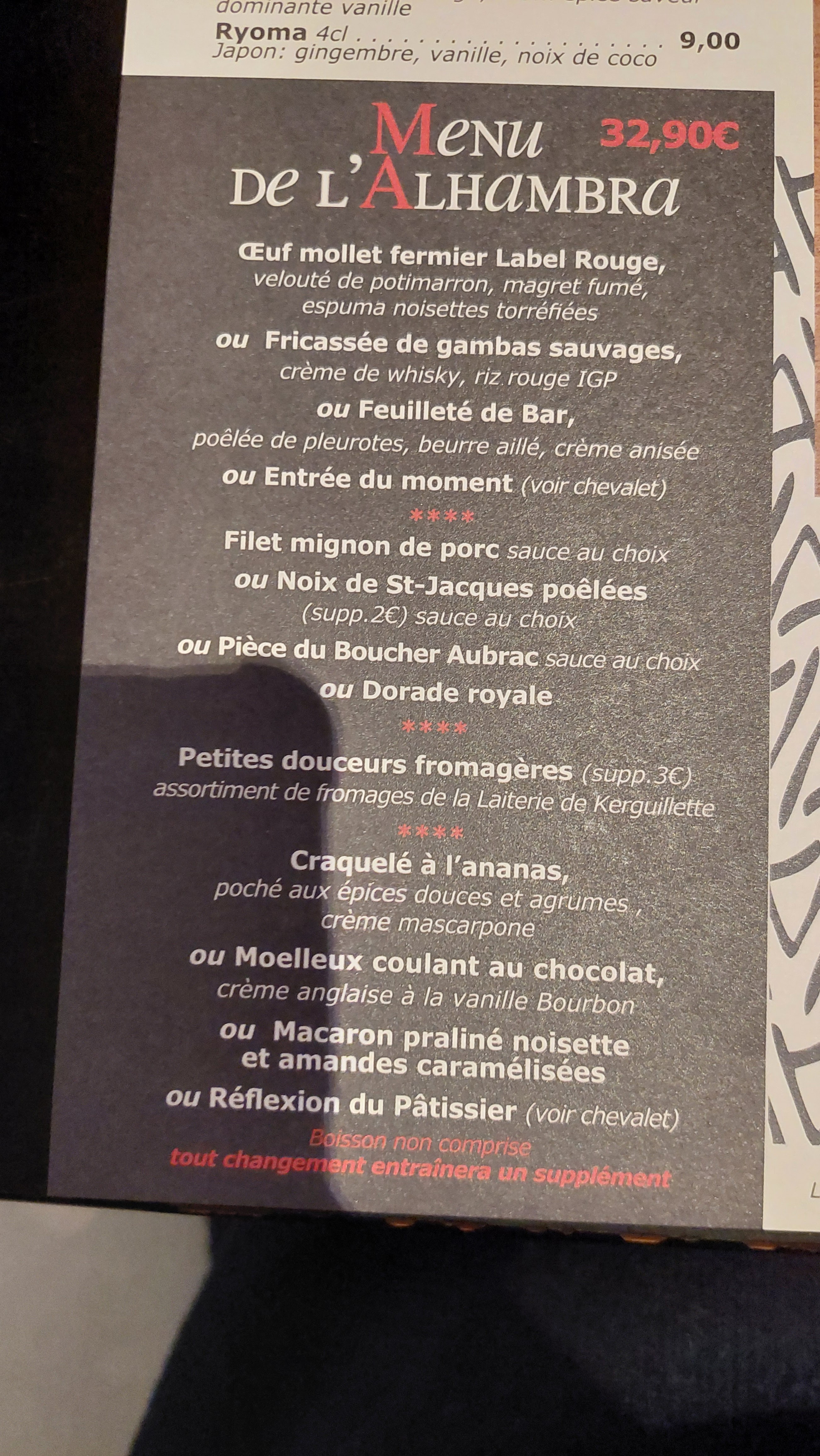 J'ai pris le menu alhambra à 32,90. J'ai apprécié le repas mais le menu ne vaut pas ce prix selon moi. Il vaudrait à la rigueur entre 26 et 28€, mais pas au dessus de 30. Service agréable, ambiance chaleureuse et calme