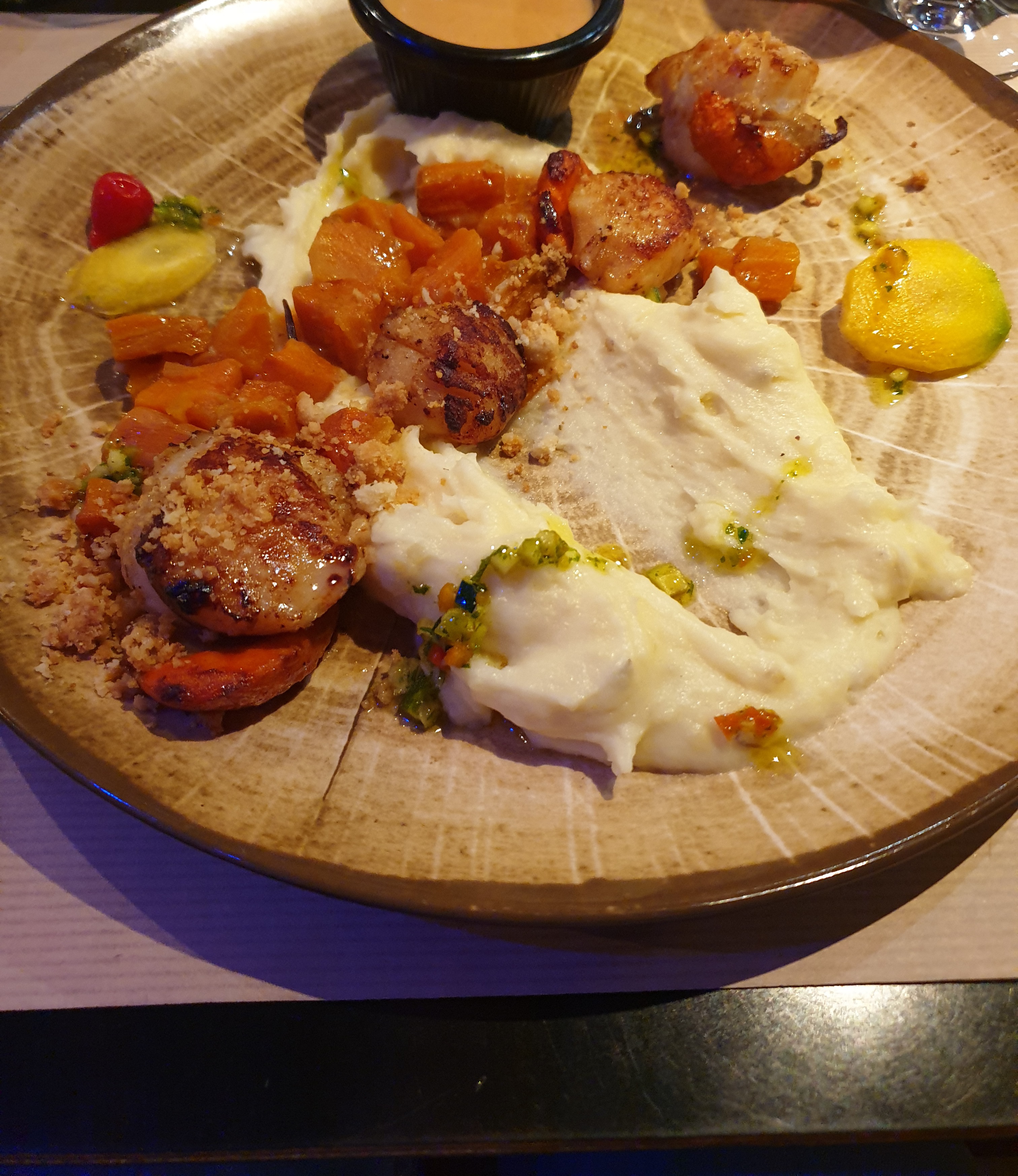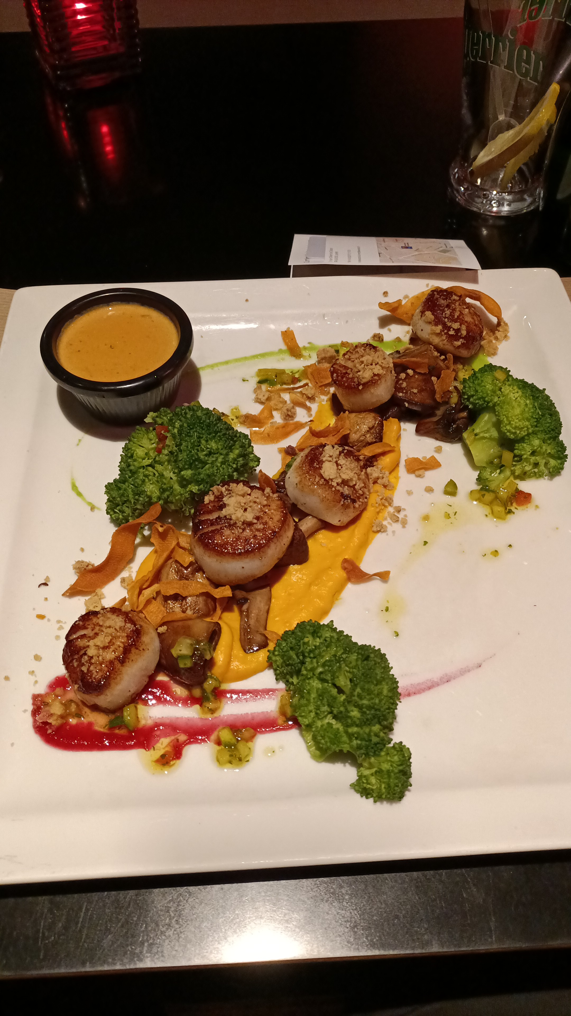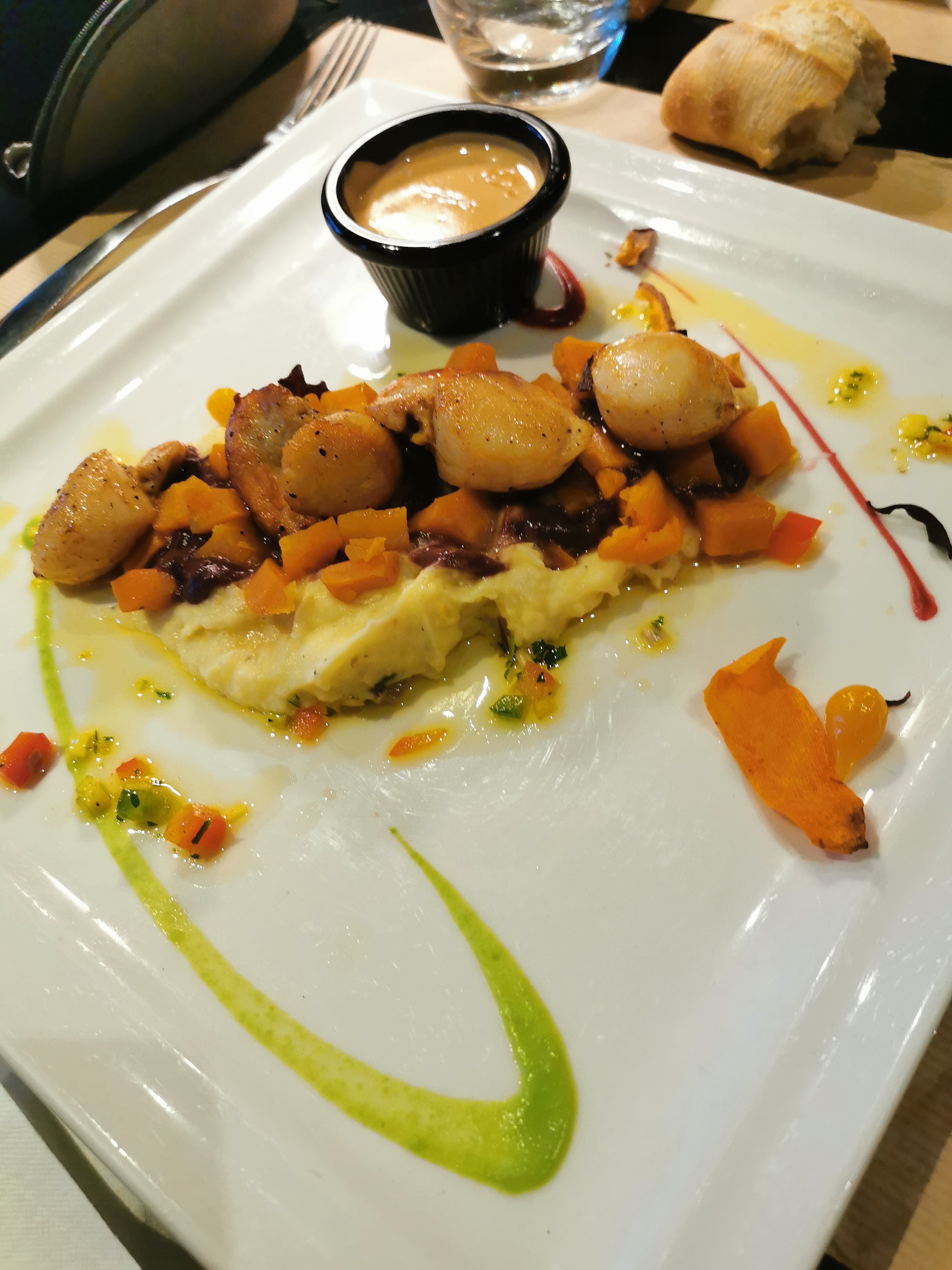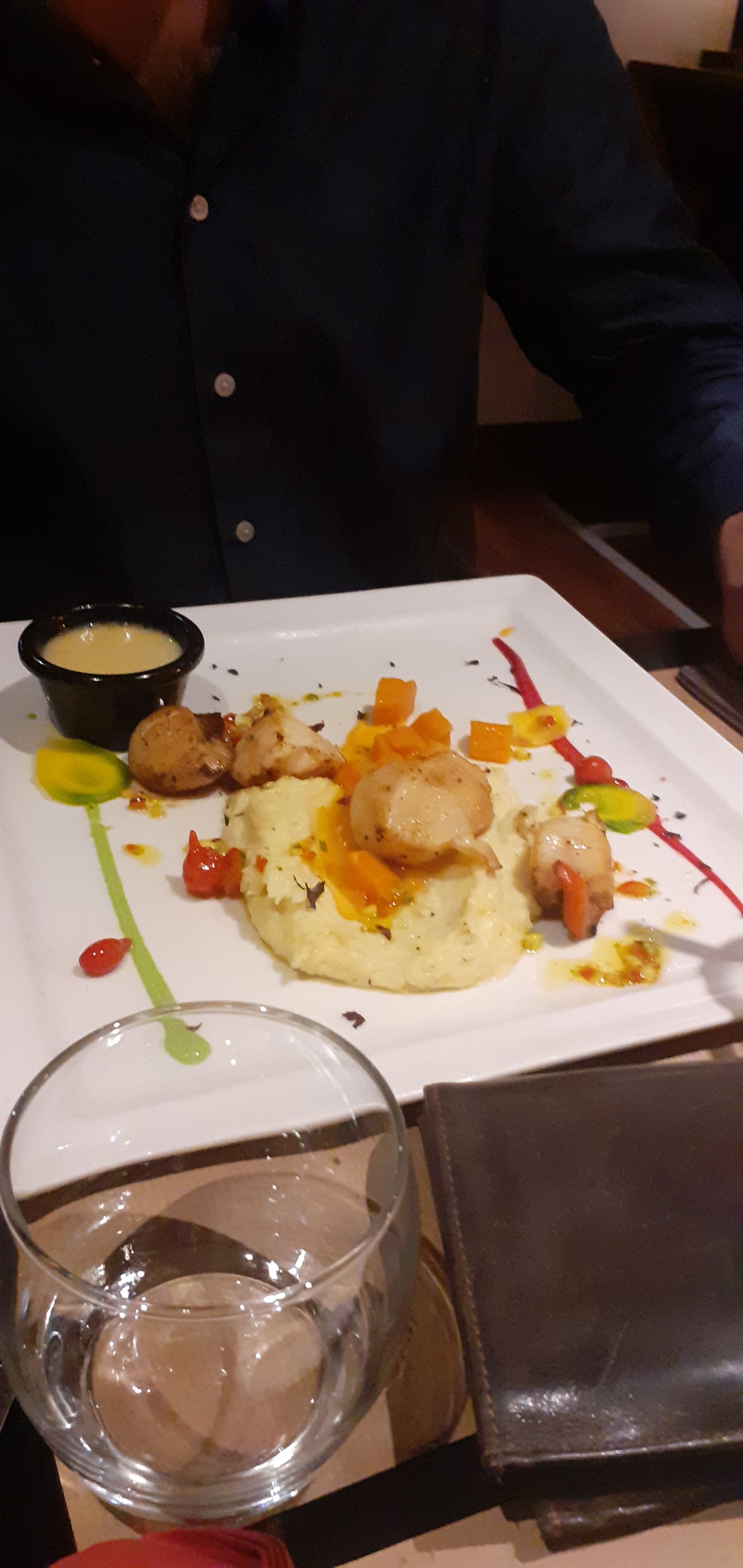 Plat très bon comme habituel ( noix de St Jacques) mais par contre par rapport à d'habitude, quantité de noix de st Jacques limite. En général 5. Là il y avait une grosse, 2 petites et un ou 2 morceaux. Celles ci étaient tièdes, alors que lecrasé de pdt chaud. Serveuses une pas très compétente et l'autre habillé en mini short ( tenue inappropriée pour service en salle) on est pas à la plage. Pantalon noir en générale en dress code. Le serveur qu'ils y avait il y a quelques mois qui était très pro est malheureusement parti ailleurs.