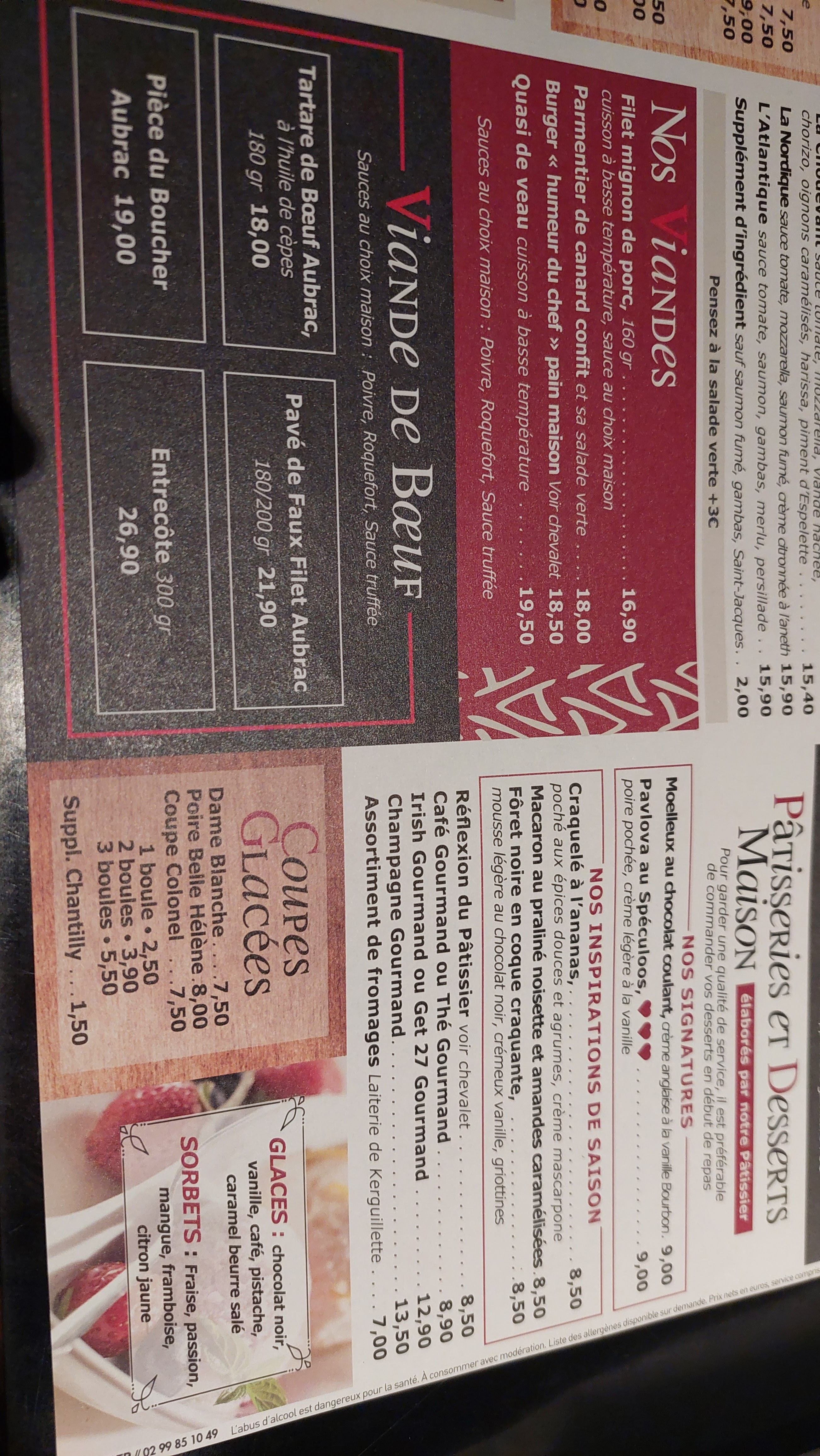 Très bon menu à 27 euros mise à part un filet mignon beaucoup trop cuit et sans accompagnement de jus dommage car tout le reste est très goutu et copieux le vin rouge carafe très bon rapport qualité prix