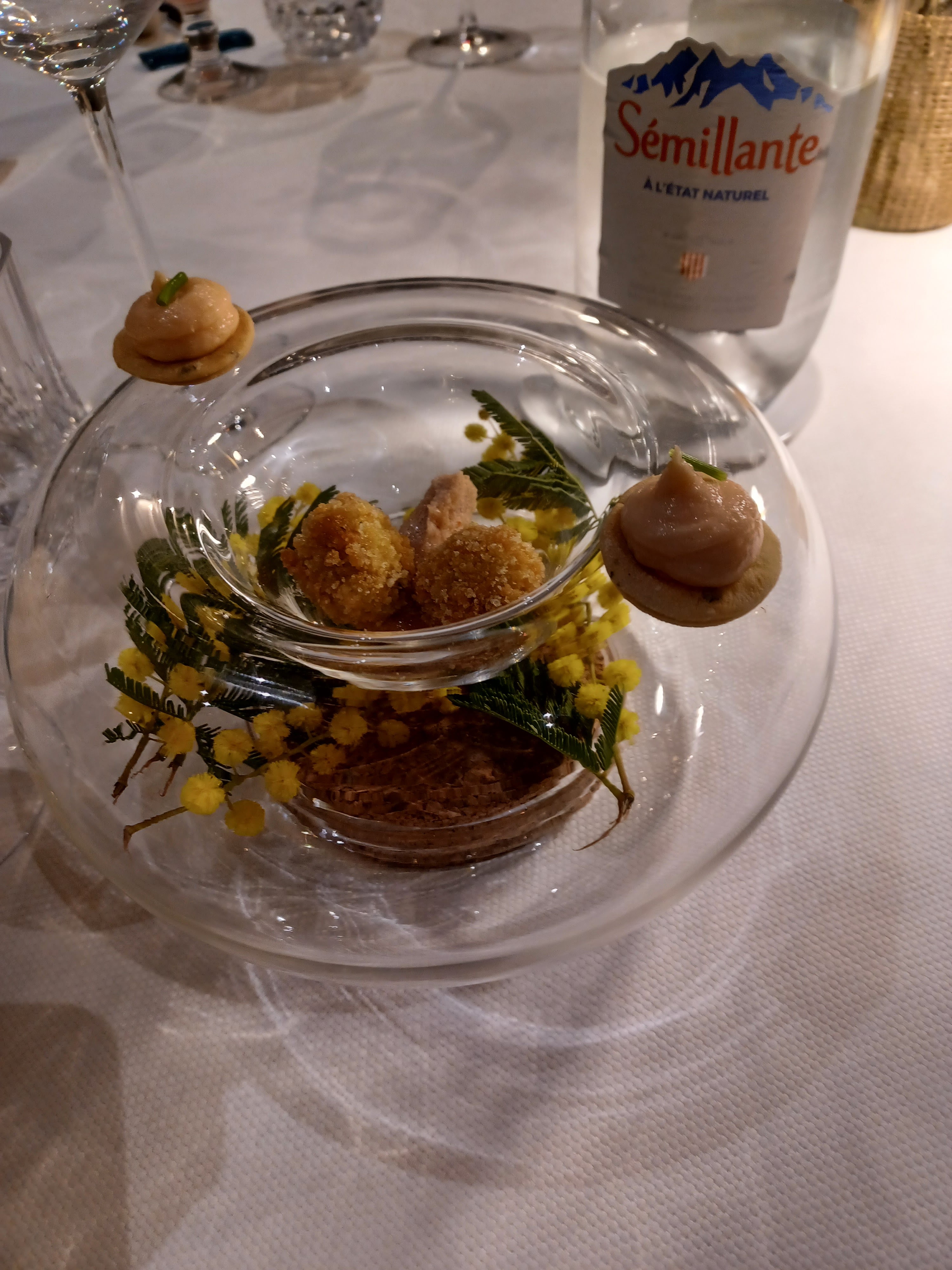 Cuisine excellente, osée (banane/morille, chocolat/Langouste) et raffinée, mais tout cela est gâché par un service déplorable. Nous sommes 4 avec nos enfants, le serveur commence par oublier l'une de nos commandes c'était quoi déjà le parfum pour votre kir ?. Bilan on a 3 boissons servies et on doit attendre le 4ème pour trinquer. Les bulles s'évaporent, ça arrive, c'est pas grave. Ce qui l'est plus c'est d'avoir un repas qui s'étale sur 4 heures avec parfois 45 minutes entre deux plats. Alors bien entendu on est là pour prendre notre temps, mais on vient pour déjeuner, pas pour passer la quasi totalité de notre après midi à table. Les vins ne sont pas servis en meme temps que les plats car on ne m'a pas prévenu indique le (charmant par ailleurs) sommelier. Arrive l'addition, avec une petite erreur de 300 € quand nous la vérifions...Suite à un bug technique informatique il leur est impossible de nous ressortir une addition corrigée et on doit payer en aveugle. C'est le début de saison nous dit on, le prix lui correspond bien à une haute saison. La cuisine est belle donc, mais le service lui donne un goût amer, qui ne fait pas bon ménage avec un restaurant étoilé !
