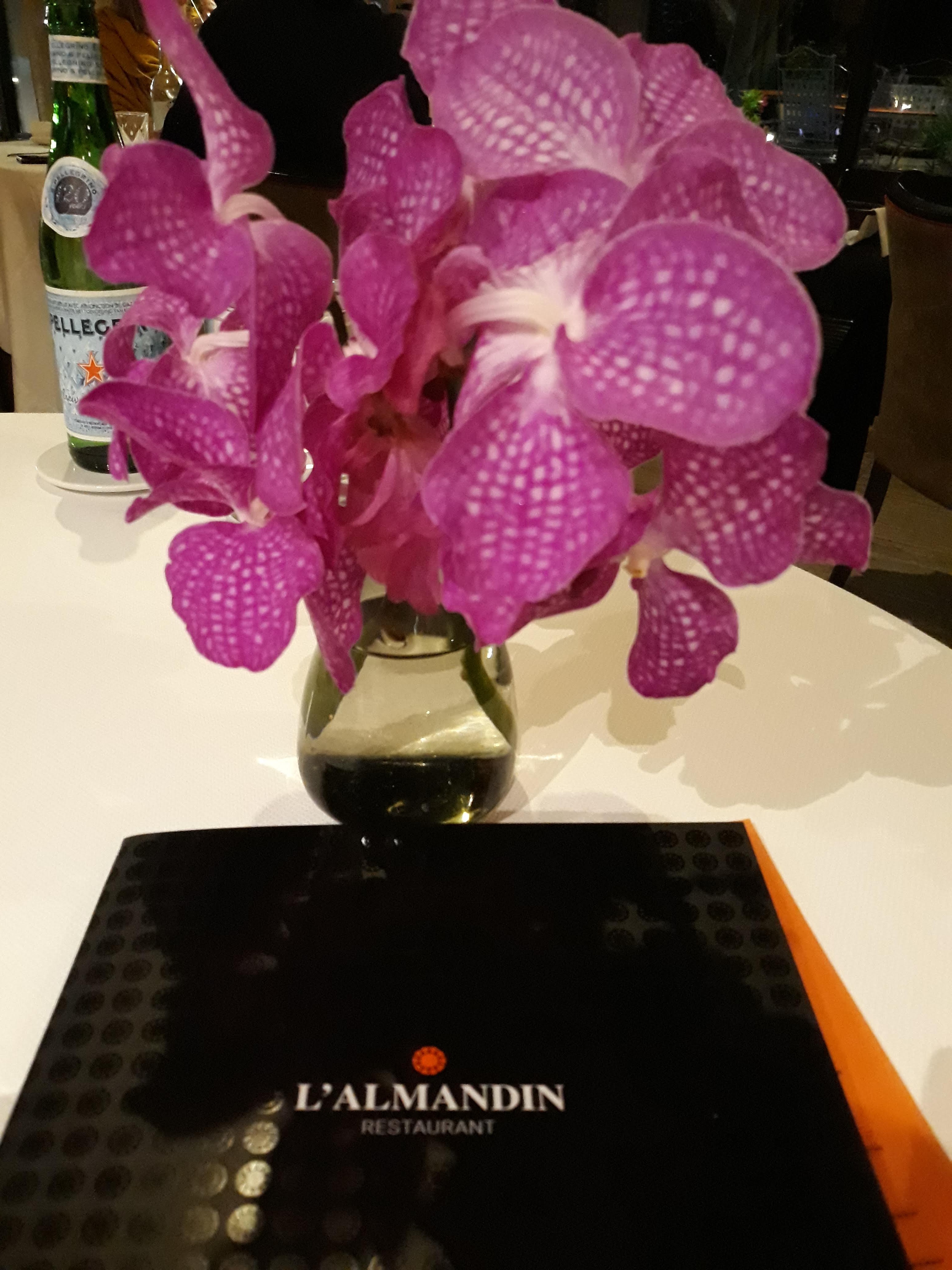J'ai attendu quelques semaines pour donner mon avis sur le restaurant car je n'avais pas envie de poster un avis à chaud... C'est vraiment un beau restaurant avec un cadre magnifique et les serveurs sont adorables. Cependant voilà, je suis Vegan et j'ai été invitée à l'occasion d'un anniversaire. Les mises en bouche et l'entrée étaient vraiment très bonnes (quoi que je les suspecte d'avoir rajouté du beurre pour la cuisson ). Par contre le plat principal et le dessert... J'ai encore eu droit à une assiette de légumes comme on en fait tant et si bien dans le département quand tu dis que tu manges vegetalien. Quand on va dans un restautant gastronomique étoilé on n'a pas envie d'avoir ça en guise de plat principal : du vert dans l'assiette sans cuisine, sans saveur. La seule chose travaillée était la puréeau au fond de l'assiette. Je n'ai quasiment rien mangé et oui je l'ai dit quand le serveur s'est étonné c'est insipide. Il aurait pu faire l'effort de rajouter du riz ou des pommes de terre comme les autres ont eu avec une sauce. Mais non je pense qu'il n'en avait rien à faire de me servir ça. Quand on cuisine c'est pour que le client soit content et prenne du plaisir tout au long du repas. Il y a tant d'inspirations dans la cuisine française comme Alain Passard qui cuisine à merveille les légumes de manière originale et qui poutant n'est pas Vegan. Un chef qui connaît ses produits et son métier sait donner de la saveur et de la gourmandise à ses plats quelque soit les ingrédients. Maintenant on passe au dessert. J'ai vraiment une très belle assiette qui arrive avec beaucoup de fruits. OK j'ai l'habitude... Aucun chef ici ne sait faire de pâtisserie vegan. Mais voilà j'ai des figues avec un immense coulis de framboises au fond de l'assiette pendant que les autres degustent un entremet au chocolat. Elle est OÙ la gourmandise là ? C'était hyper acide, il n'y avait aucun équilibre dans l'assiette. J'ai du quémander du chocolat noir pour pouvoir finir le dessert. A ce prix là je trouve que c'est vraiment inadmissible. Mon menu était hors de prix et ça ne valait clairement pas ce qu'on m'a servi. D'autant plus que je ne suis pas la seule à avoir trouvé que le niveau laissait à désirer. Mon conjoint est également de cet avis et il n'a pas mangé Vegan. On a fait plusieurs étoilés. L'Almandin dénote, aucune originalité... Ils vont sérieusement devoir se remettre en question car des gens comme moi il y en a de plus en plus. Et manger au restaurant ne devrait pas être une épreuve pour moi comme pour le personnel.