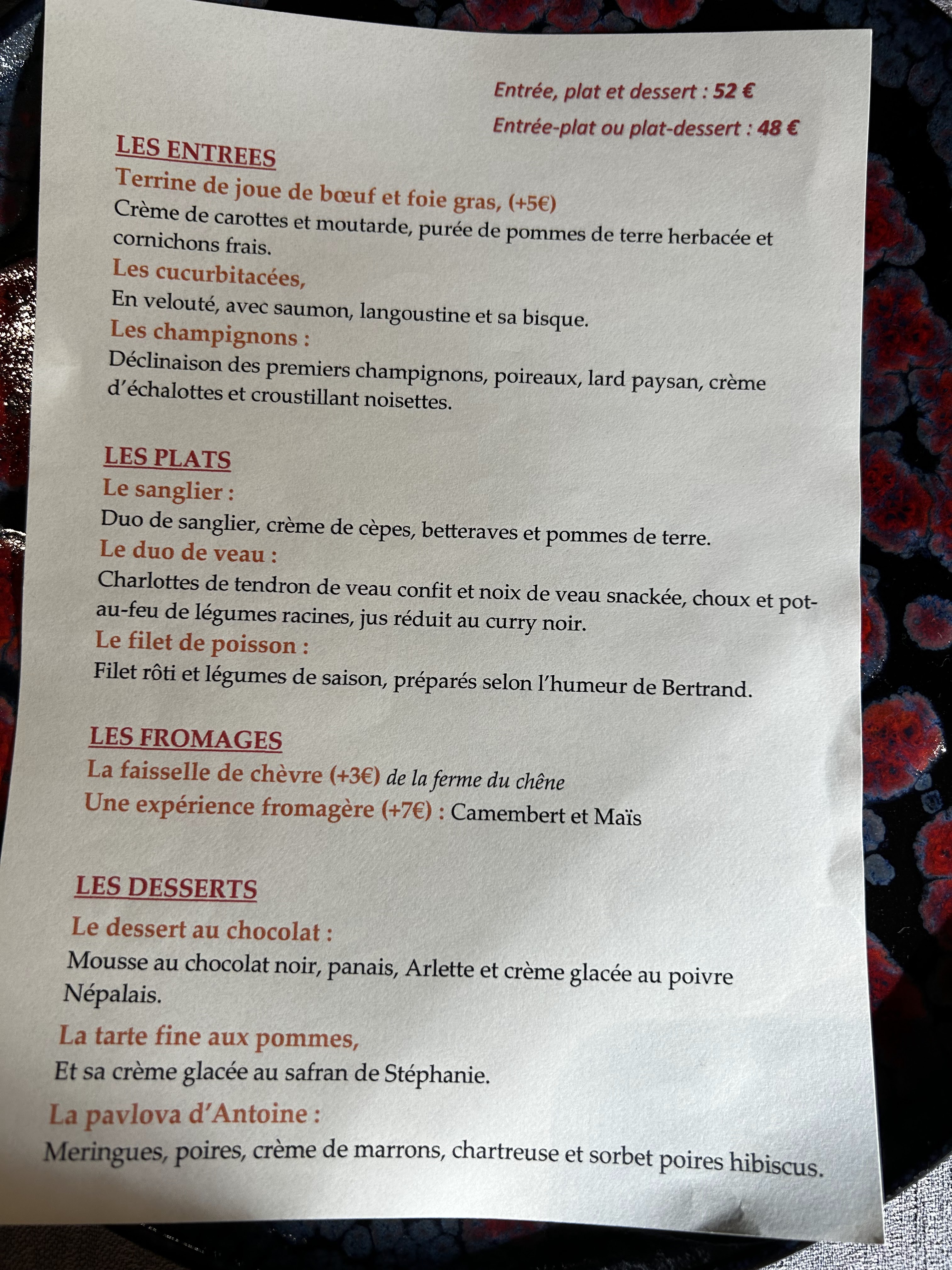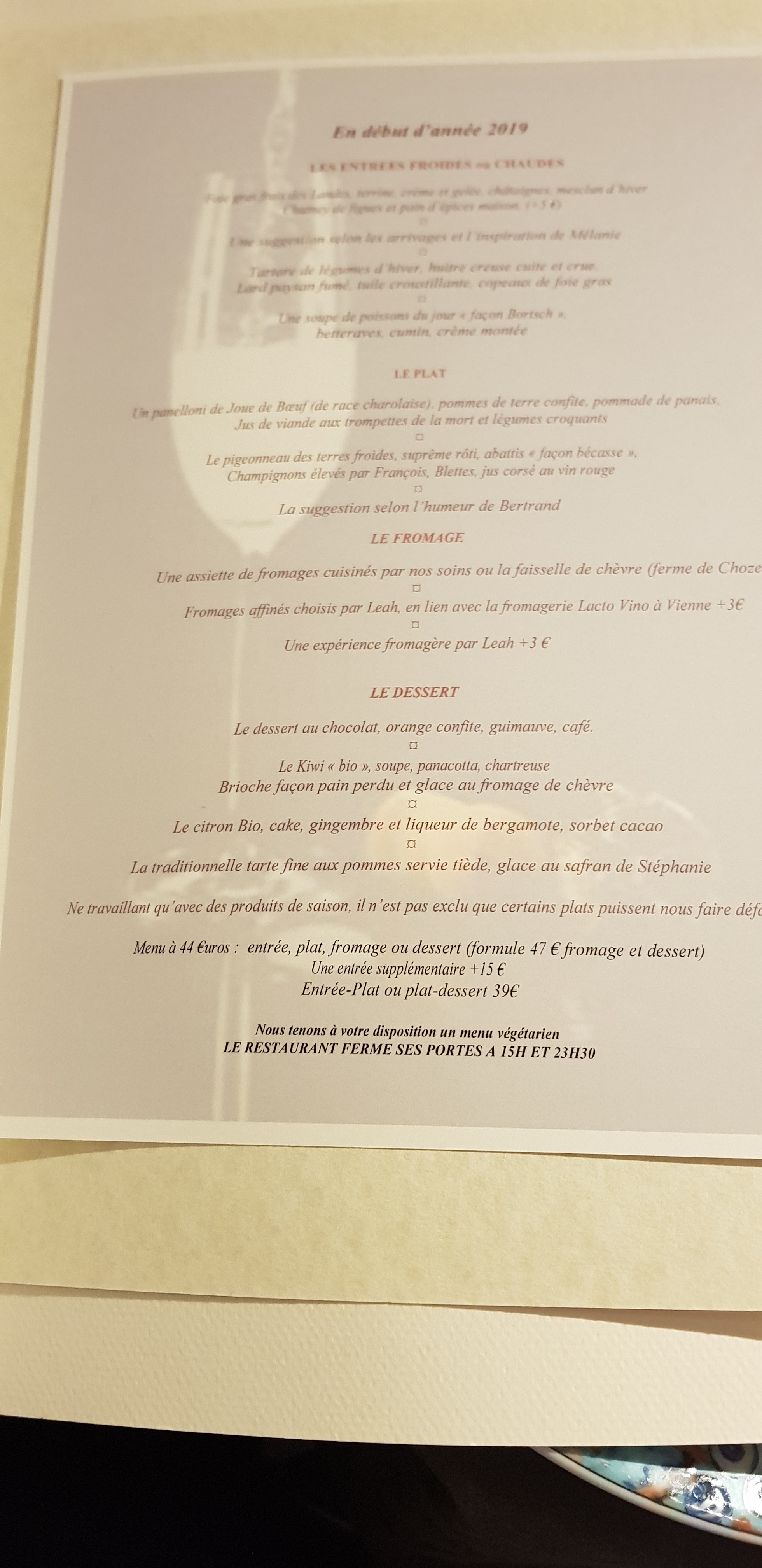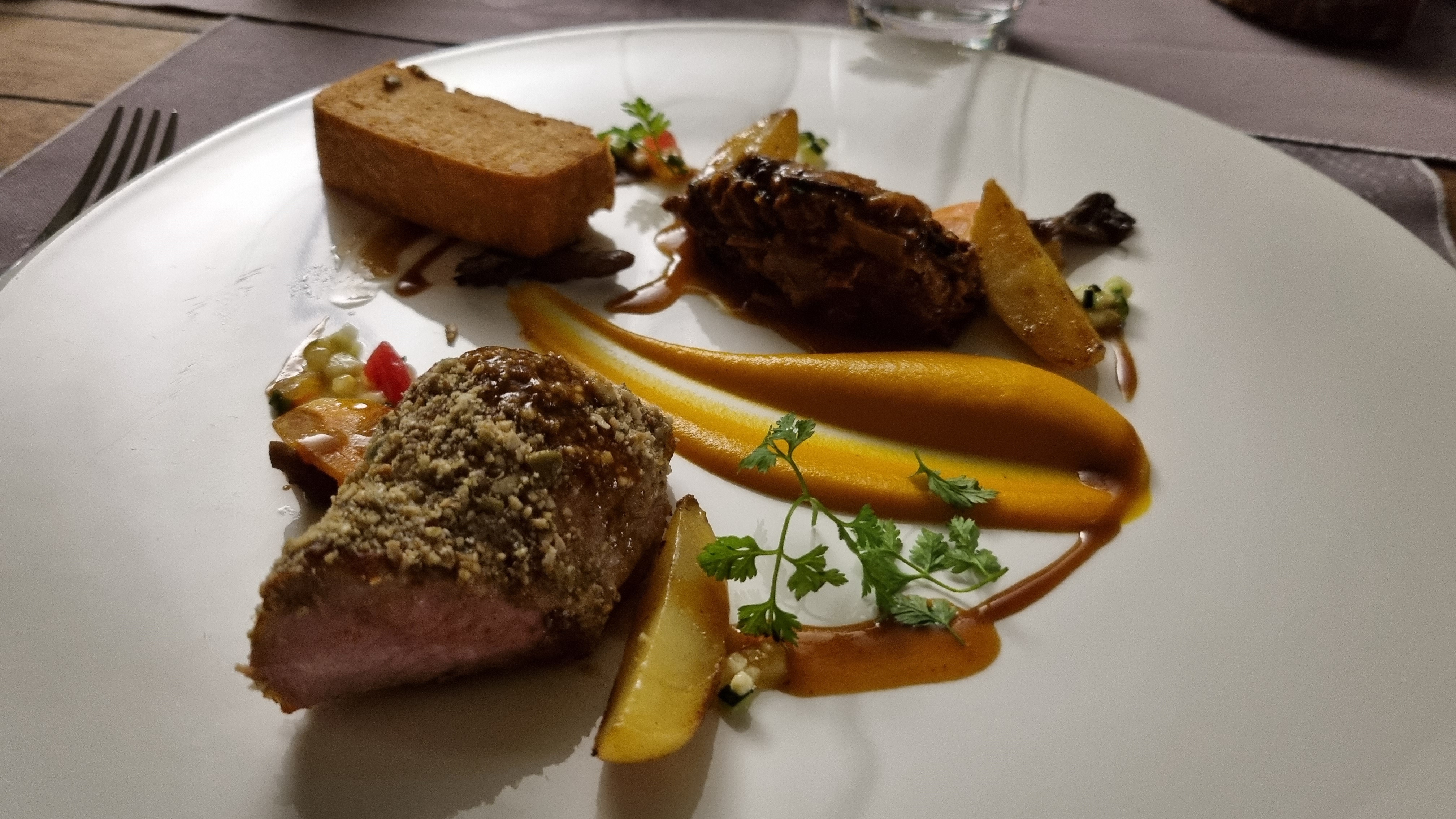 Menu en 3 plats à 49€. Service attentif et discret (attention à ne pas cumuler le nombre de serveurs). Pâté en croûte abouti et équilibré, graphisme de l'assiette travaillé, un fondant / civet de sanglier et son velouté aux cèpes très bien exécuté, choix des fromages et des vins (Je souligne l'excellent vin rouge bio de Loire) réfléchi. Dommage que la tarte aux pommes ne soit pas à la hauteur : un visuel fébrile. Je recommande cette belle adresse qui fait du bien dans ces terres froides où on peut manquer de recherches et travaux gastronomiques.