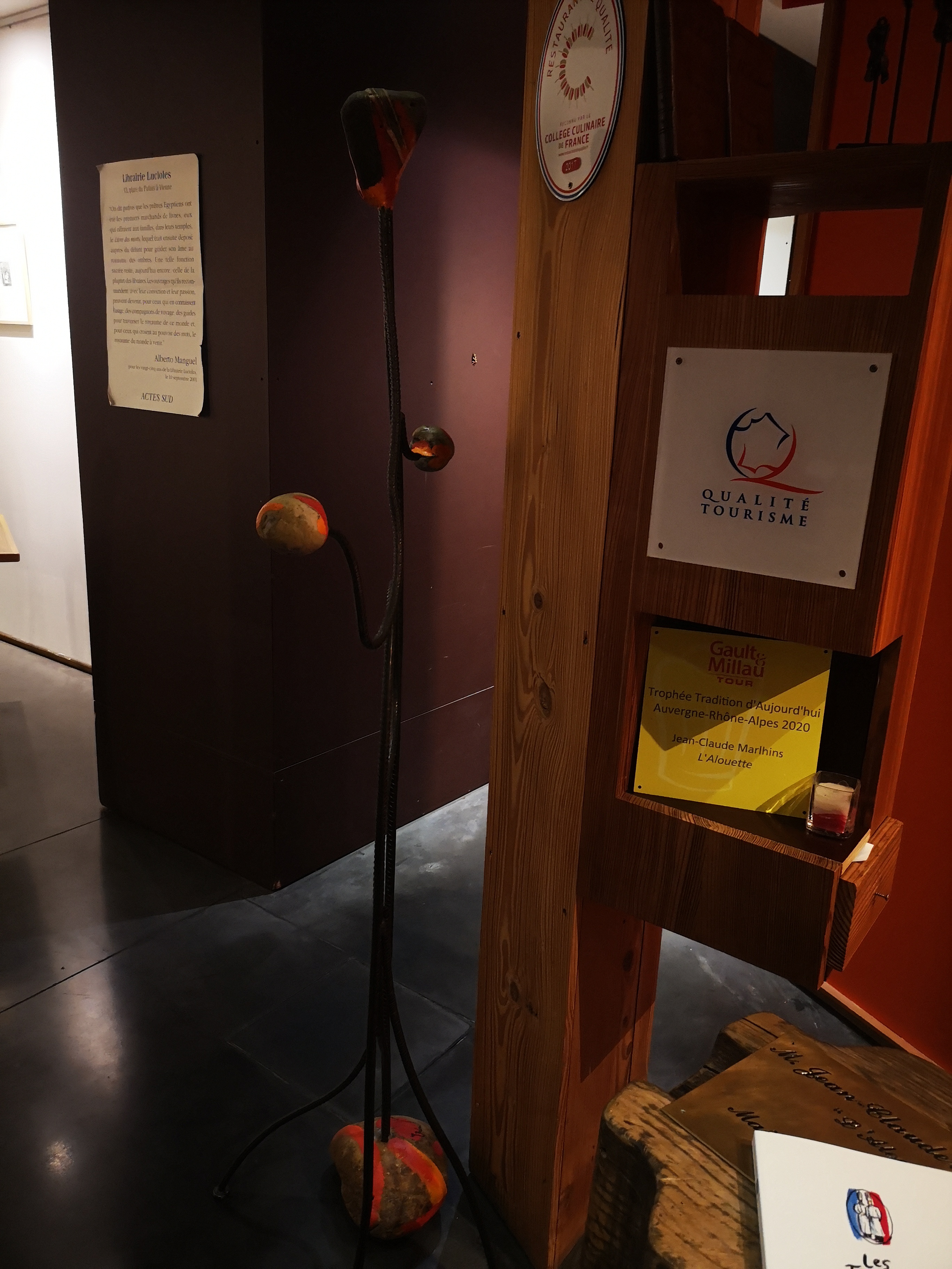 Pour nos 12ans de mariage on est retourné à L'Alouette.Le décors de la salle ressemble bcp au assiettes artistiques du chef Jean-Claude Marlhins, je ne vous parlerai pas d'une assiette de cochon de lait revisité par ces soins juste sublime. Sa cave est tjrs aussi bien fourni. Je m'arrêterai sur une recherche collégiale entre lui et son fromagé de Vienne pour nous avoir trouvé un fromage moyenâgeux La Feuille de Dreux et moi je dirai La Feuille des Dieux je ne peux vous en dire plus venez la déguster,l'extase pour un amateur de fromage.