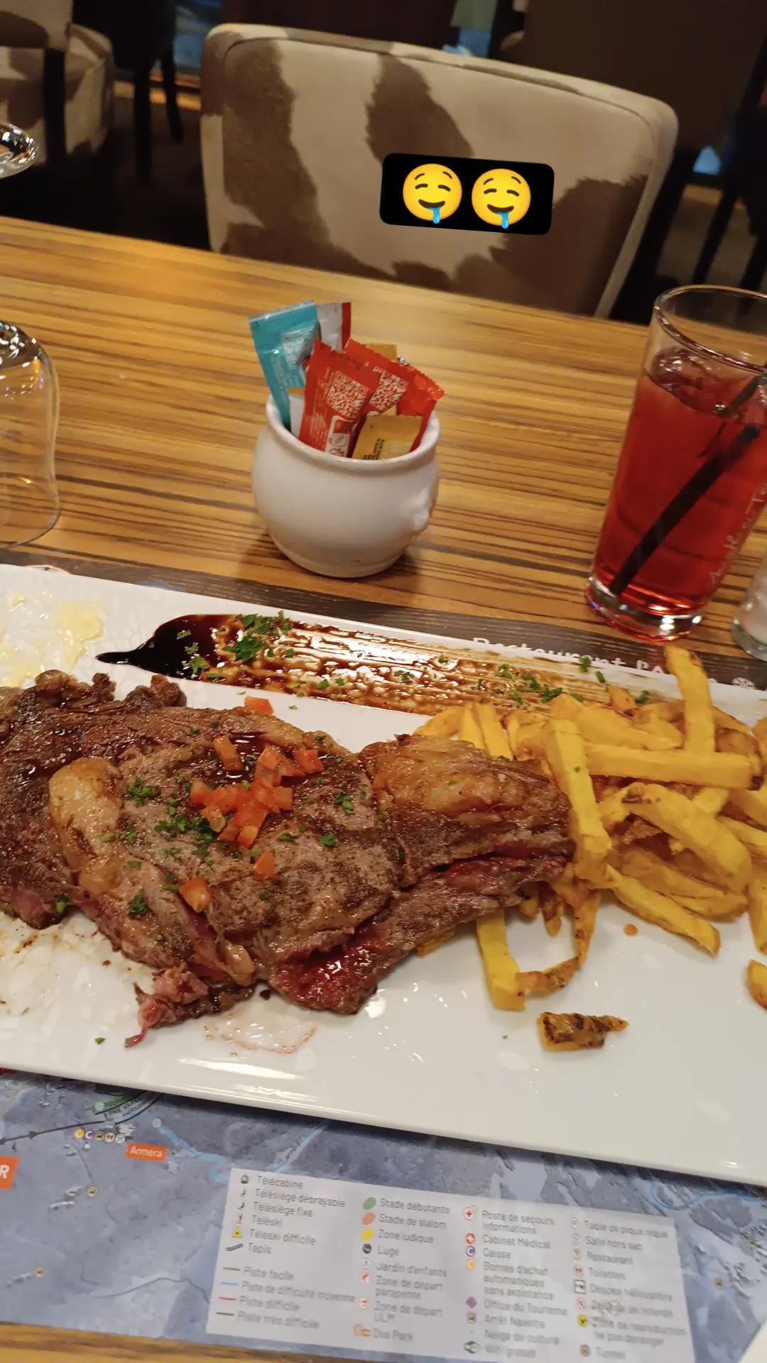 Le service et la courtoisie sont immédiatement perceptibles, tout comme l'excellent emplacement à côté des pistes. Le personnel parle également anglais, ce qui est vraiment appréciable et utile. Excellente viande, étant également un Steakhouse, même chose en ce qui concerne les plats typiquement français. L'attention portée aux détails dans le placage et l'intérieur est remarquable. Les desserts sont également passionnants