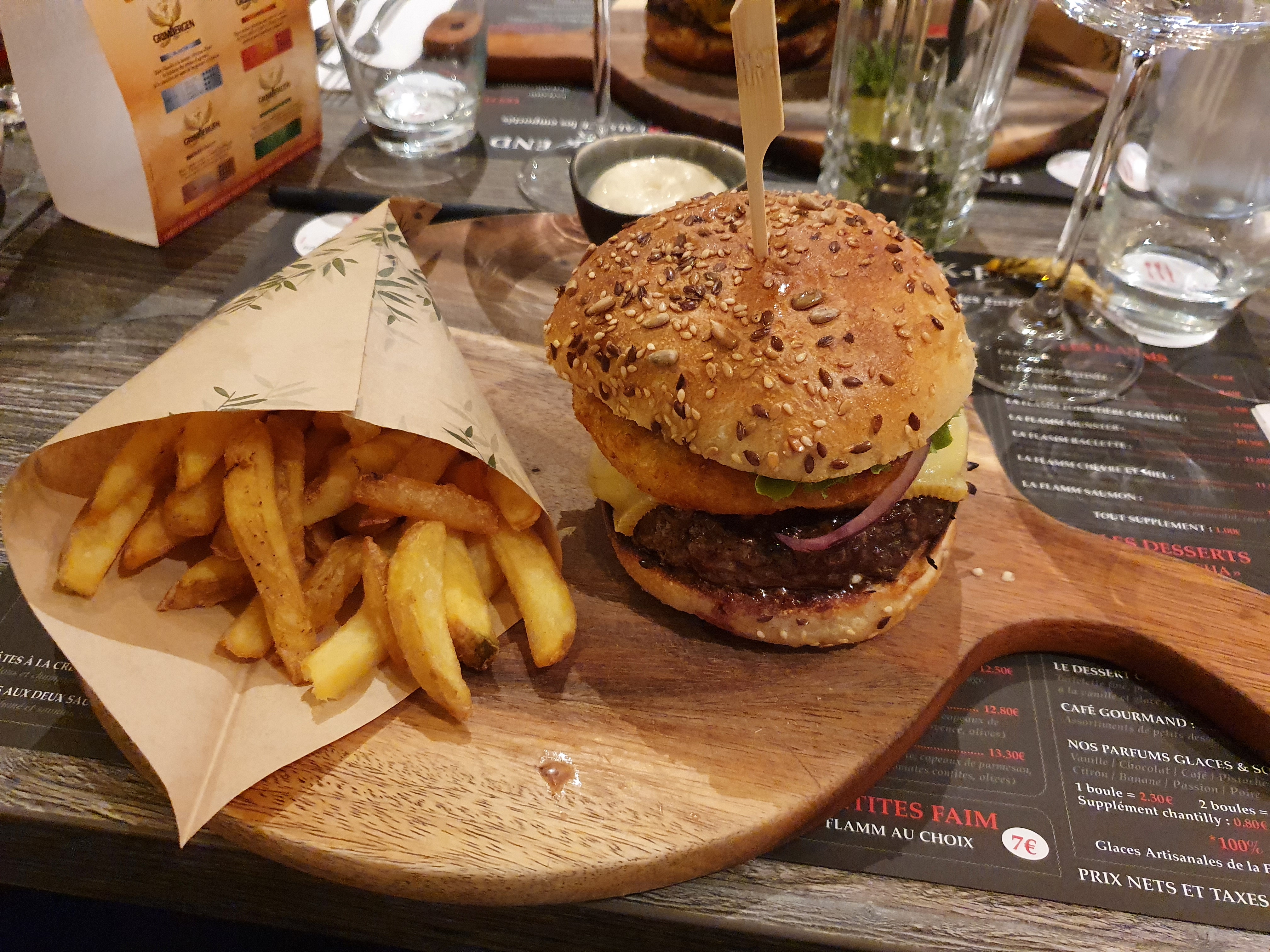 On à pris à emporter Leurs excellent hamburgers !! Franchement Rapport qualité prix c'est top On en a largement pour son argent 💰 Et la qualité vin diou rien à redire si ce n'est continué comme ça