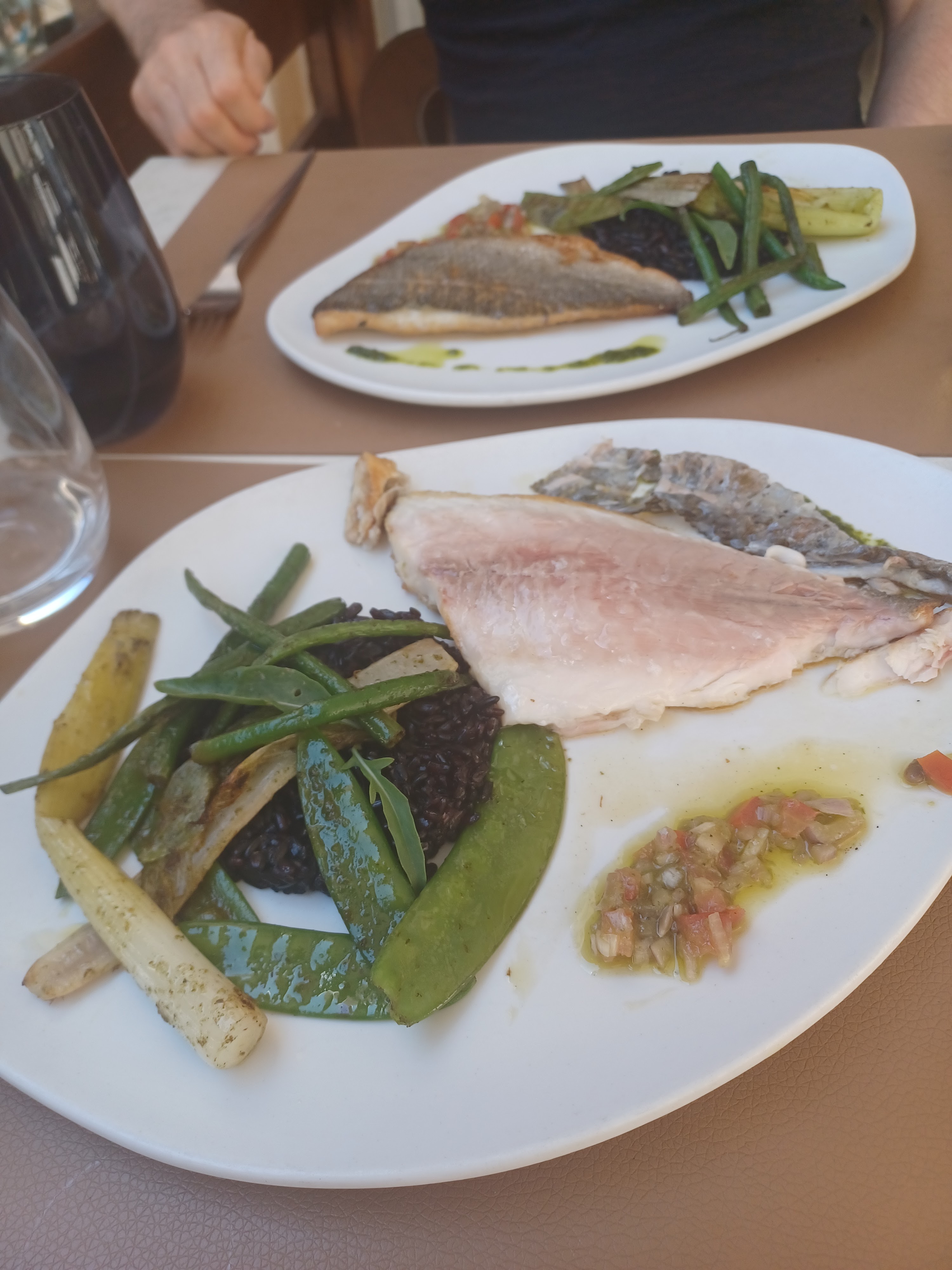 Un plat de pâtes très bon et un plat de poisson un peu simple avec une dorade trop cuite. Un peu déçu