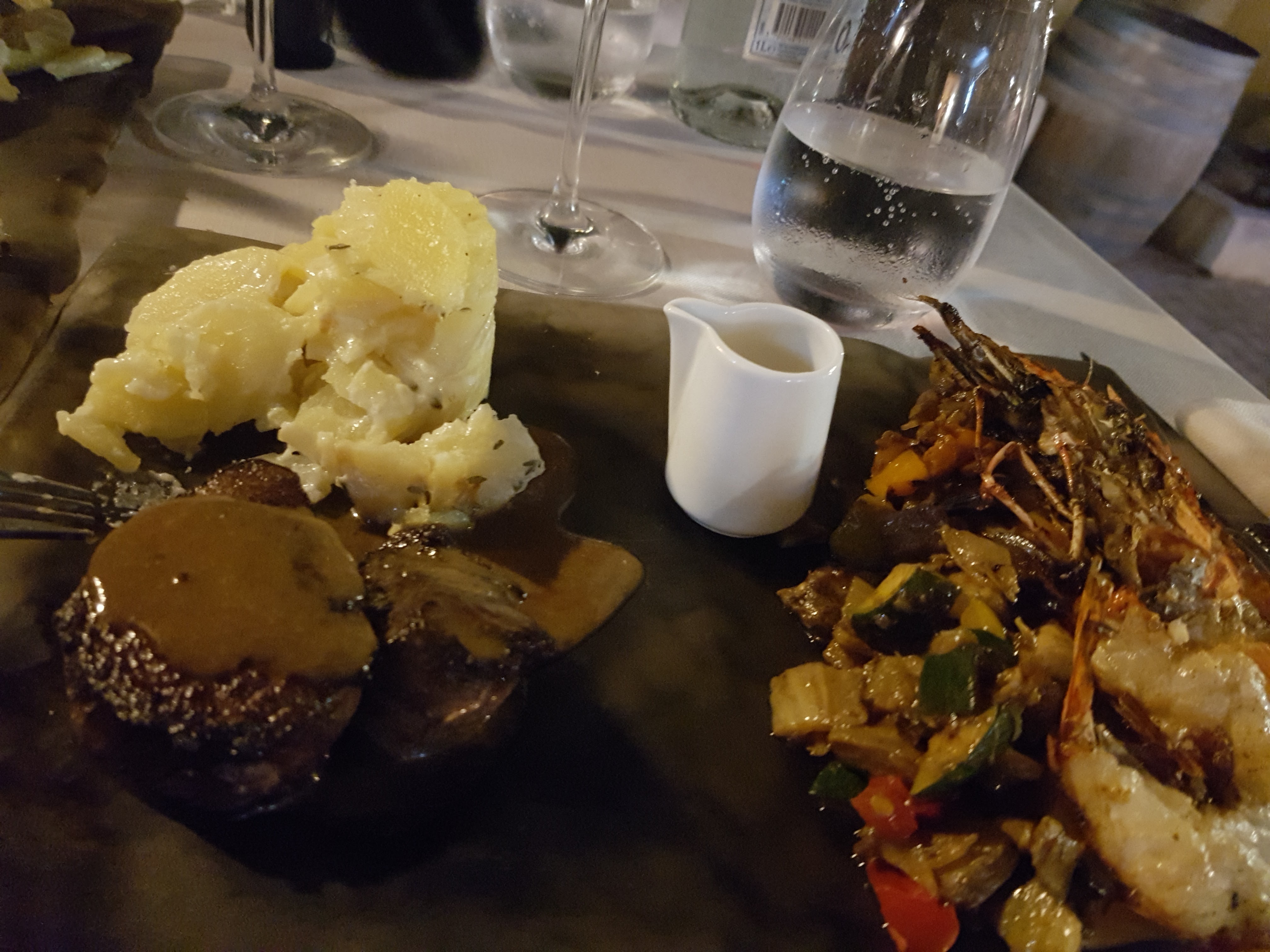 Pas d’apéro contrairement à nos voisins mieux lotis, 20min à attendre une carafe d’eau. Elle arrivera finalement avec. La plats en même temps que notre Oreza. Petit cafouillage avec notre commande mais passons cela arrive. Mon trio façon bouillabaisse, je cherche encore la rouille et l’aïoli… soupe de poisson deux croûton bref un Michelin vraiment ?