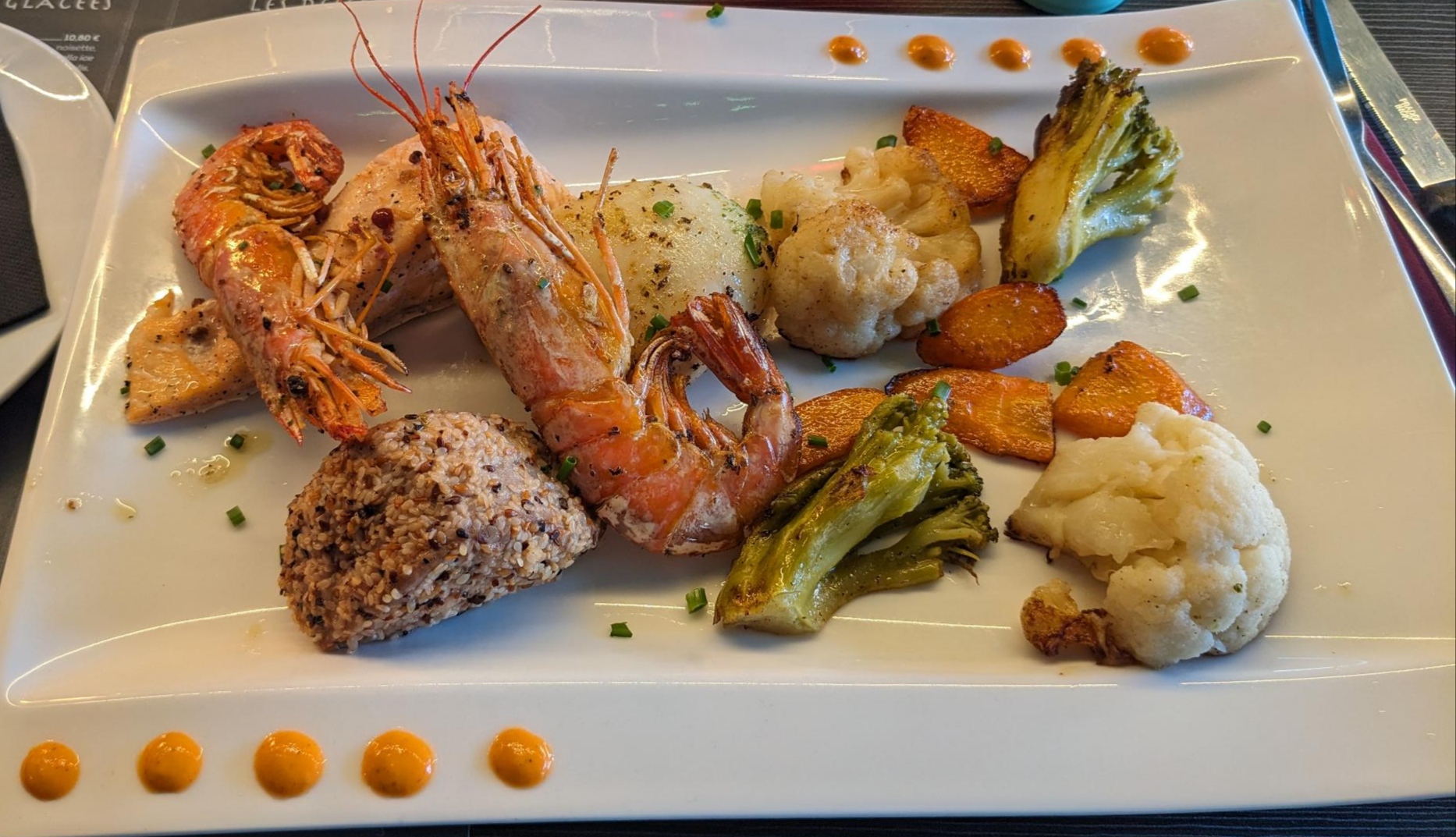 Restaurant à éviter, 1h d attente pour l entrée et pour le plat une grenaille coupe en 2 en guise de légumes pour accompagner ma rouille de seiches. Une serveuse sympathique et prête à aller en cuisine vous préparer un accompagnement autre que 1 grenaille.