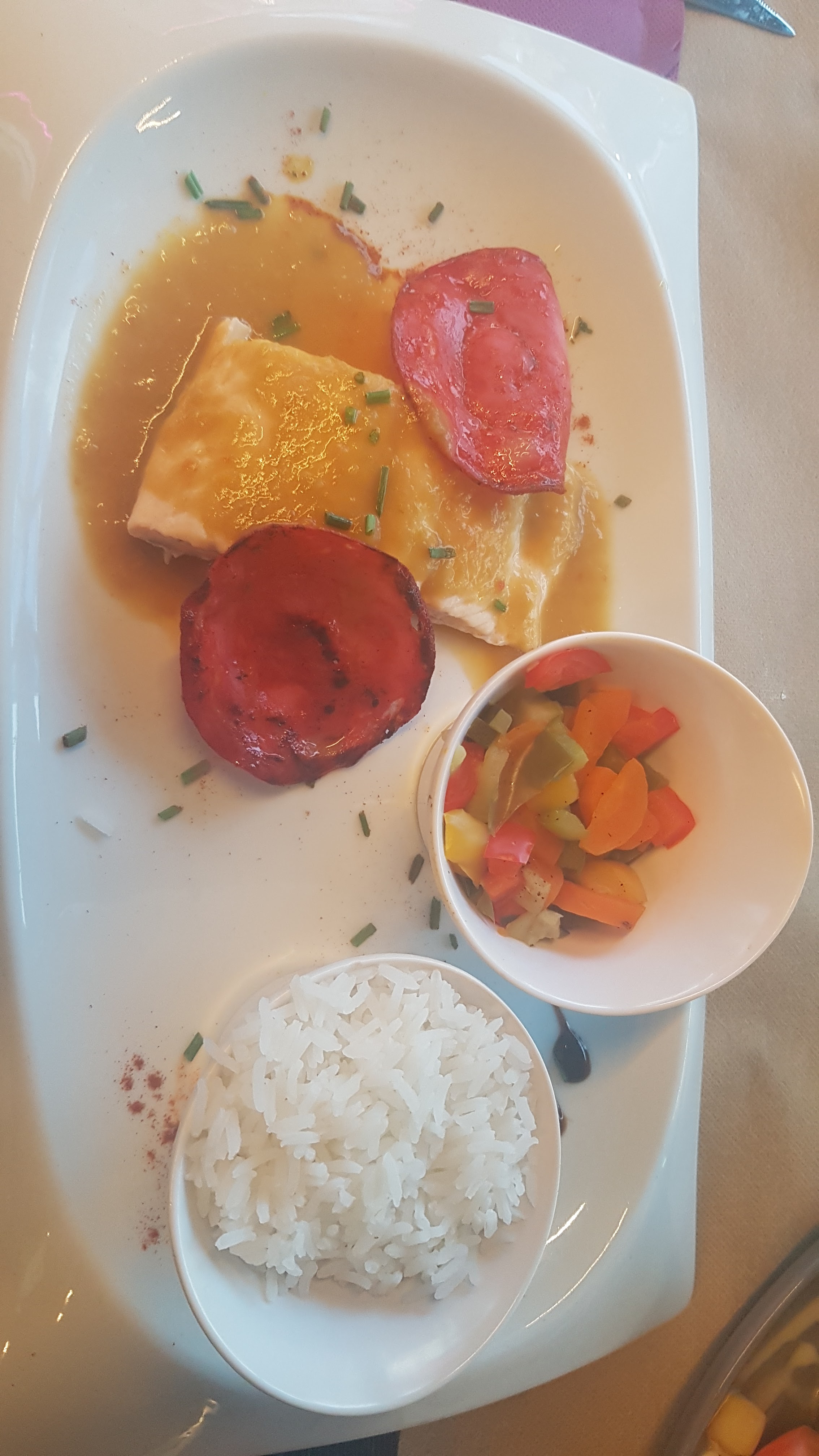 Repas plutôt correct dans l’ensemble pour le prix… mais avoir des morceaux de plastiques dans son assiette ne fait pas très professionnel. Des morceaux de plastiques fondus étaient présents sous mon plat de lasagne, pas très appétissant. Pas sûr que Philippe Etchebest approuve la présentation 😉