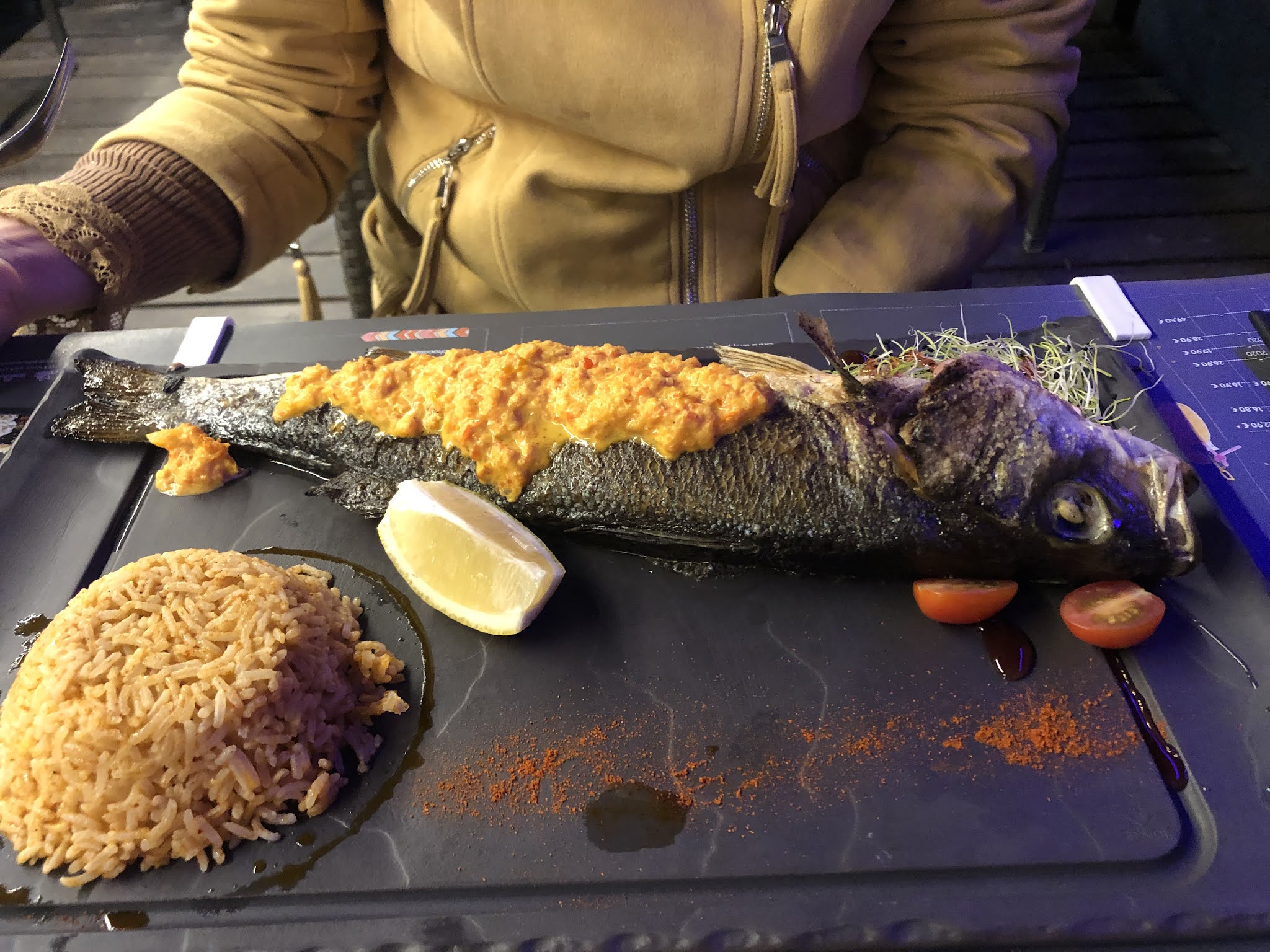 Menu à 24€ avec un pavet de saumon ! MINI pavet vraiment mini sans gout et tres gras, le riz sec et sans gout. La soupe de poisson est trop forte. La meilleure, un cafard est venu manger avec nous 😣😣 Plus jamais !