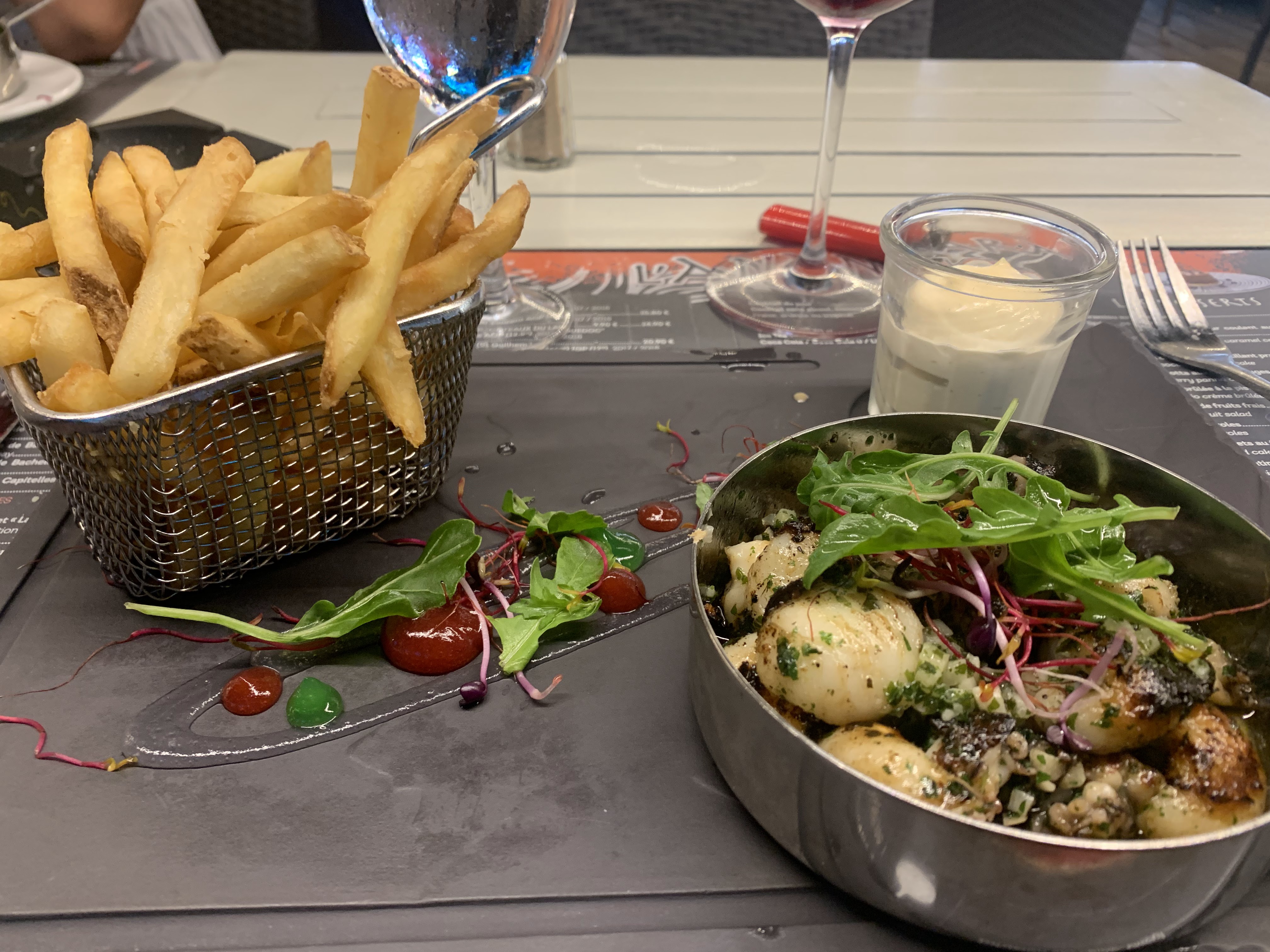 Serveuse perdue, il se sont trompés sur les boissons, j’avais demandé des moules au roquefort sont arrivées sans roquefort, mon conjoint lui as eu une sauce qu’il n’a pas demandé et lui on prise au milieu du repas , le saumon de ma sœur n’était pas cuit ! Nous n’étions pas les seuls clients dans se cas là toutes les tables autour de nous on renvoyé au moins un plat ! Le camanbert rôti était très bon , les moules aussi mais pas assez de sauce roquefort. La serveuse n’a pas sut nous répondre si les desserts étaient fait maison et n’est pas aller se renseigner!