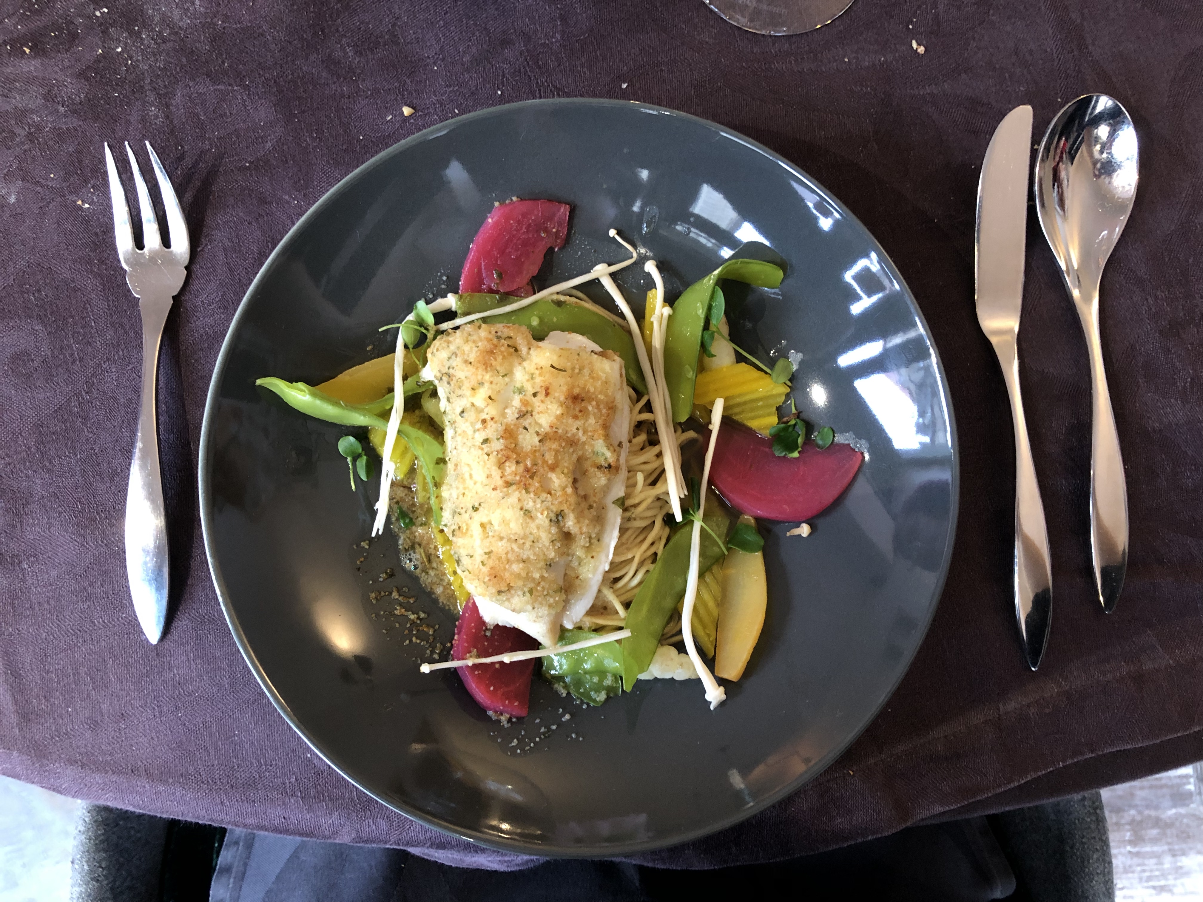 Belles assiettes et cadre très agréable. Plat et entrée au poisson très bien. Dessert un peu petit mais bon aussi. Un plat végétarien à la carte aurait été appréciable tout de même.
