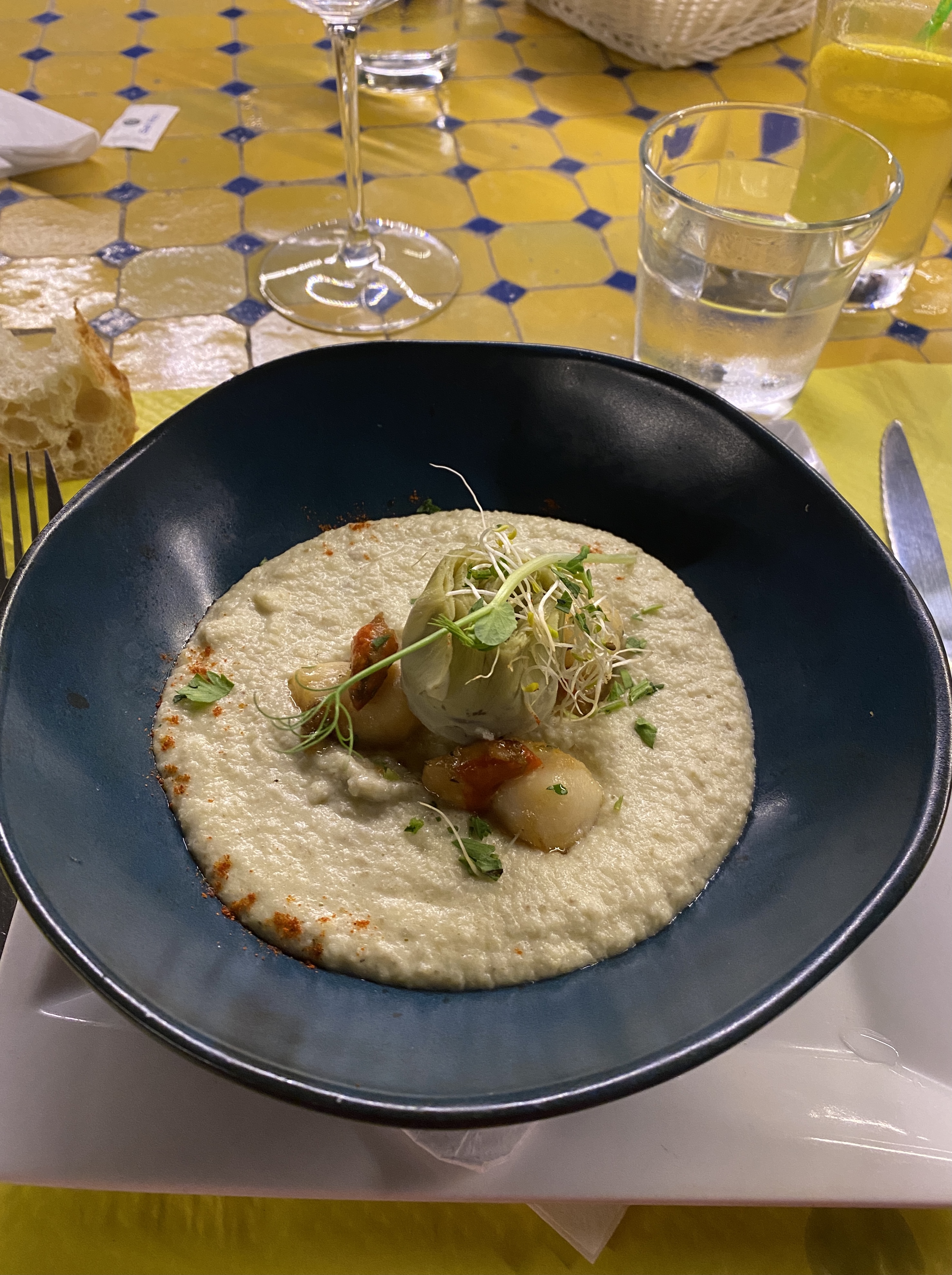 J'ai été déçue de ne pas pouvoir accéder à l'ensemble de la carte affichée sur le site du restaurant. Je crois bien que c'est la 1ère fois que je vois ce fonctionnement et il n'était aucunement mentionné sur le site. Nous avions repéré des plats au préalable (heureusement ma mère a pu mangé son plat d'agneau, je note le geste 🙂) mais je n'ai pas pu avoir le foie gras ou un autre dessert. Malgré cette déception du départ, les plats sont bons (mis à part la crique un peu trop épaisse donc moins cuite à l'intérieur), le serveur est très professionnel et le cadre agréable.