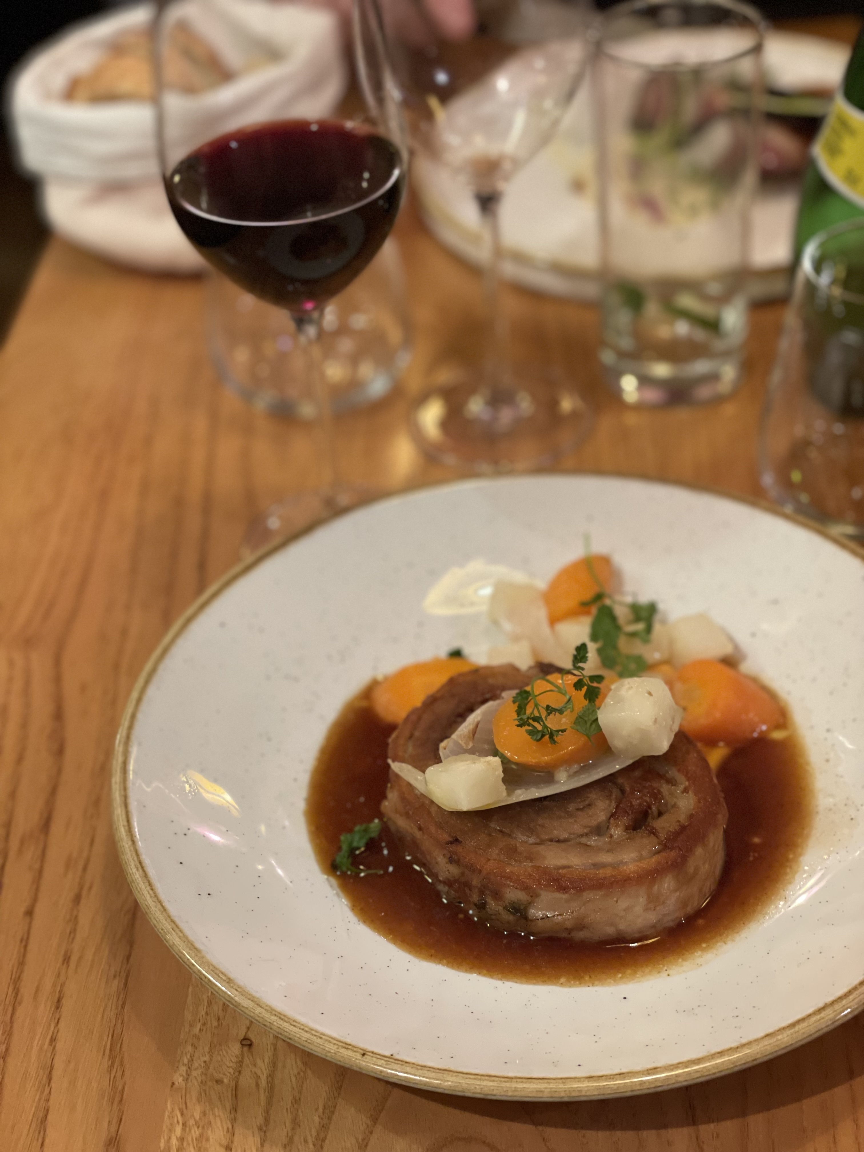 Un peu déçu par le carpaccio d'espadon. Le cochon est très bon. Le soufflé génial. Le service est parfait et le personnel très aimable. Une assiette de fromage offerte pour l'attente du dessert, ça fait toujours plaisir