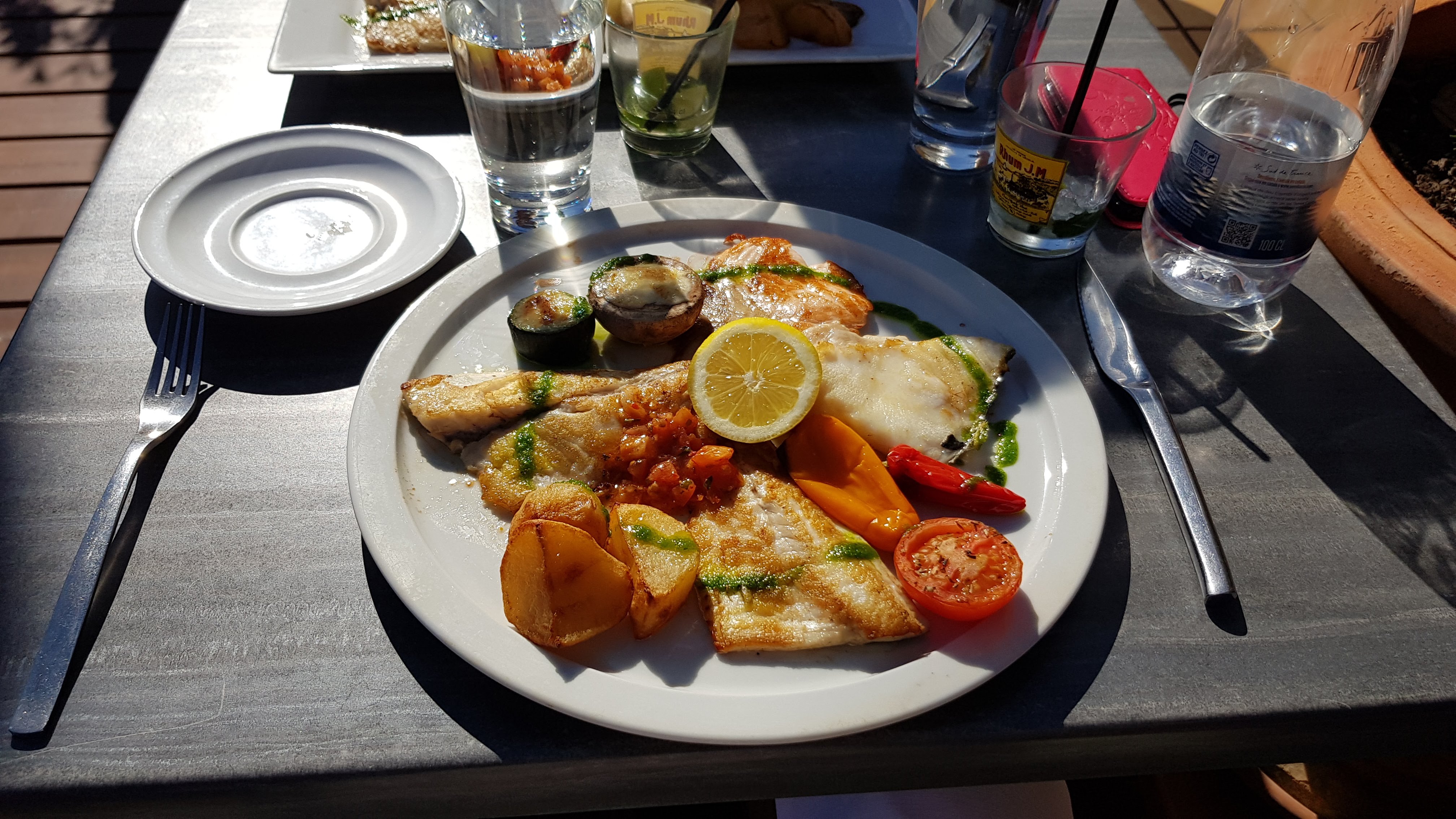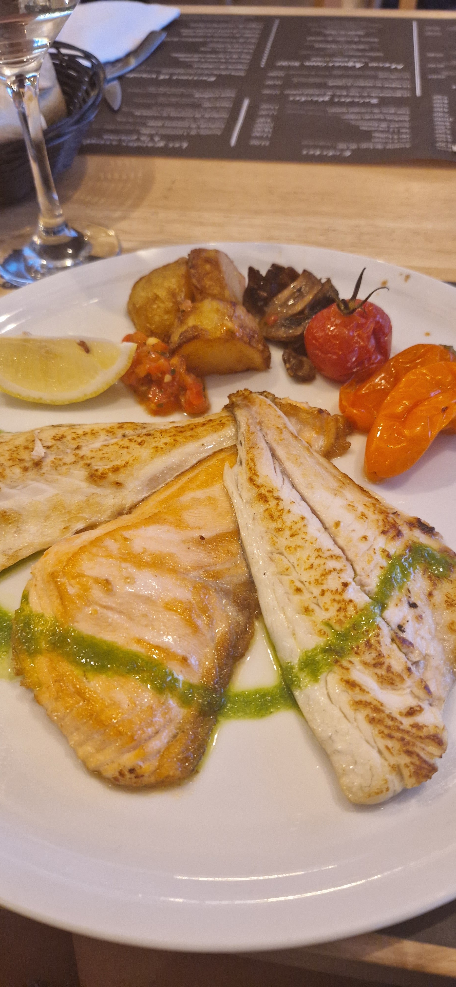 Nous avions pris une assiette avec 4 poissons différents, cuits parfaitement. L'assiette était très copieuse et très bonne. Nous avons bien été accueillis et tout le repas s'est très bien déroulé. Nous étions dans la salle intérieure, très bien décorée et ambiance sympa. Je recommande!!!