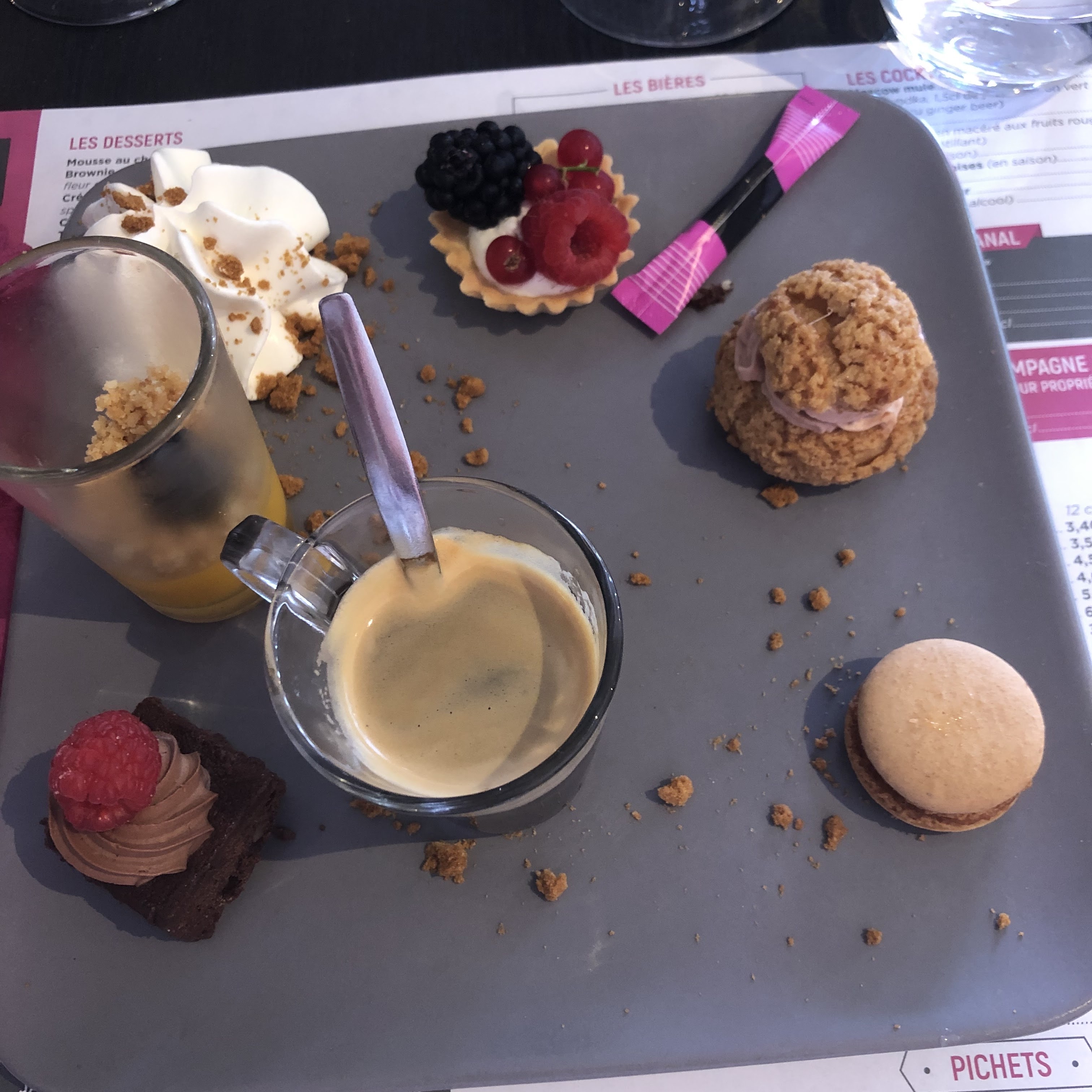 Il y a plusieurs palts au choix(burger, moules frites, filet de boeuf, assiette de fruit de mer...) Et les desserts sont succulent avec une belle présentation.