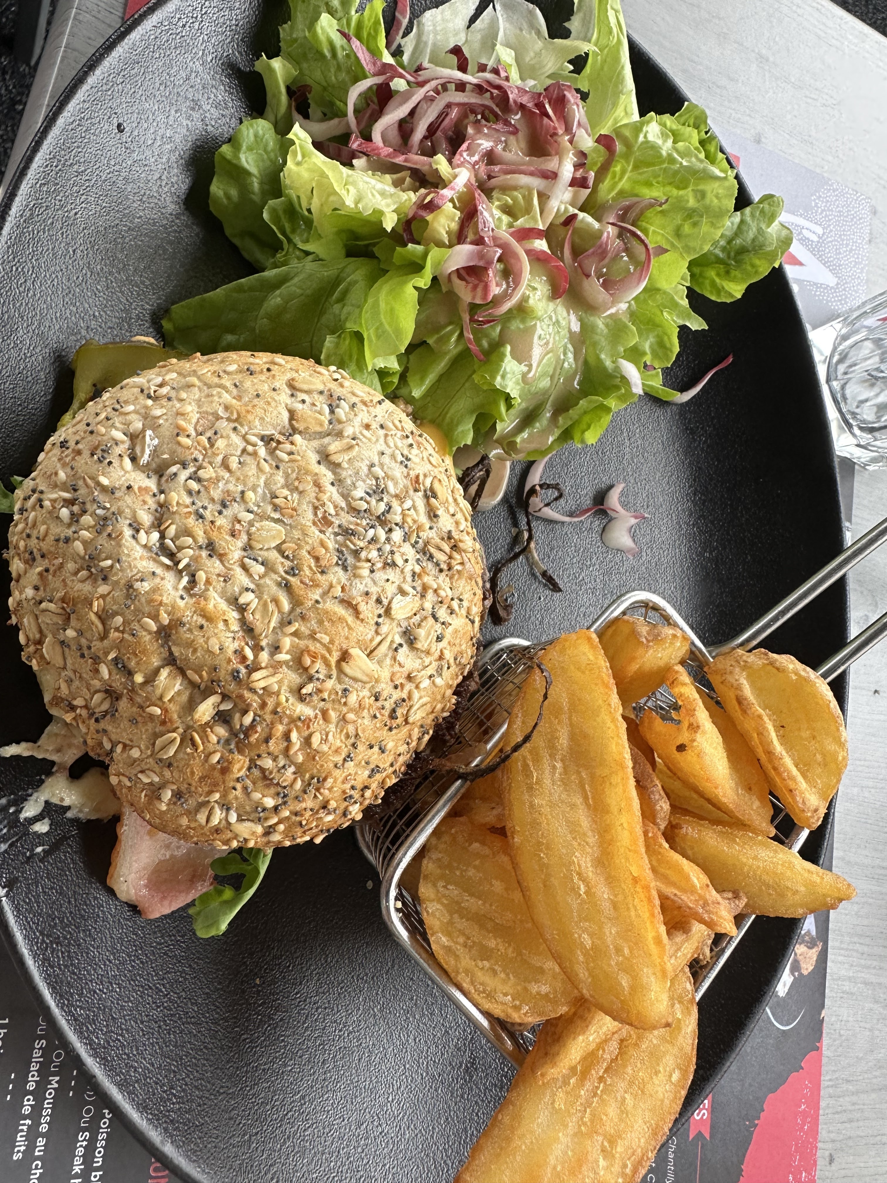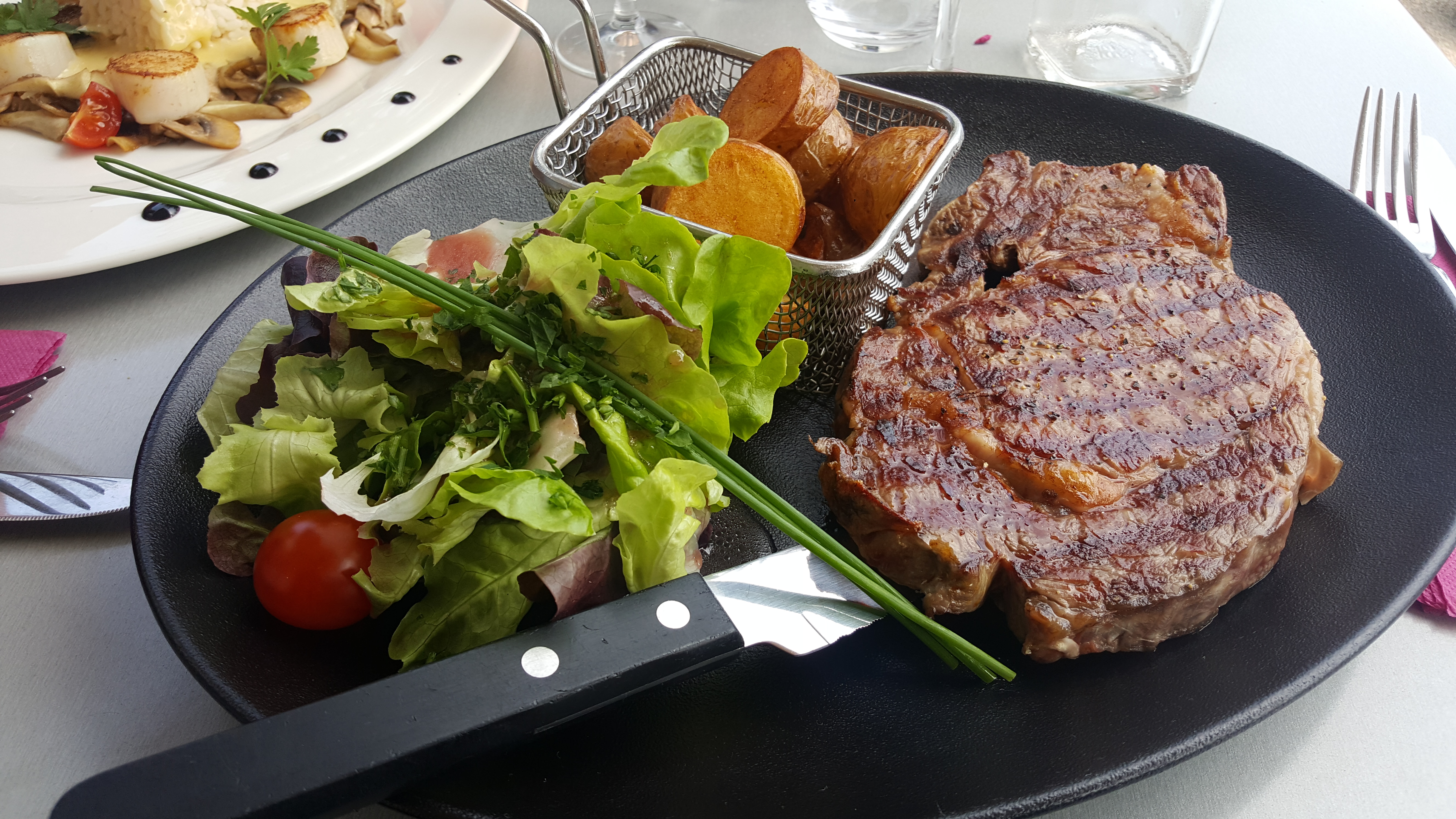 Les pâtes aux fruits de mer à l'encre de seiche, l'assiette de fruits de mer mélangée et le steak étaient incroyables, très savoureux. J'ai mangé ici quelques-unes des meilleures frites de France… croustillantes ! Le hamburger avait un peu trop de sauce donc les petits pains étaient un peu détrempés. J'essaierais le burger de poisson la prochaine fois. Quelqu'un avait ça sur une autre table et ça a l'air délicieux. L'emplacement était juste à côté du port avec une vue magnifique. Recommande fortement!