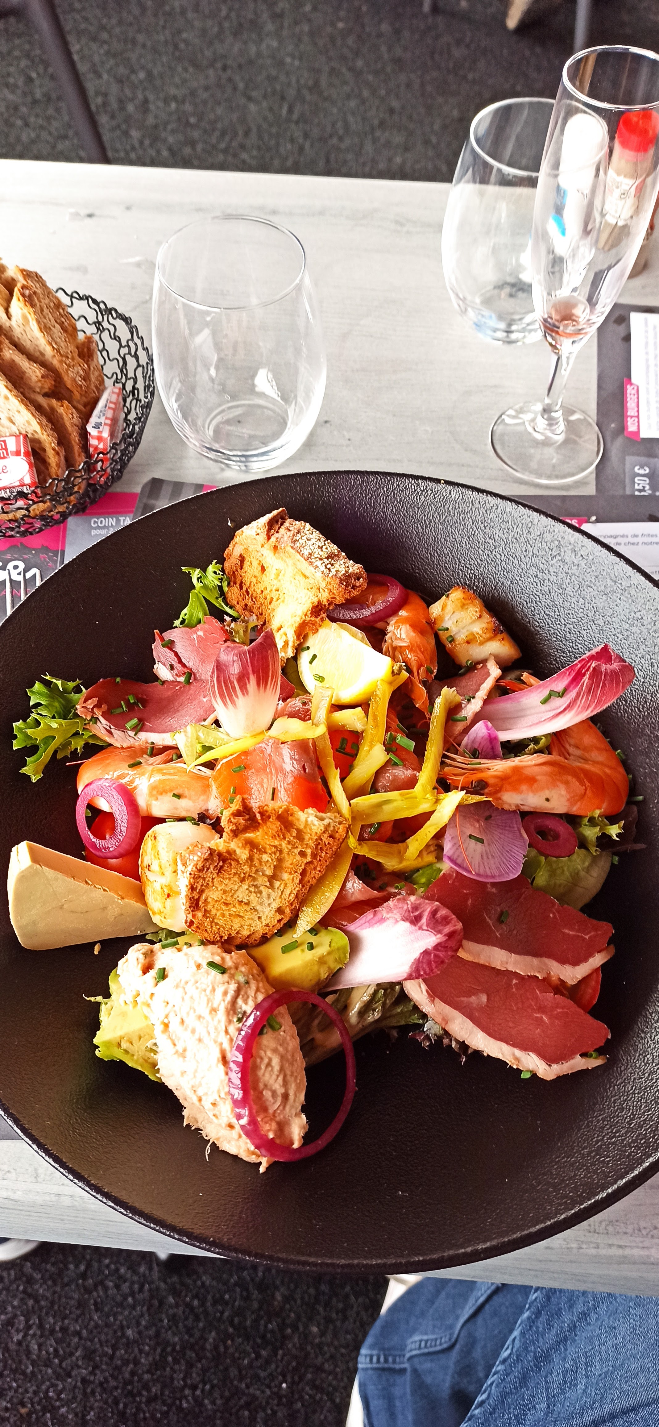 Nous avons tester une salade Gourmande . Pour une entrée cela passe , mais pas pour un plat principal. C'est minuscule et très peu de salade cachée sous de gros morceaux de pain grillés. très déçu ..... Vraiment cher pour une salade ( plat principal ).