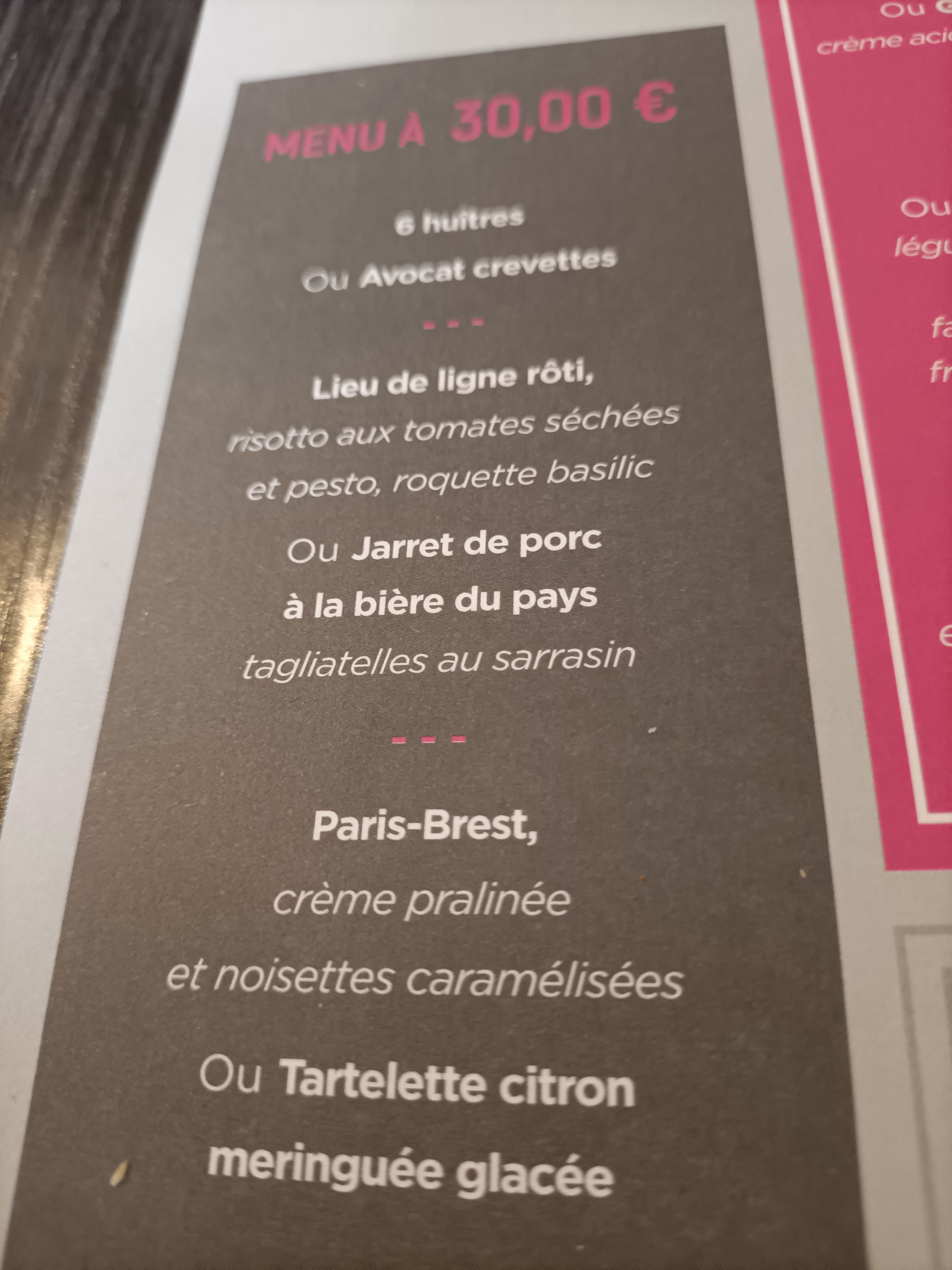 Ne vous fiez pas à la carte touffue car les plat du menu à 35 euro sont excellents. Bon rapport qualité prix . Je recommande