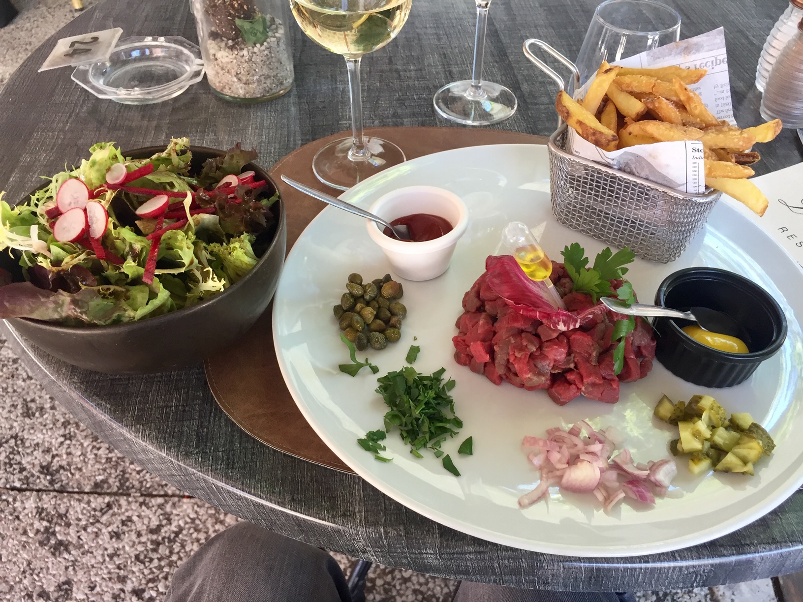 un déjeuner en septembre. Un steak tartare au couteau superbe de goût et de tendreté, un régal que je conseille pour sa qualité et son originalité. J'ai moins aimé le tiramisu pêche verveine que j'ai trouvé parfaitement travaillé, frais et gourmand de consistance, mais sans parfum ; ou sont la pêche et la verveine ???