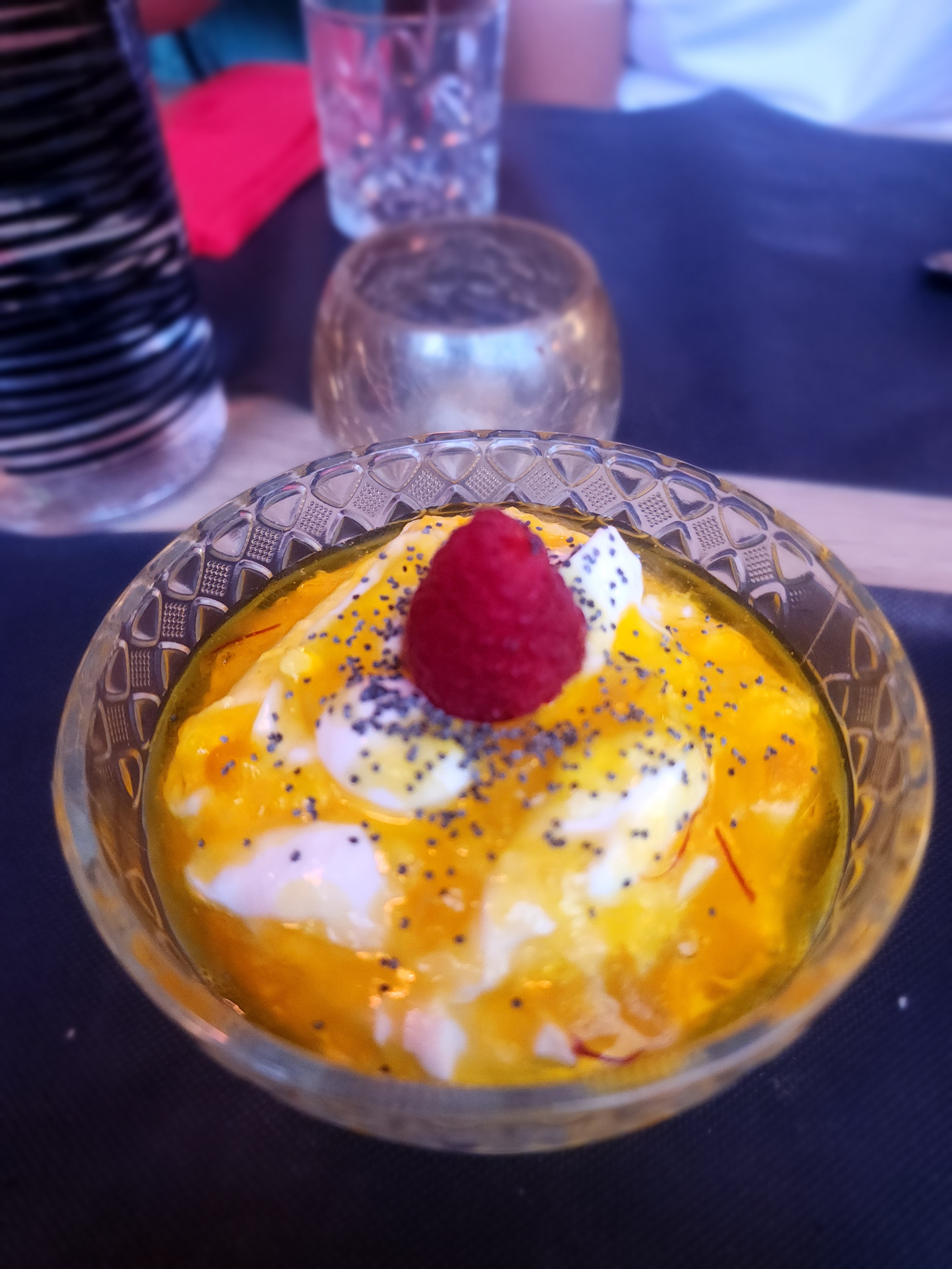 Excellent en tout Très bon accueil Soupe à tomber, épicée juste comme il le faut Plat plein de saveurs Crème à la cardamome très légère et savoureuse Tellement bon que un peu plus de quantité pour le plat aurait été avec plaisir