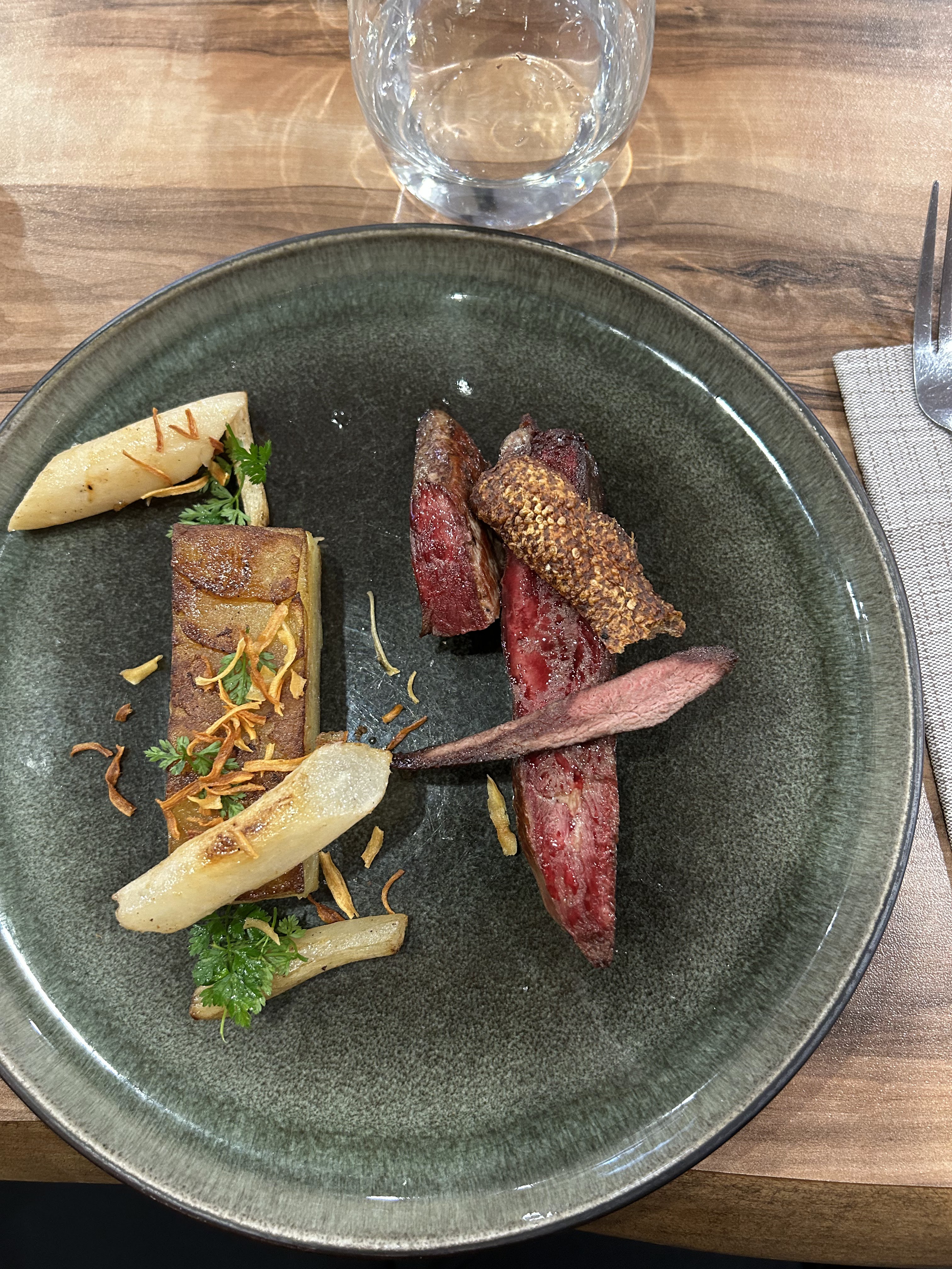 Un très bon moment pour déjeuner. Pas beaucoup de monde ce mardi midi. Les plats sont magnifiquement présentés et sont véritablement goûtus. J'ai regretté que ce soit un peu trop salé à mon goût mais d'un autre côté j'ai pris du gibier et ceci explique cela. Le service est très pro et le chef sait ce qu'il sort de sa cuisine. Allez y les yeux fermés. Très pratique, un petit parking juste en face du restau