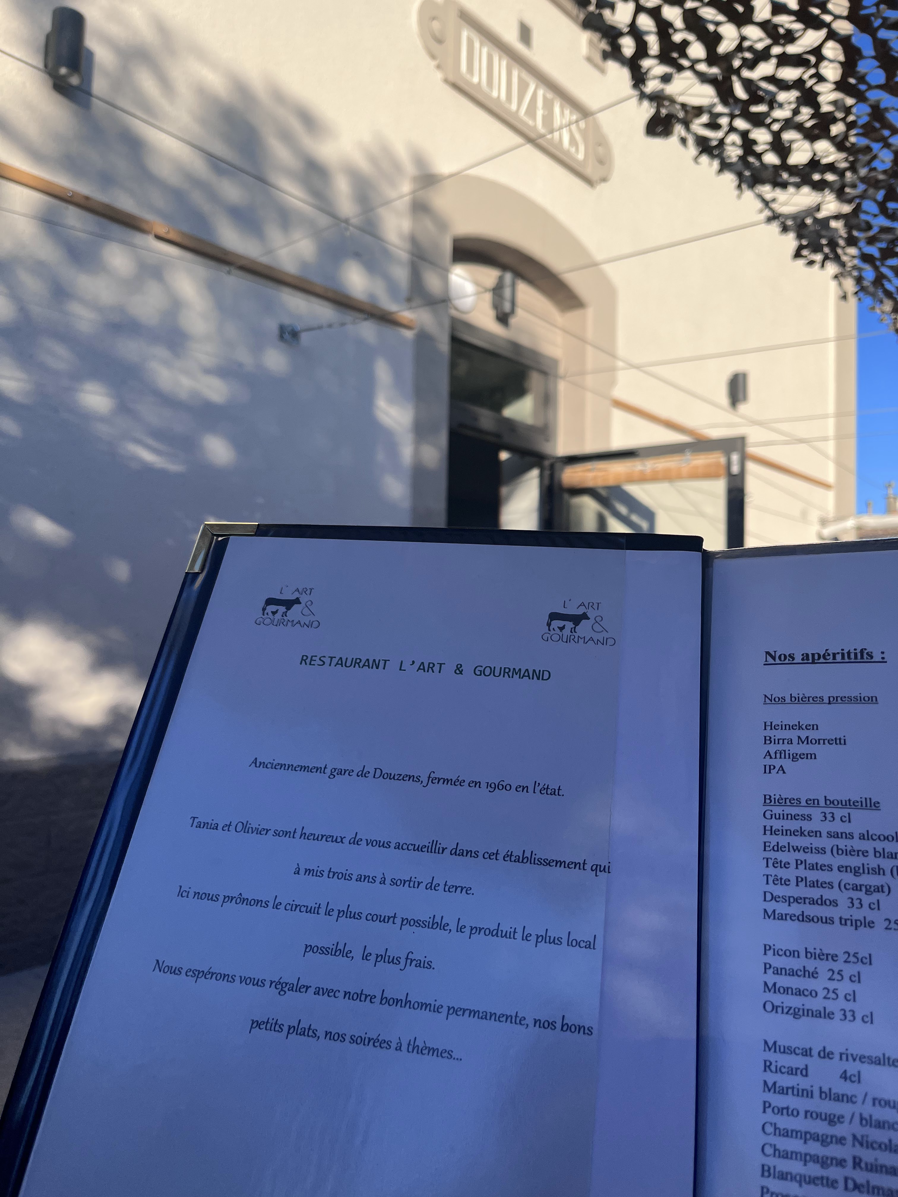 Une ancienne petite gare transformée avec charme, originalité en un lieu gastronomique et accueillant. Carte gourmande aux saveurs délicates et originales . Olivier Henri, le chef a ramené de ses voyages l’art de marier condiments et épices. Cannellonis d’asperges croquantes à souhait ,farcis au crabe, beurre d’oursin accompagnés d’une “favouille” ( bouillon de crabe) subtilement parfumée . Filets d’esturgeon aux fines saveurs de citron vert, crème d’encre de seiche, purée de tomates aromatisée et relevée, petits navets et carottes du jardin. J’ai découvert avec surprise le goût acidulé et poivré de la capucine, bourrache et autres fleurs!! Les produits sont d’origine locale, Olivier et Tania favorisant les circuits courts. L’accueil est chaleureux, sympathique et très cordial. La terrasse charmante … bref, que du bonheur !! Rendez-vous à Douzens à « L’art & Gourmand » !!